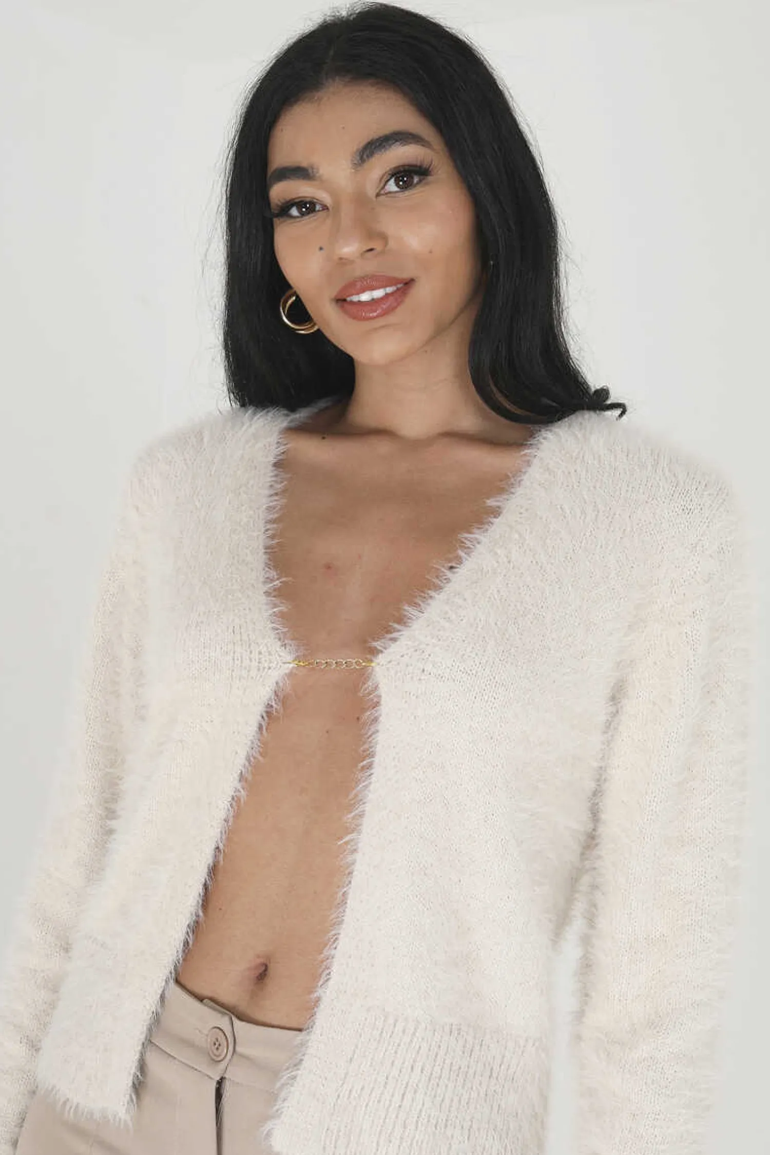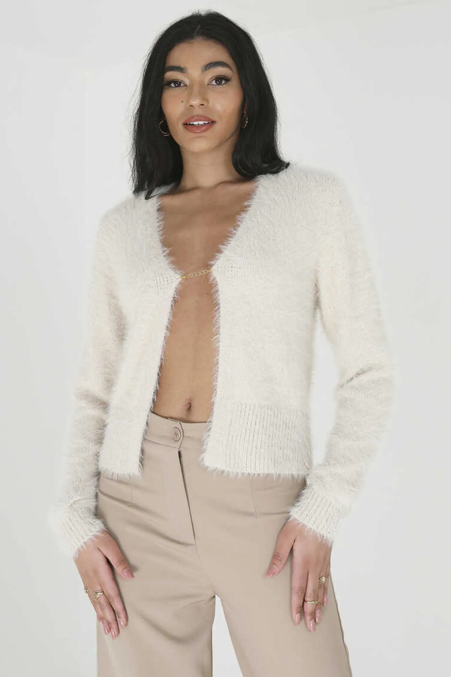 Casaco De Mulher De Pelo Sintetico. Com Fecho-Eclair. Gola Em Bico E Detalhe Canelado Na Bainha E Nos Punhos