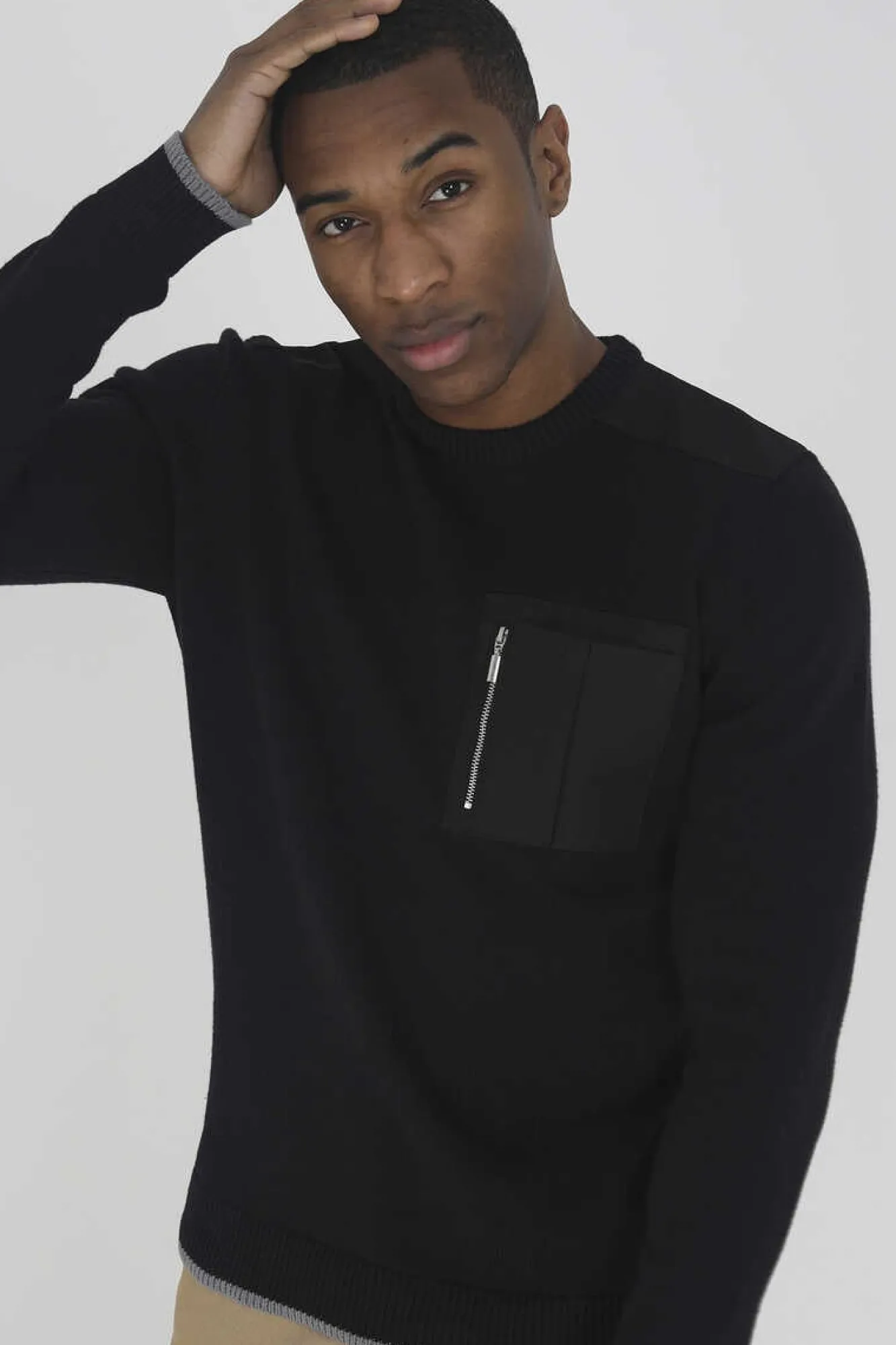 Camisola De Homem Com Remendo Nos Ombros E Bolso Com Fecho-Eclair No Peito. Gola Redonda. Tem Detalhe Canelado Na Gola, Bainha E Punhos.