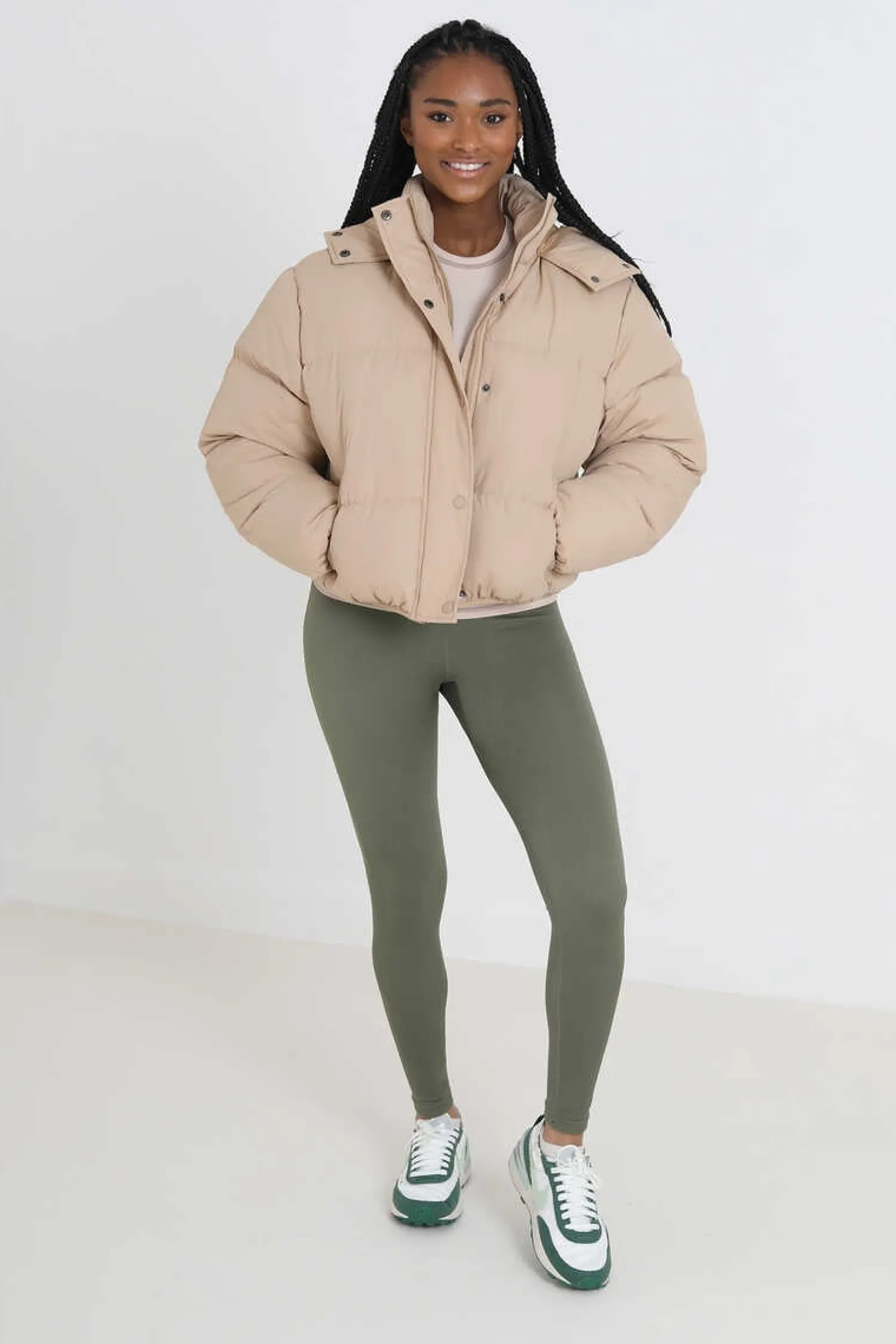 Casaco De Penas De Mulher Acolchoado, Curto, Oversize, Com Capuz E Bolsos. Fecho Mediante Fecho-Eclair E Botoes De Pressao
