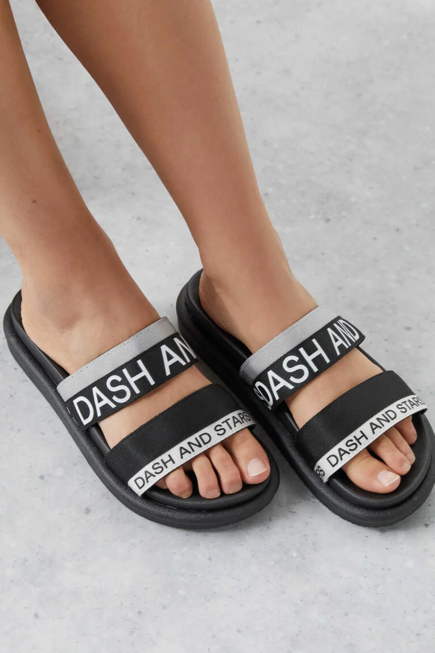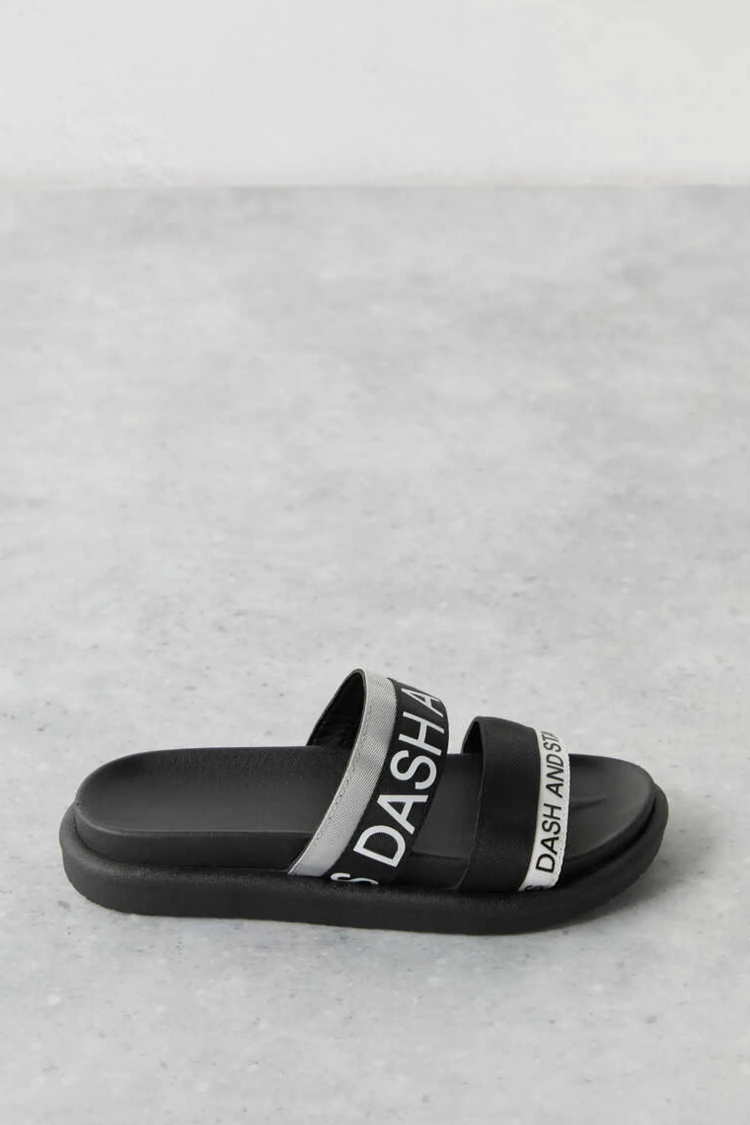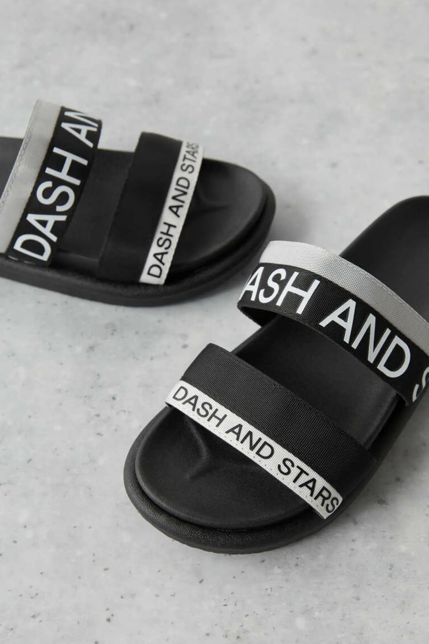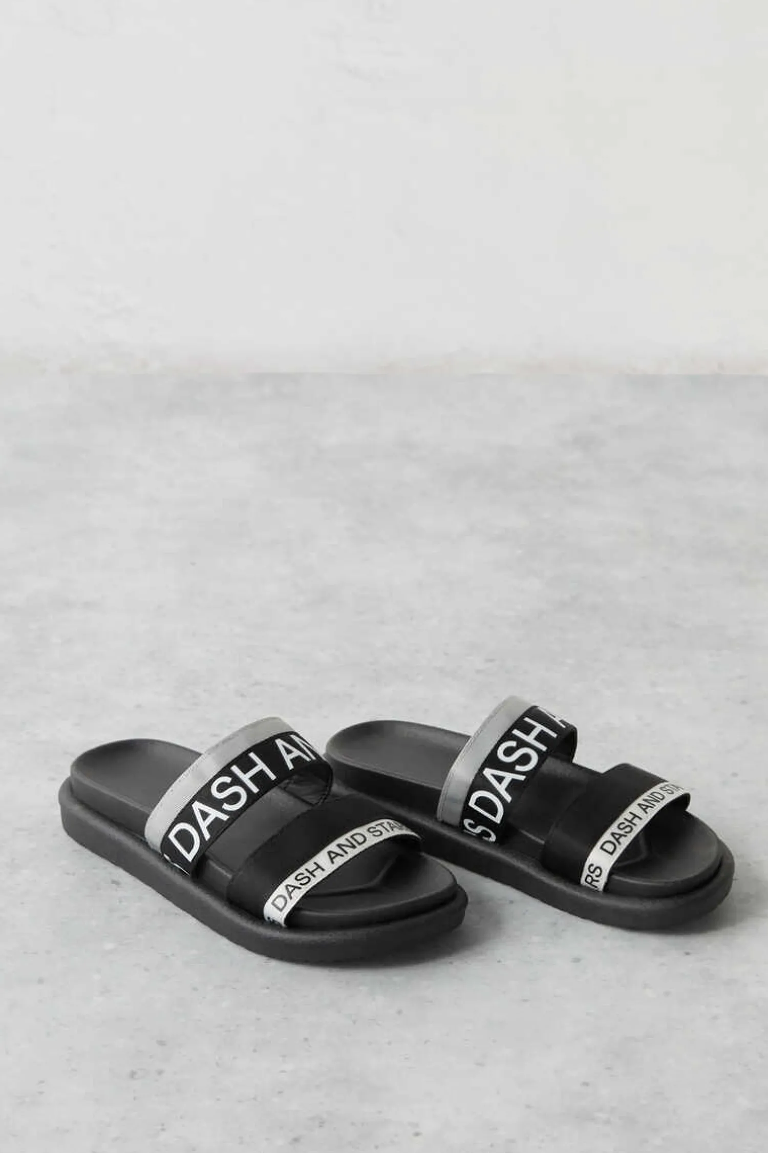 – Chinelos Com Dupla Tira Grossa De Cores Pretas E Cinzentas. Com Logo “Dash And Stars”, Estes Chinelos Sao O Ultimo Grito.