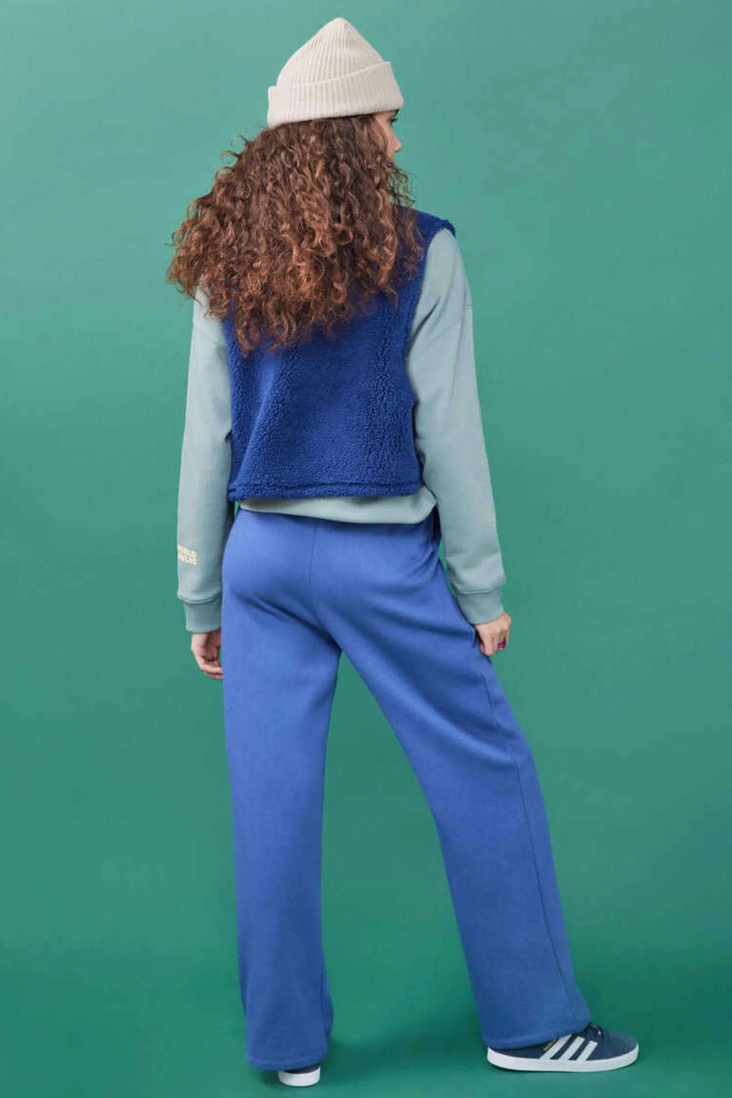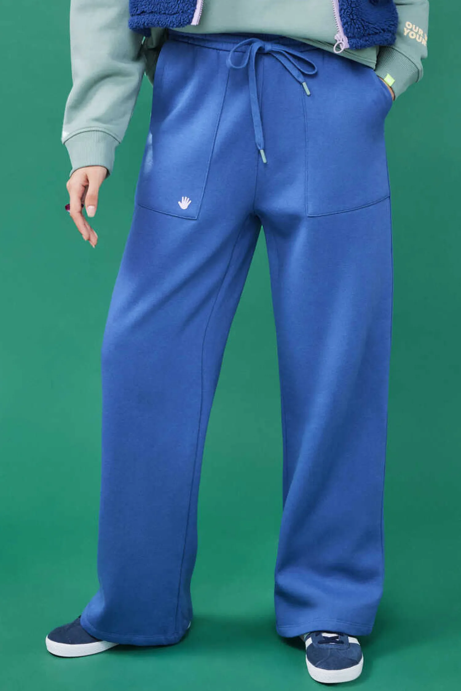 Calcas Tipo Flare Compridas De Felpa, Confecionadas Com Algodao, Com Bolsos Tipo Patch. De Cor Azul, Com Logo Posicionado No Bolso.