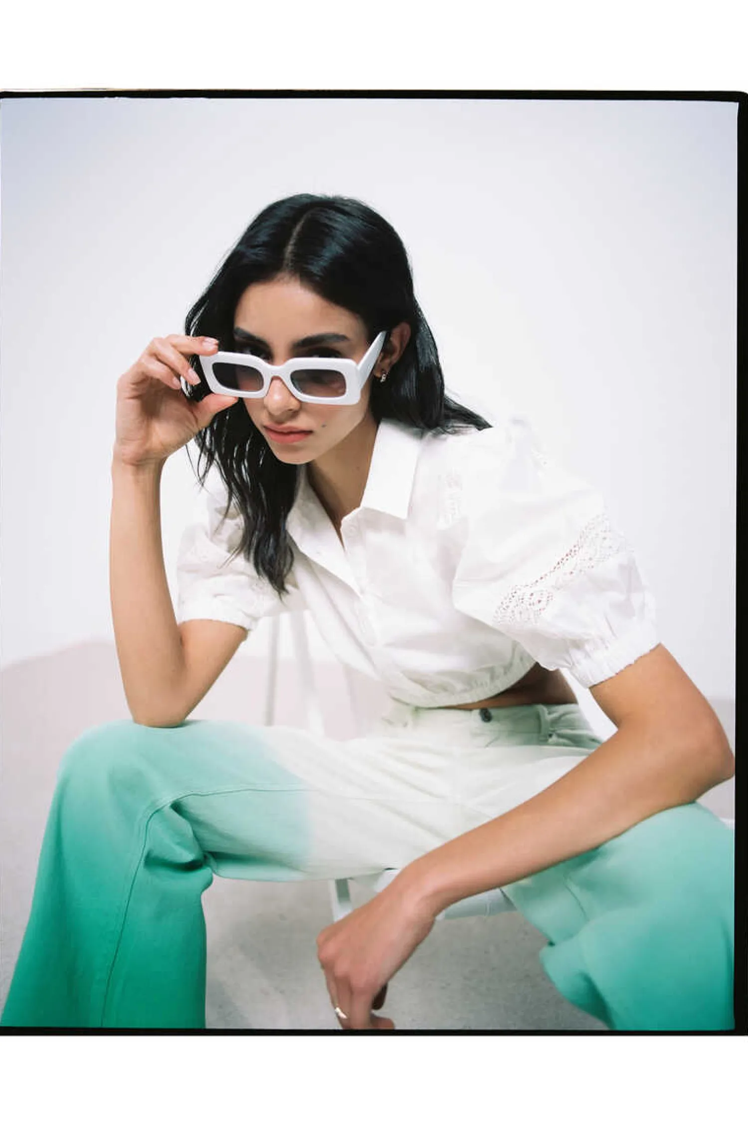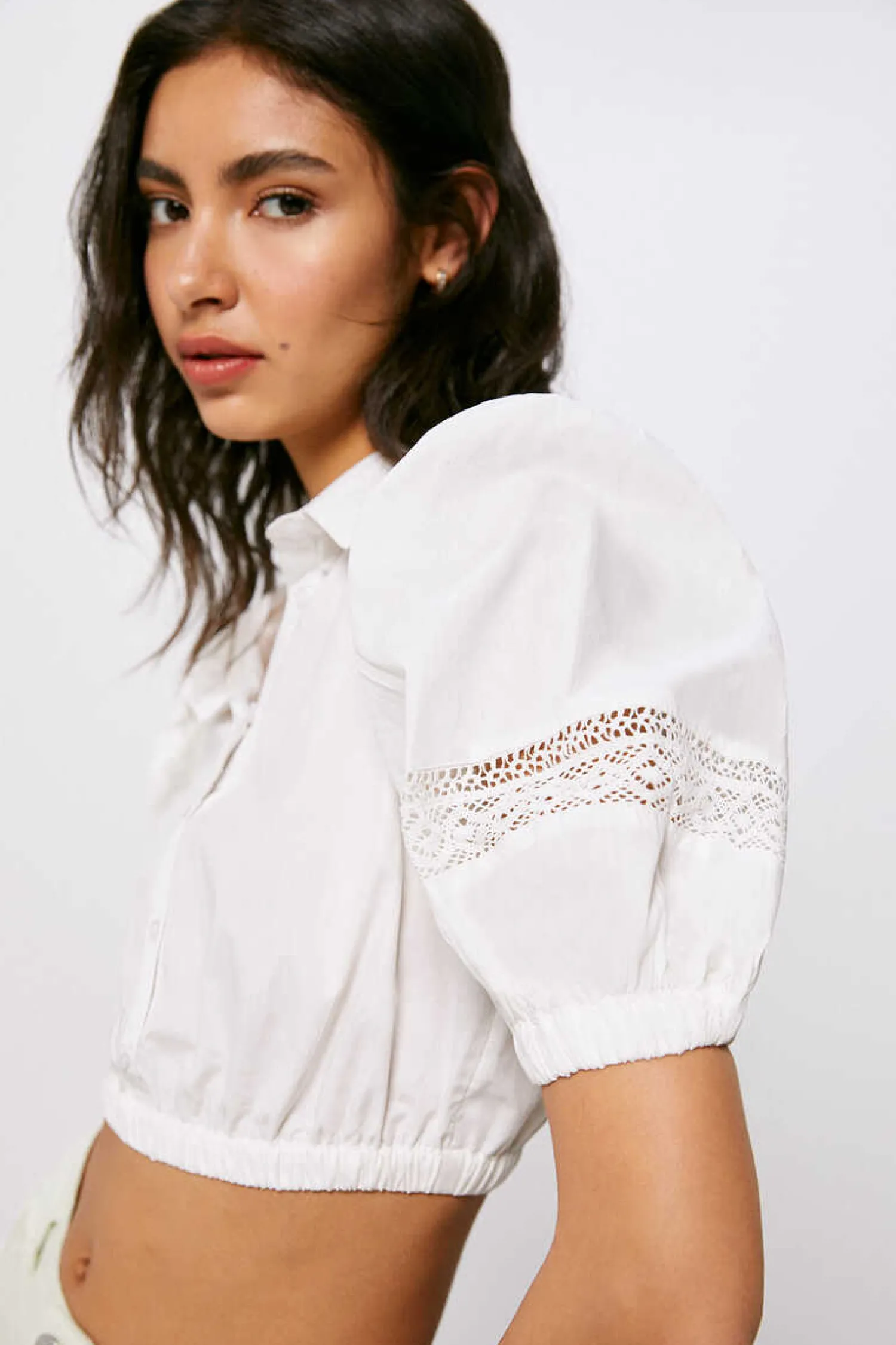 Blusa Curta De Manga Curta Com Volume, Com Detalhes De Lace Nas Mangas, Botoes Na Frente, Com Borracha Nas Mangas E Na Bainha.