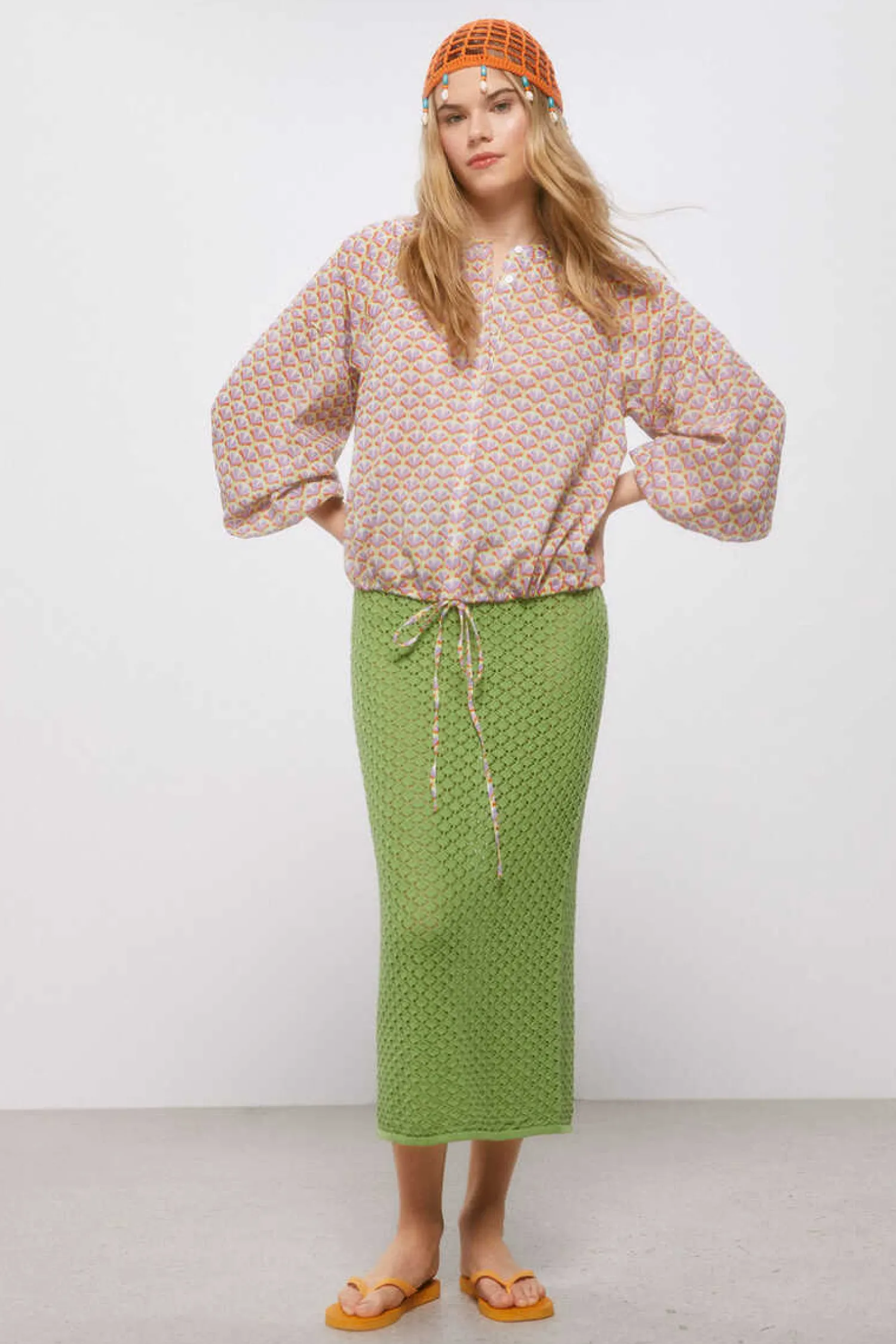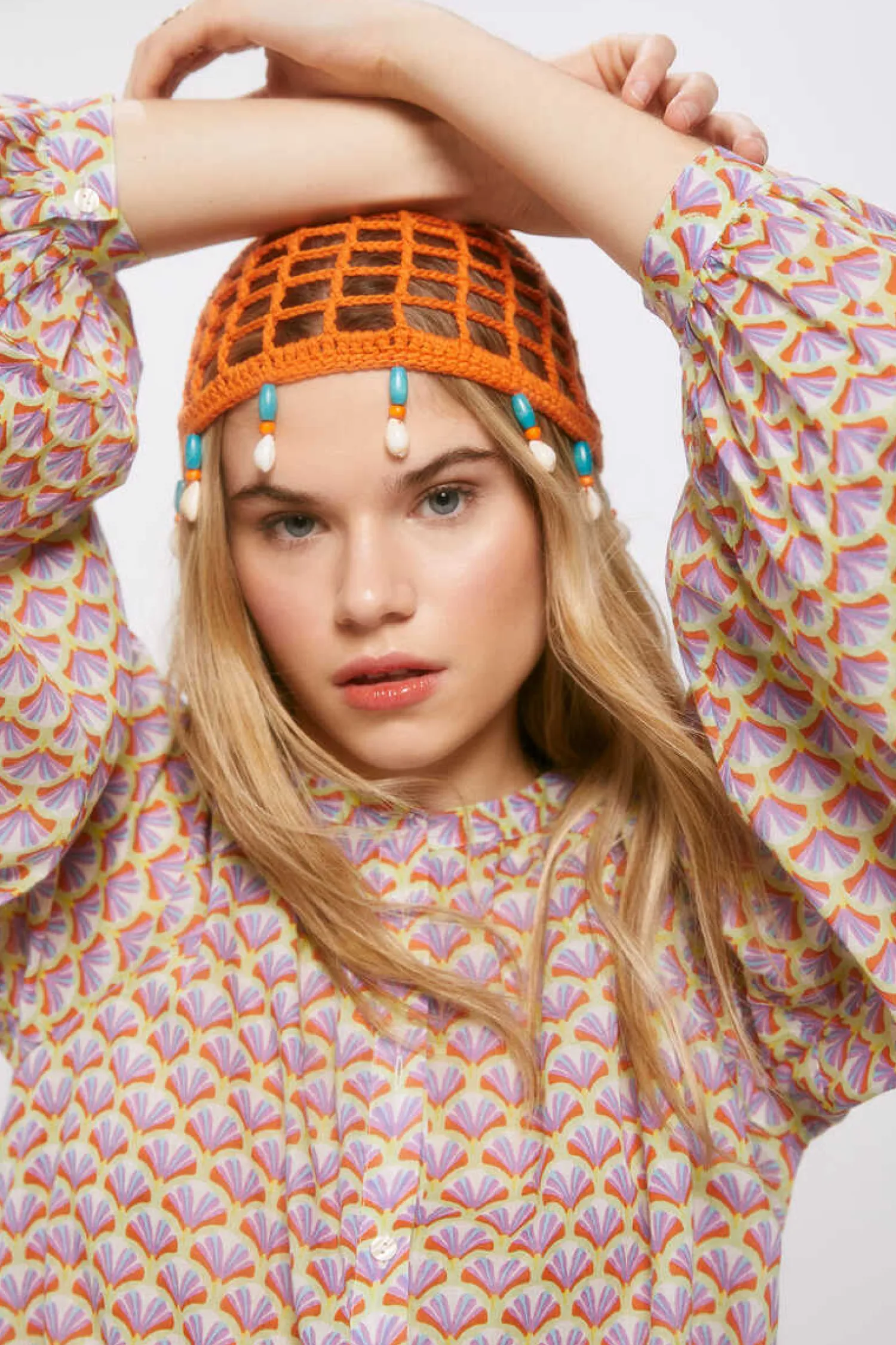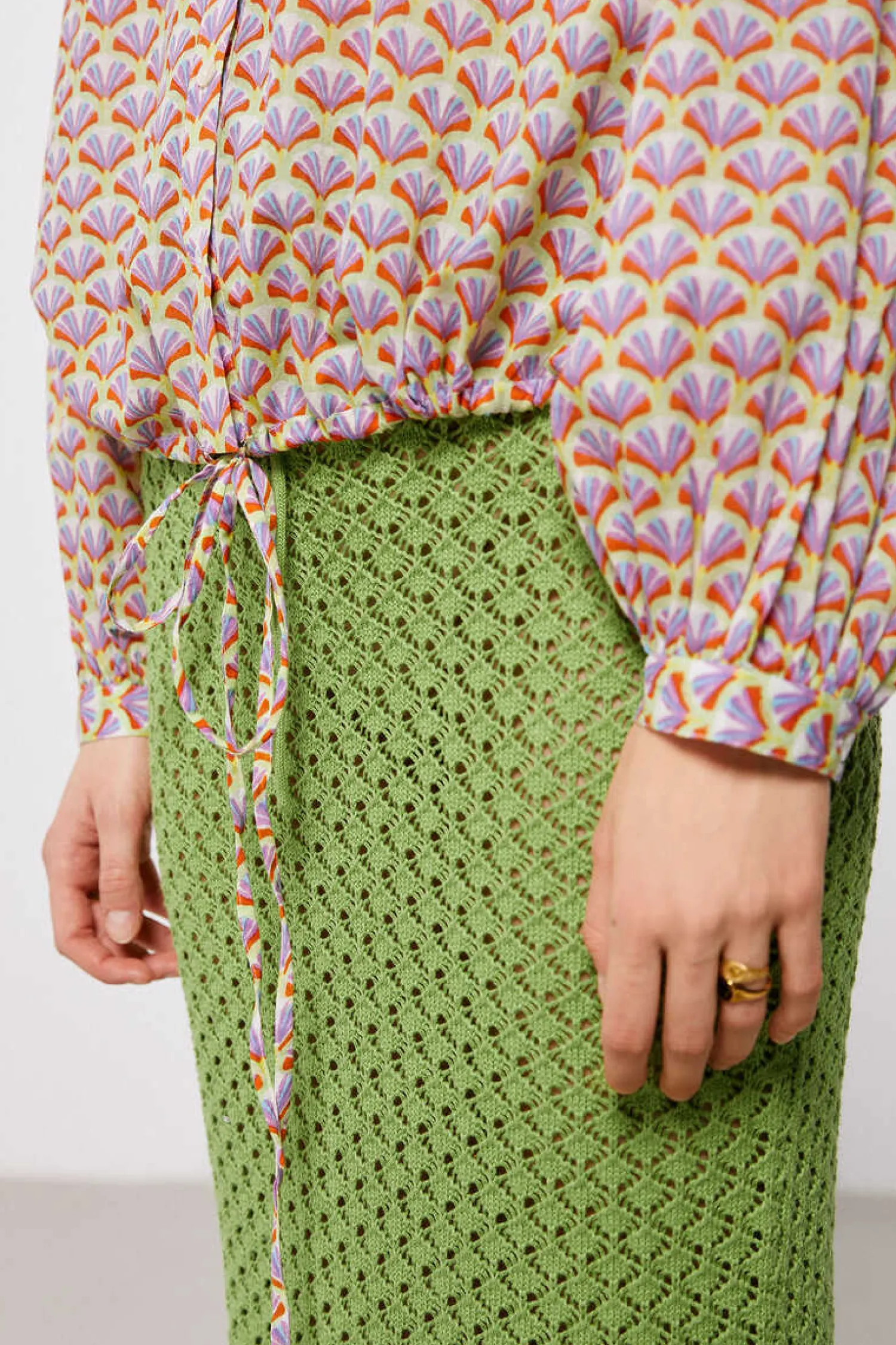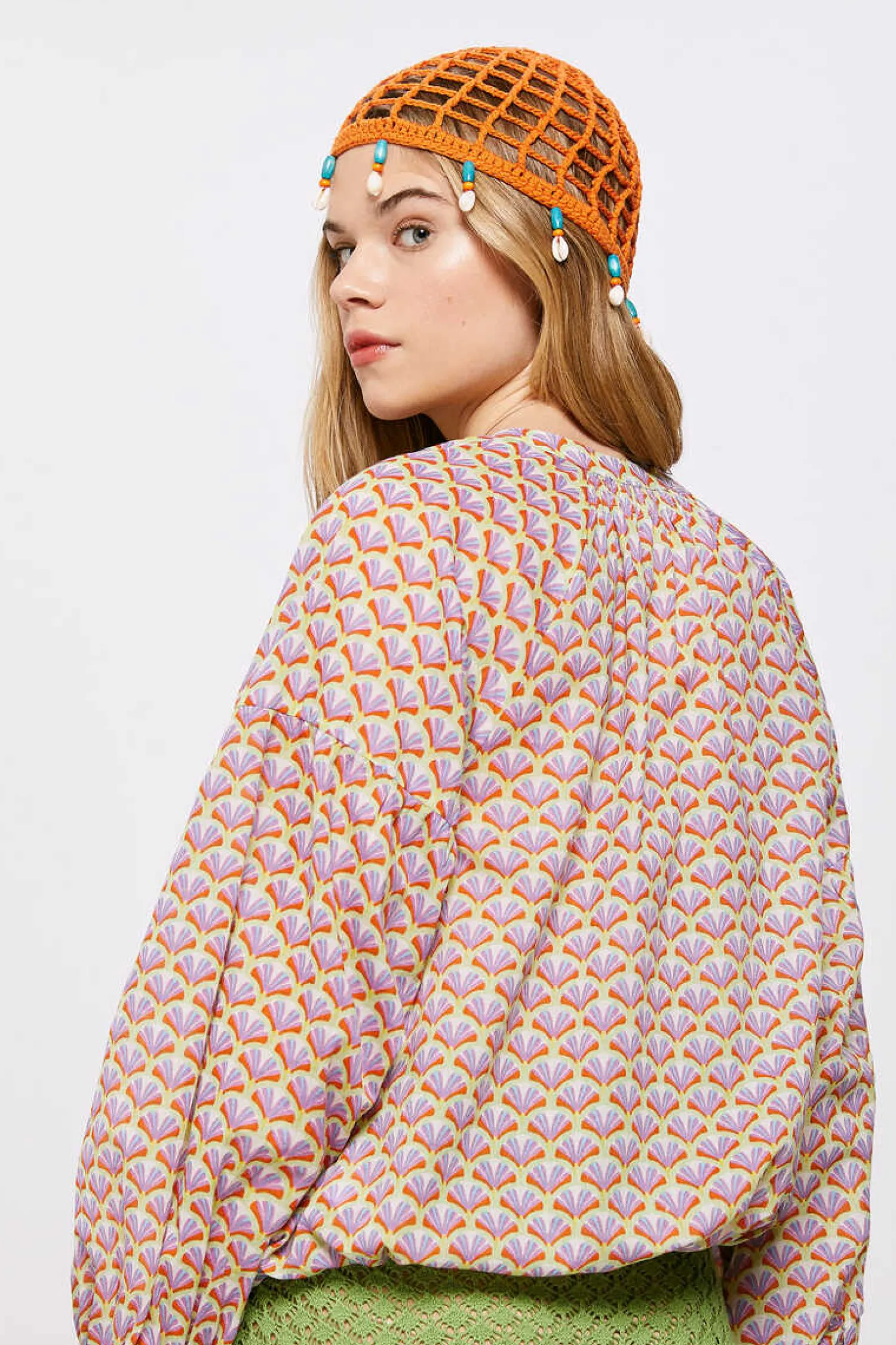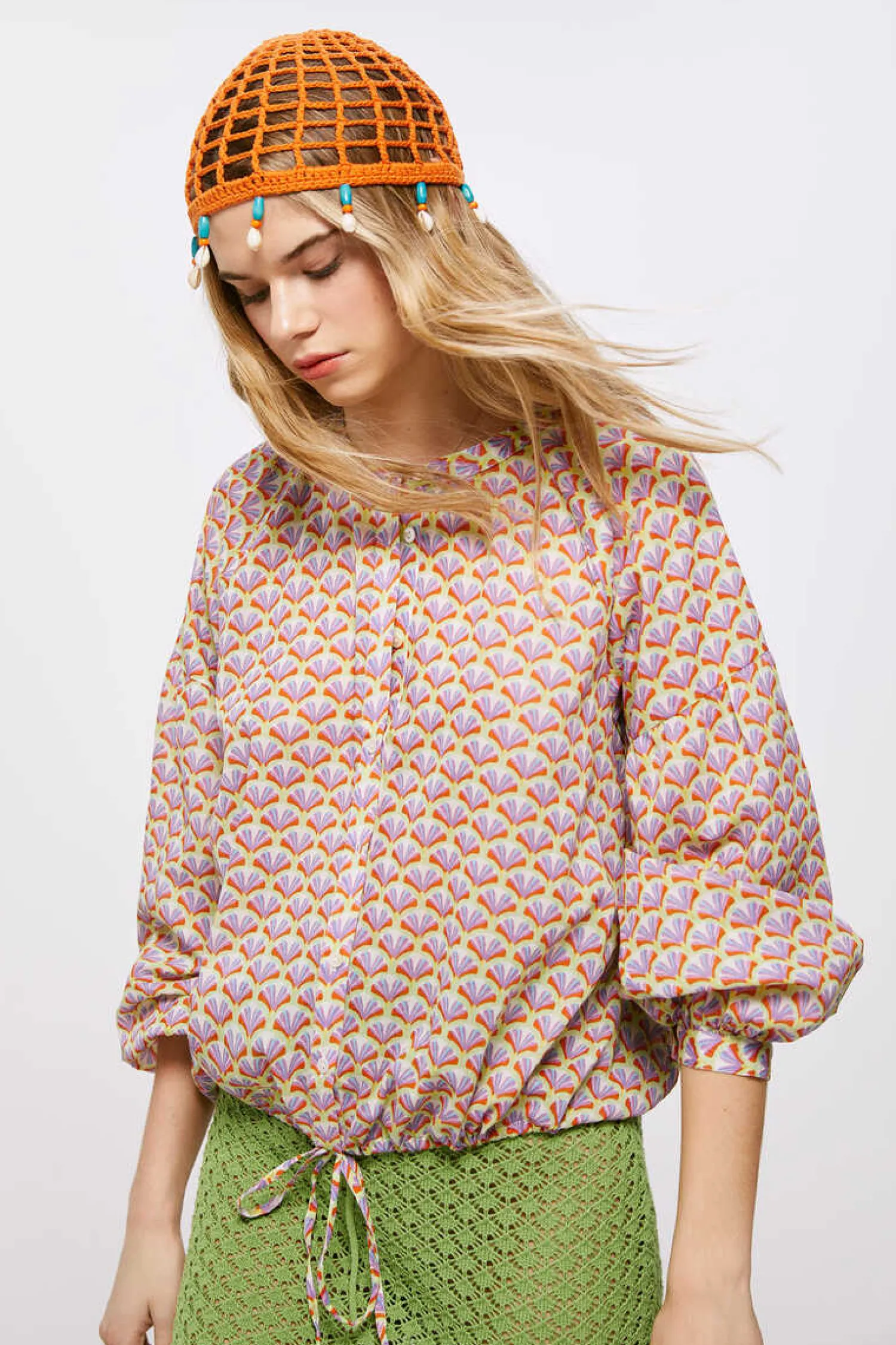 Blusa De Manga Comprida Caida Com Volume, Comgola Estilo Mao, Com Botoes Na Frente, Com Laco Na Bainha E Com Estampado.