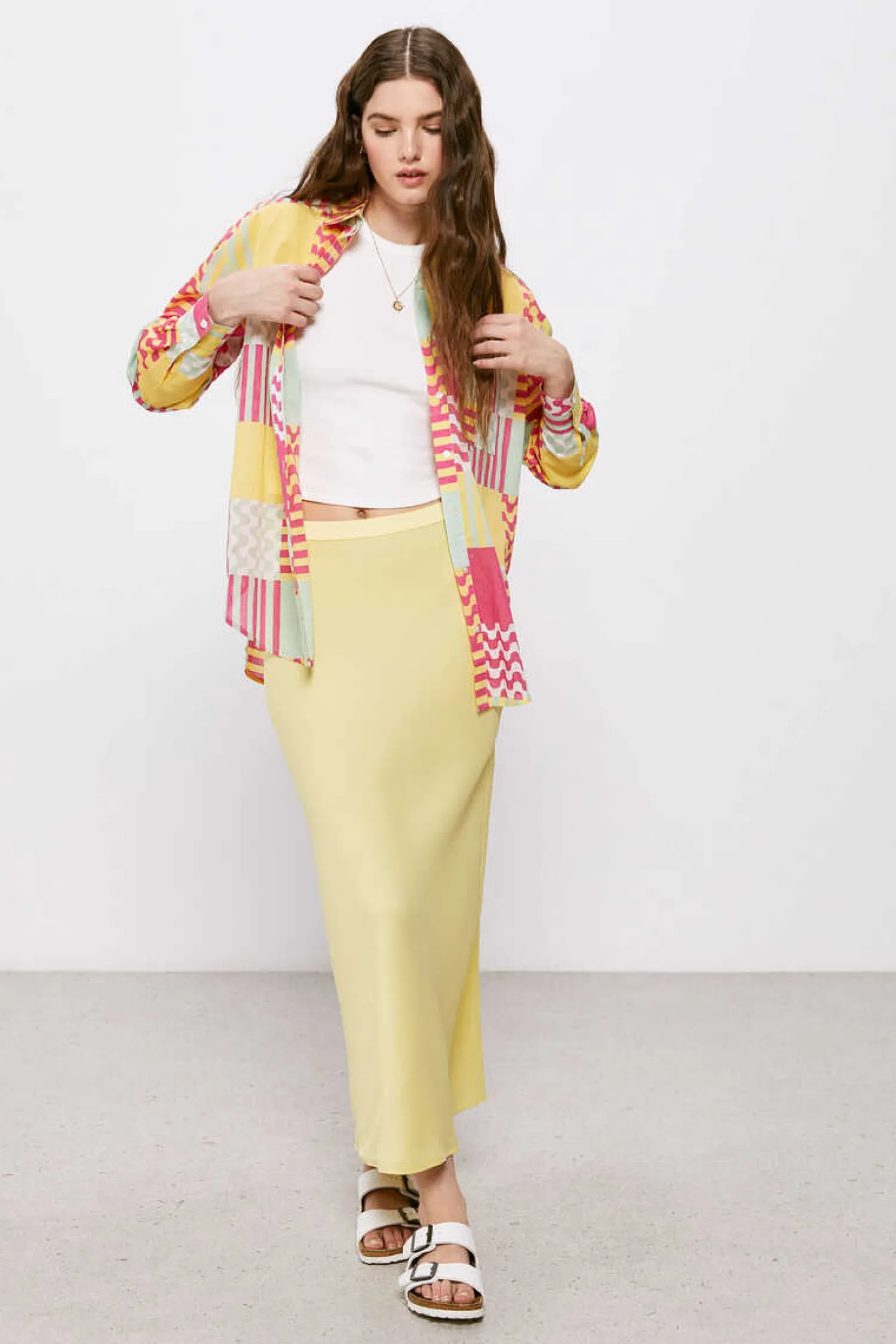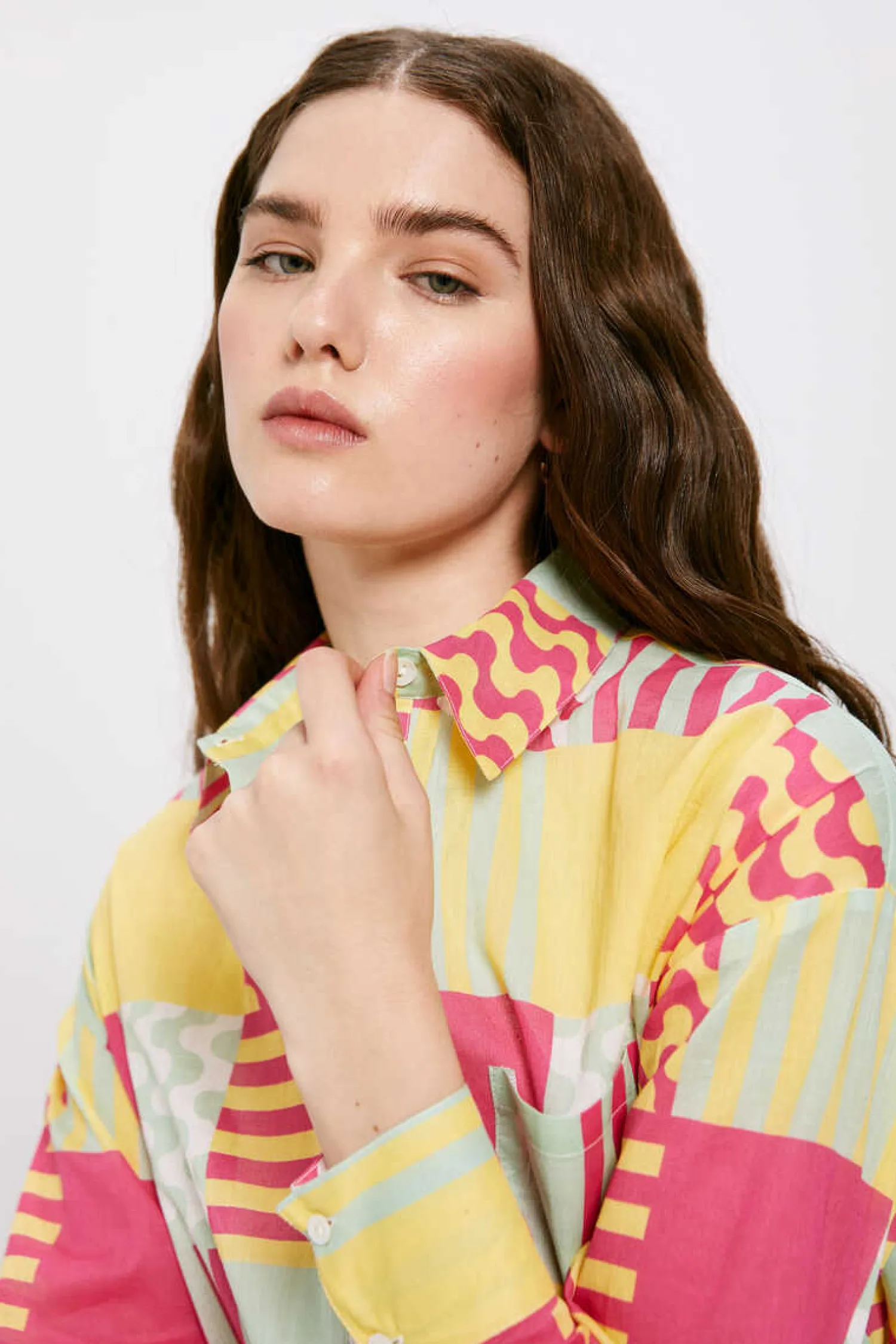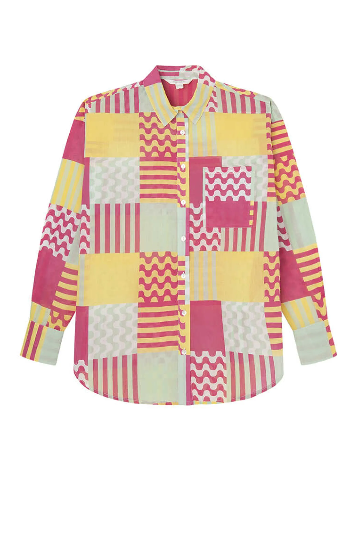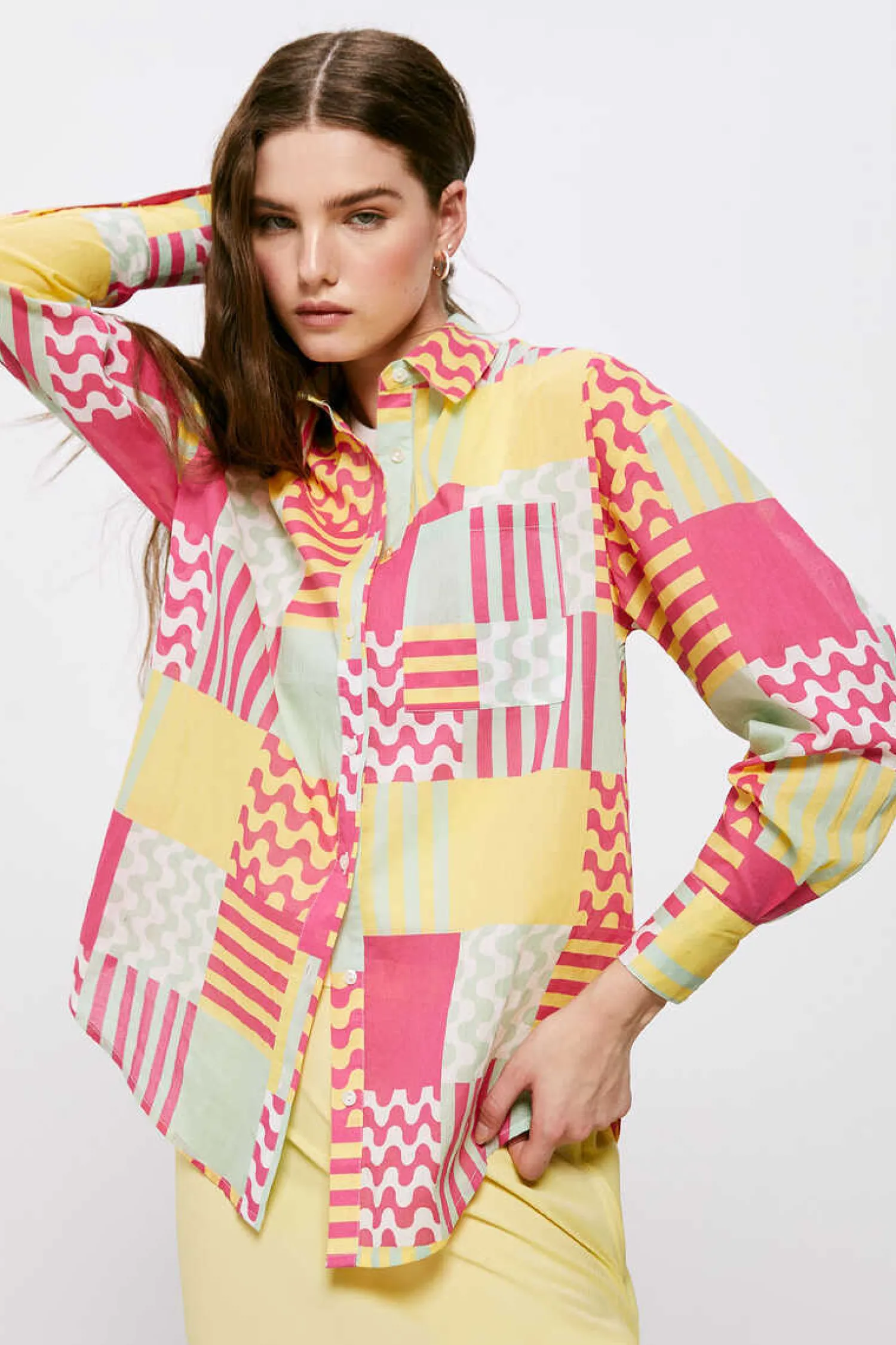 Blusa Oversize De Manga Comprida Descaida, Com Gola Camiseira, Fecho De Botoes Na Frente, Com Estampado De Xadrez Patchwork Em Tecido Voile.