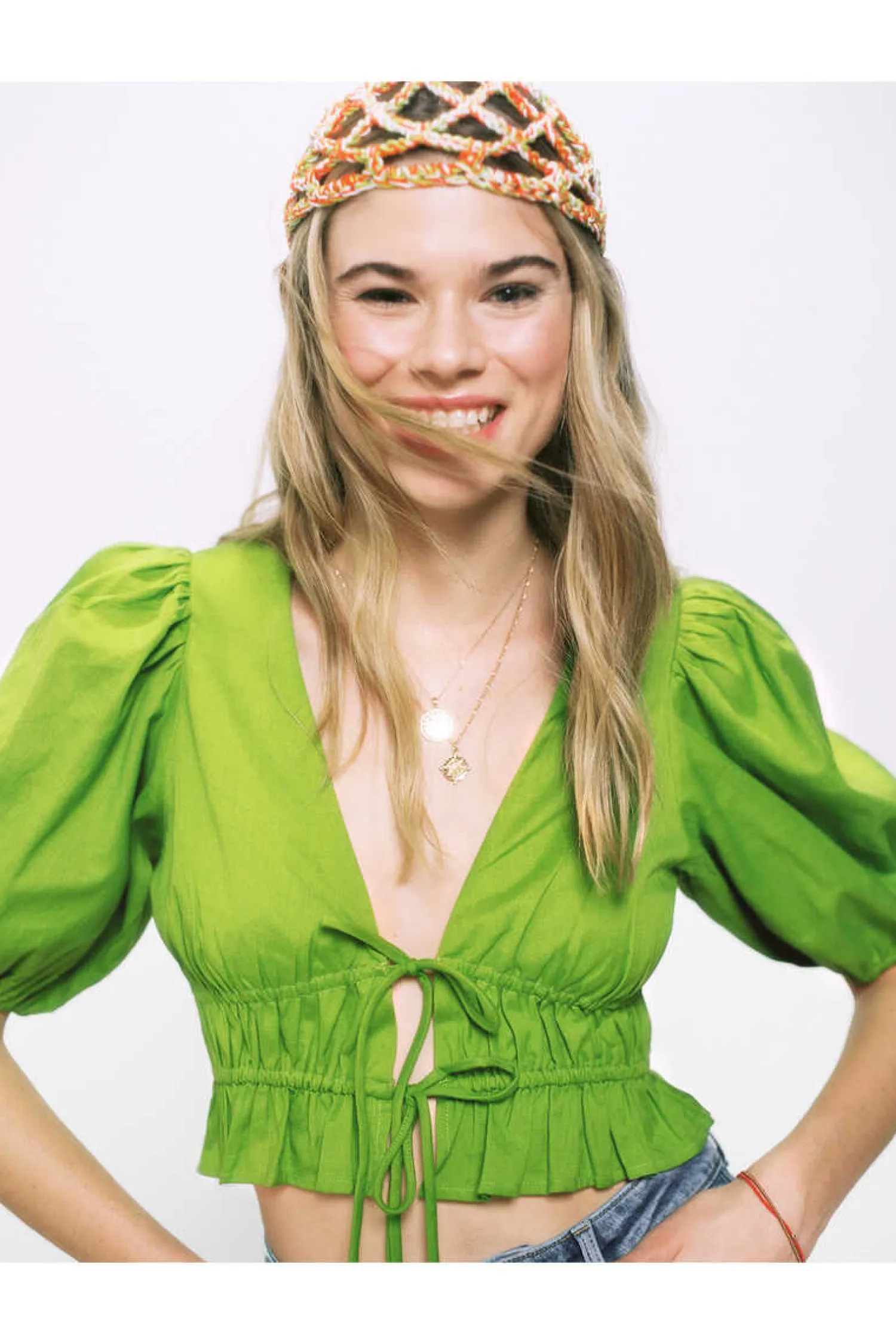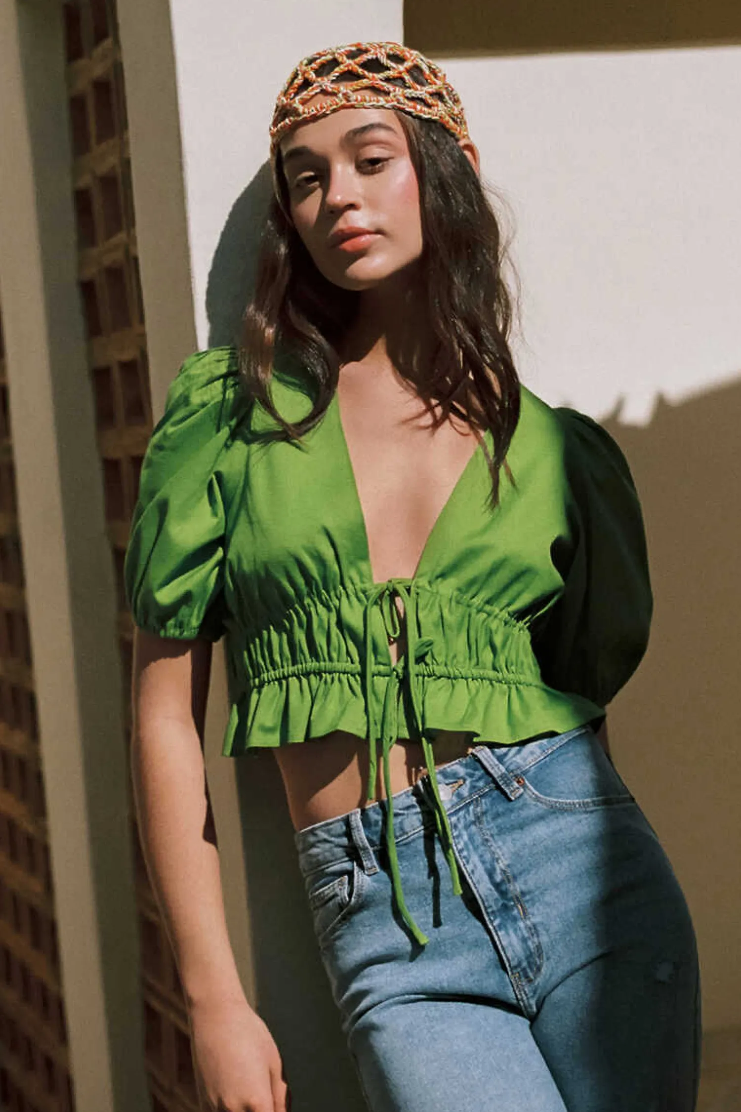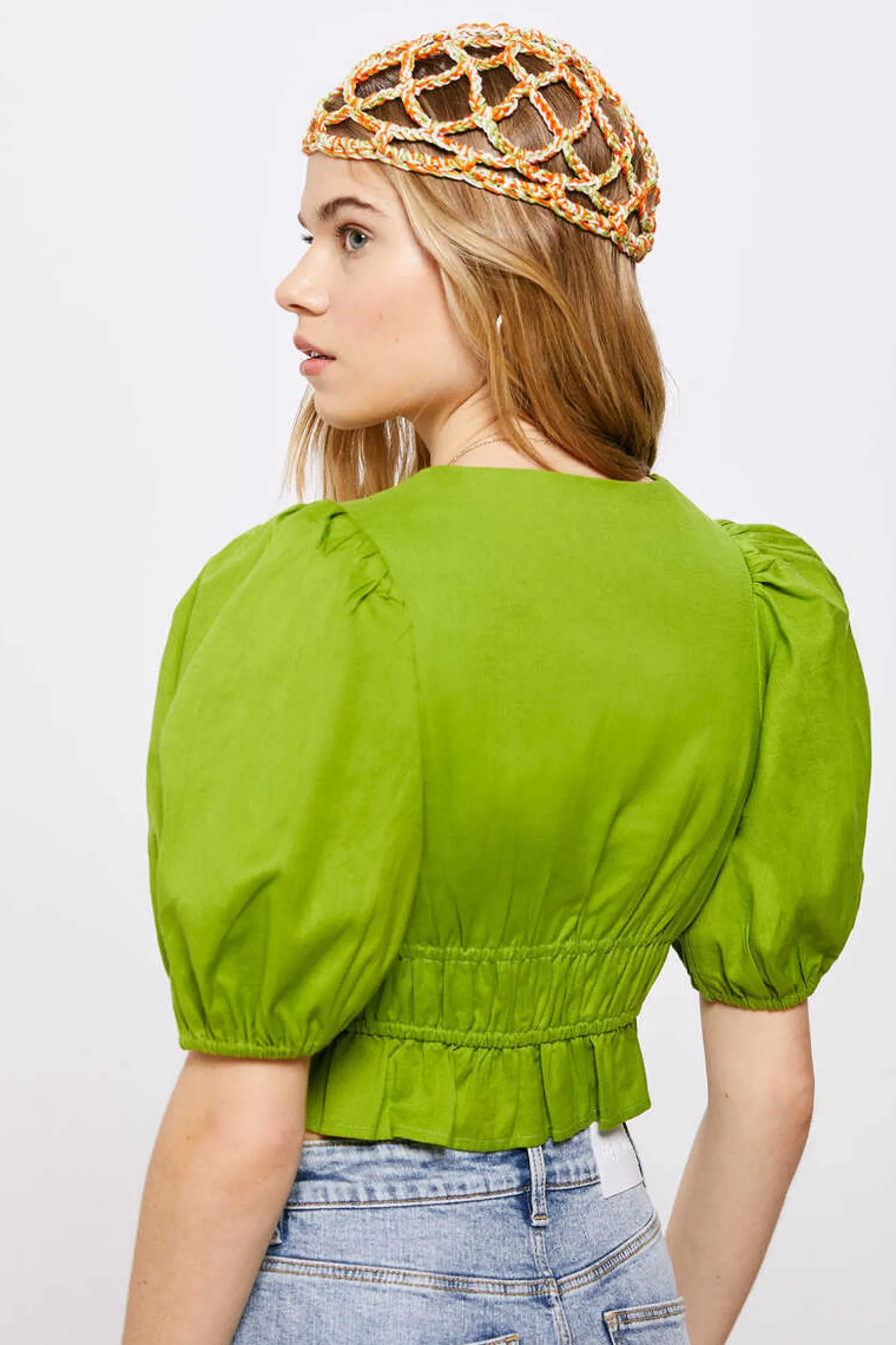 Blusa De Manga Curta Com Volume, Com Decote Em V, Com Nervuras Na Cintura, Com Fecho De Lacos Na Frente.