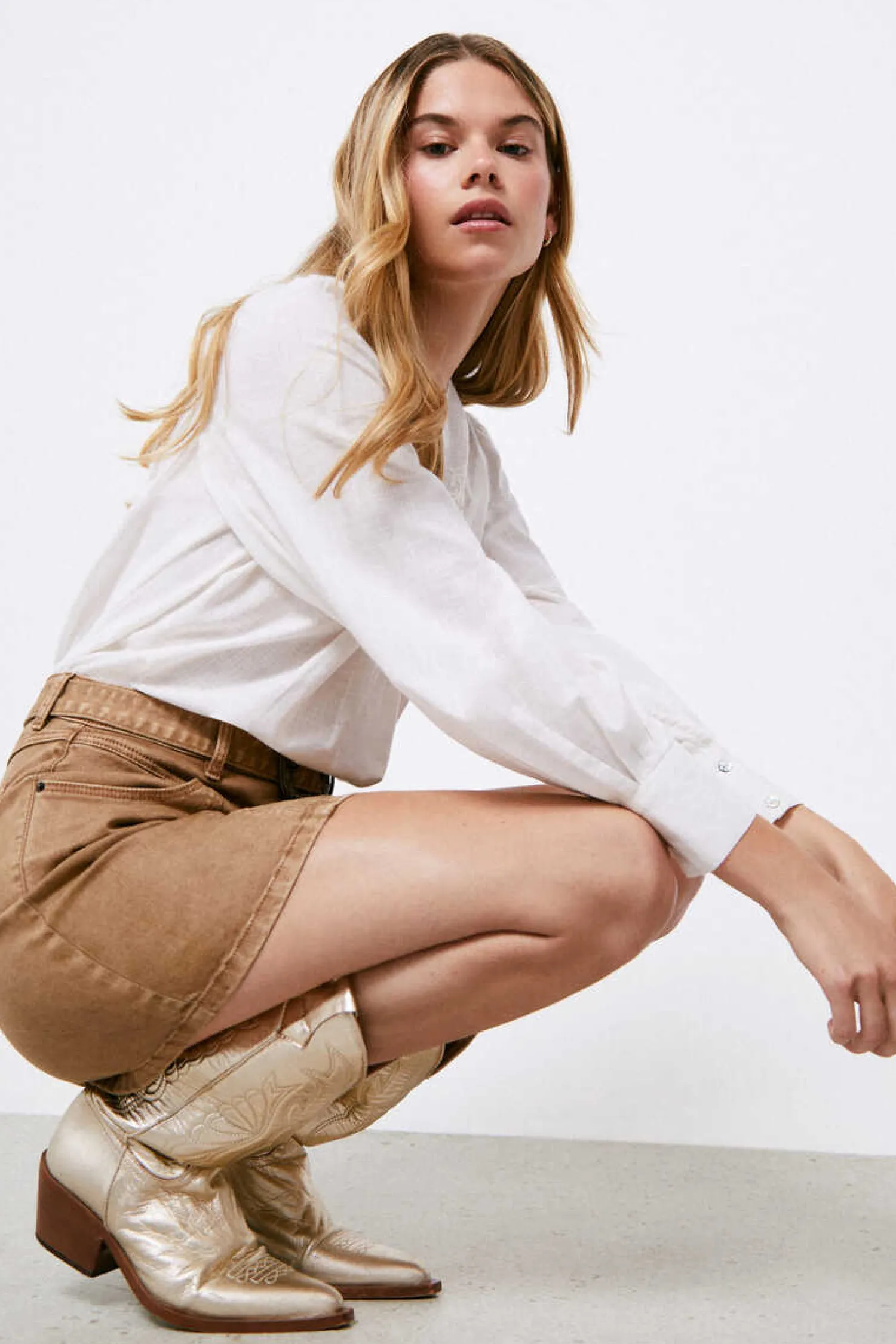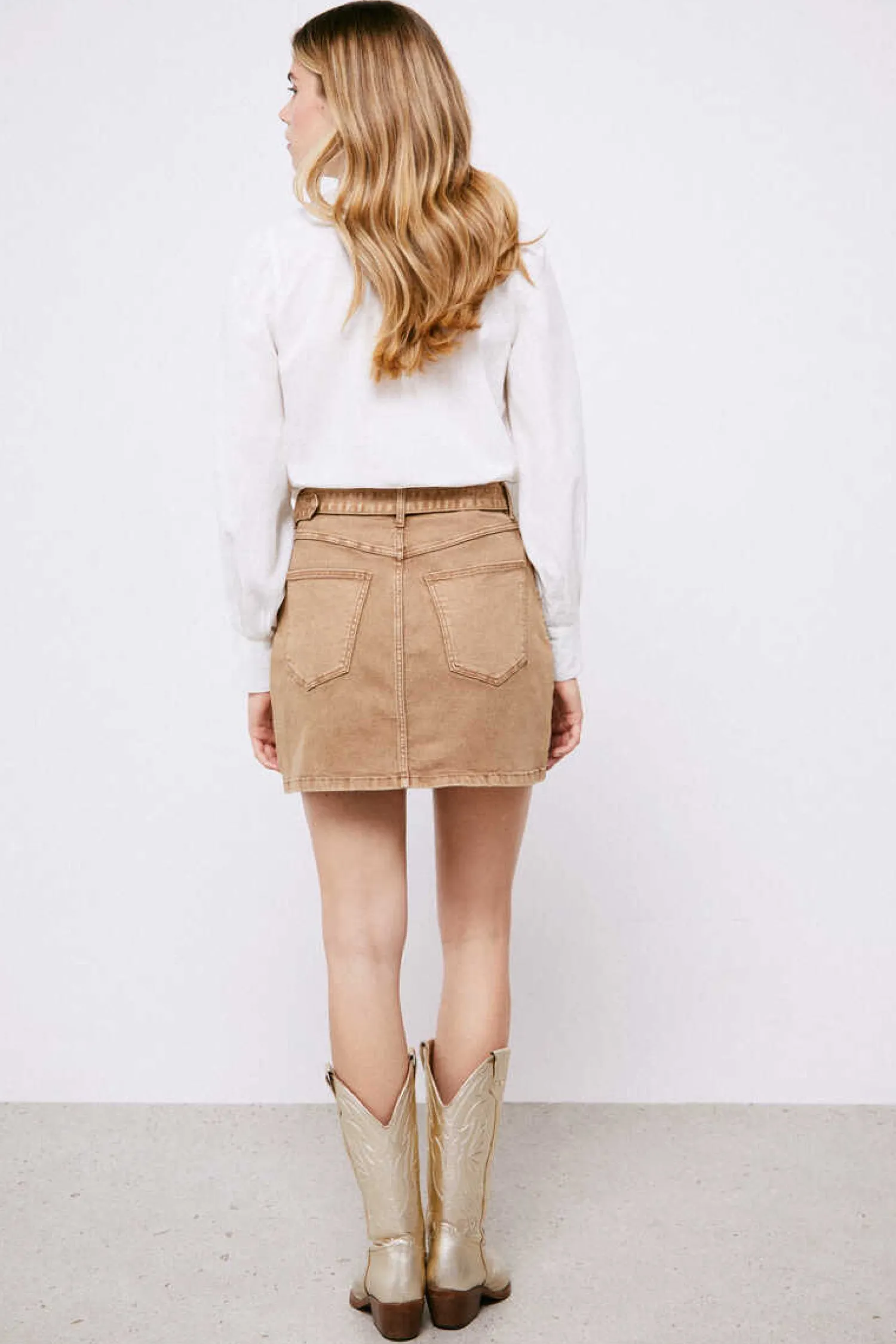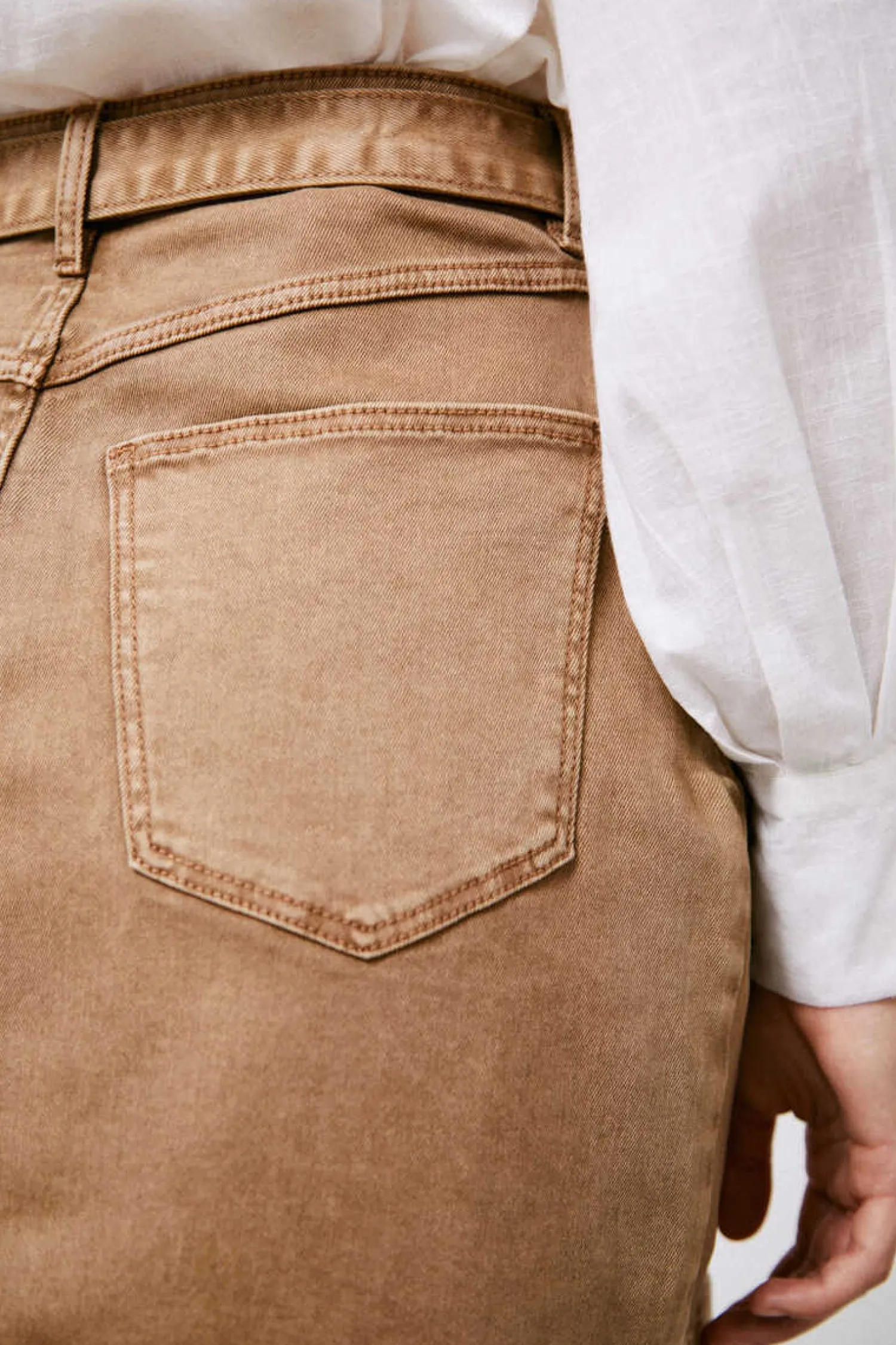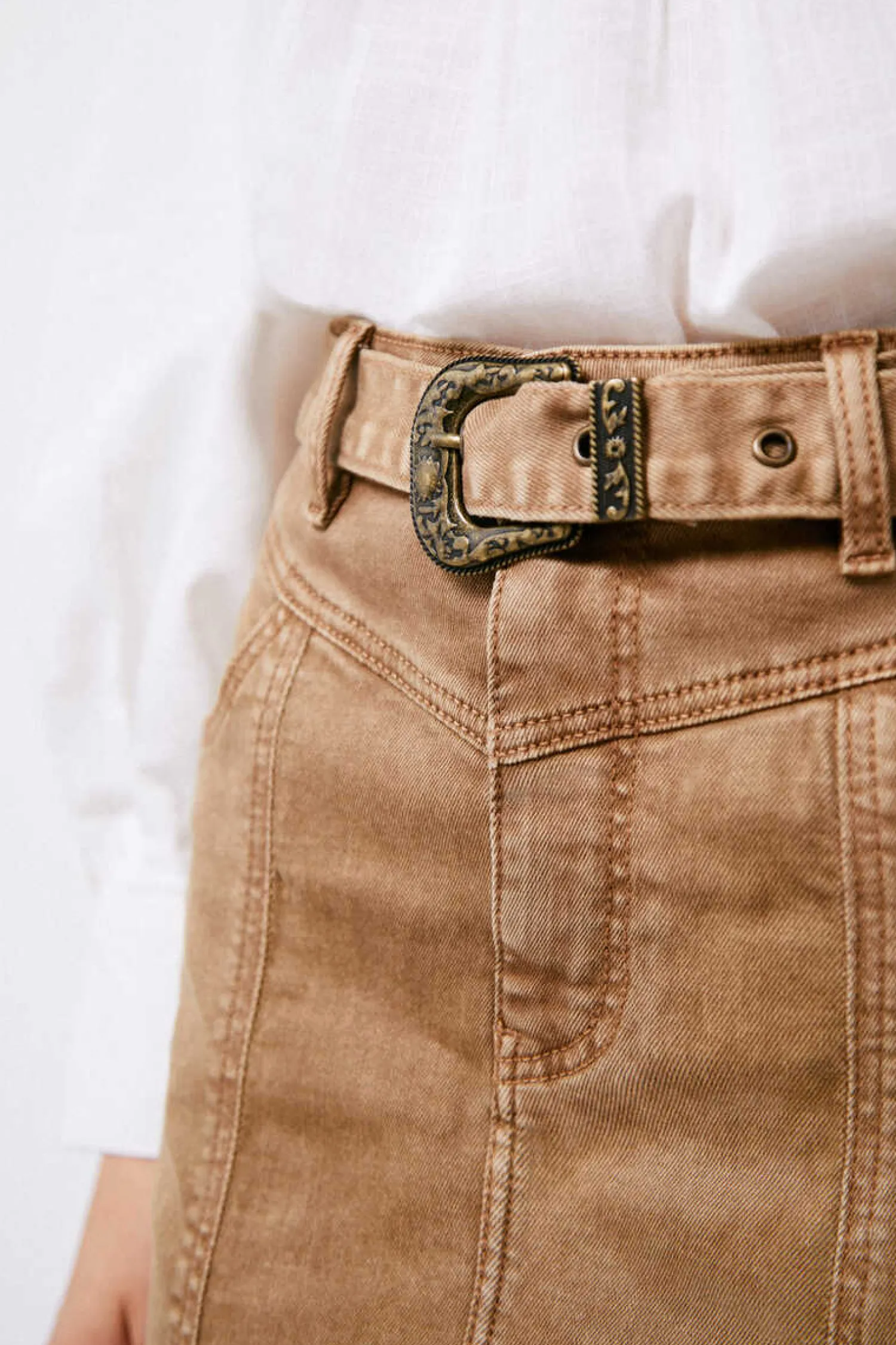 Minissaia De Ganga, Com Bolsos Na Parte Da Frente E Tras, Com Botao E Fecho-Eclair, Com Detalhe De Cinto Com Fivela Metalica E Costuras Na Parte Da Frente.