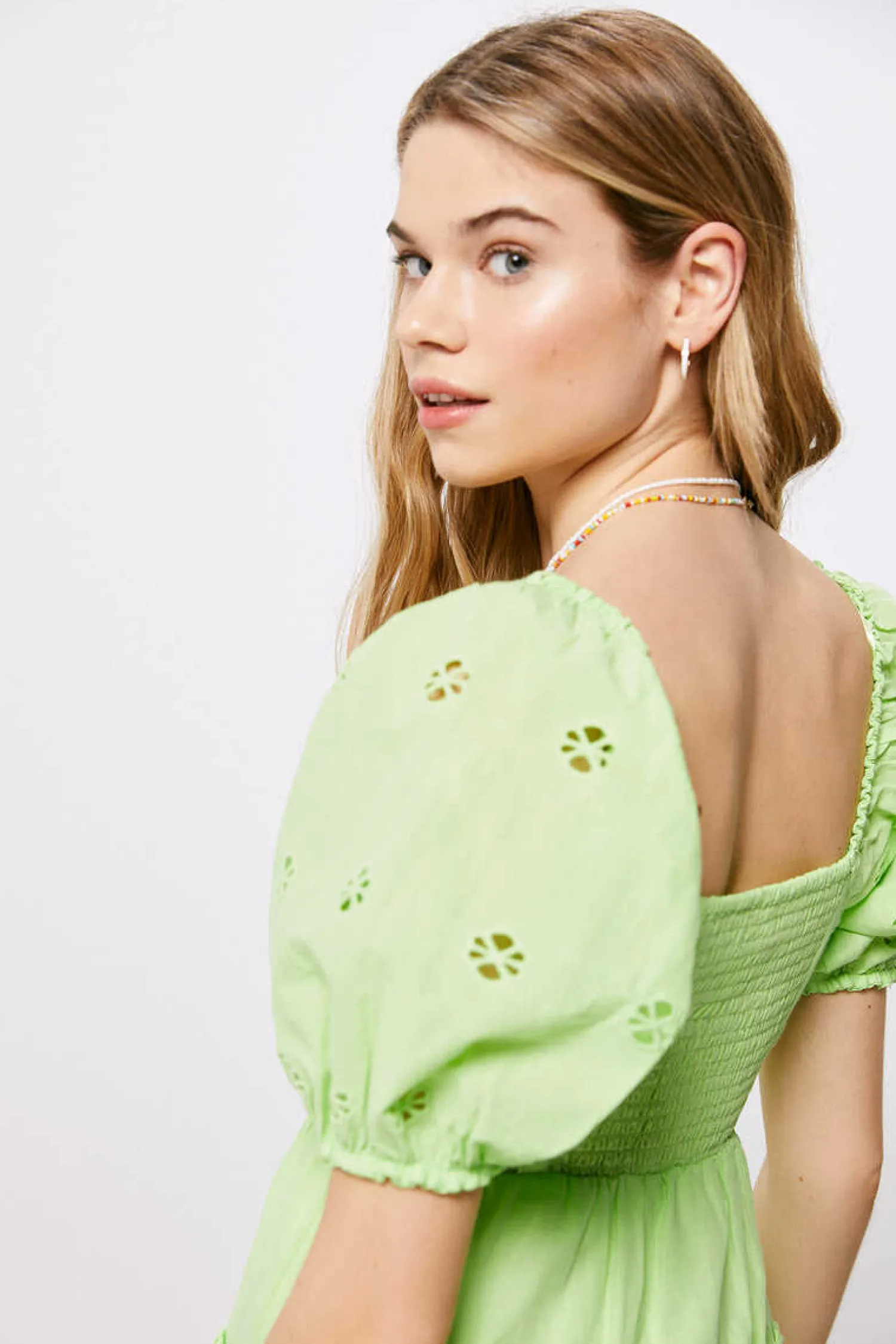 Vestido De Manga Curta Com Volume, Com Decote Quadrado Na Frente E Nas Costas, Com Franzido Ninho De Abelha Nas Costas, Com Bordado Ingles E Com Saia Rodada Com … Folhos.Ver Mais