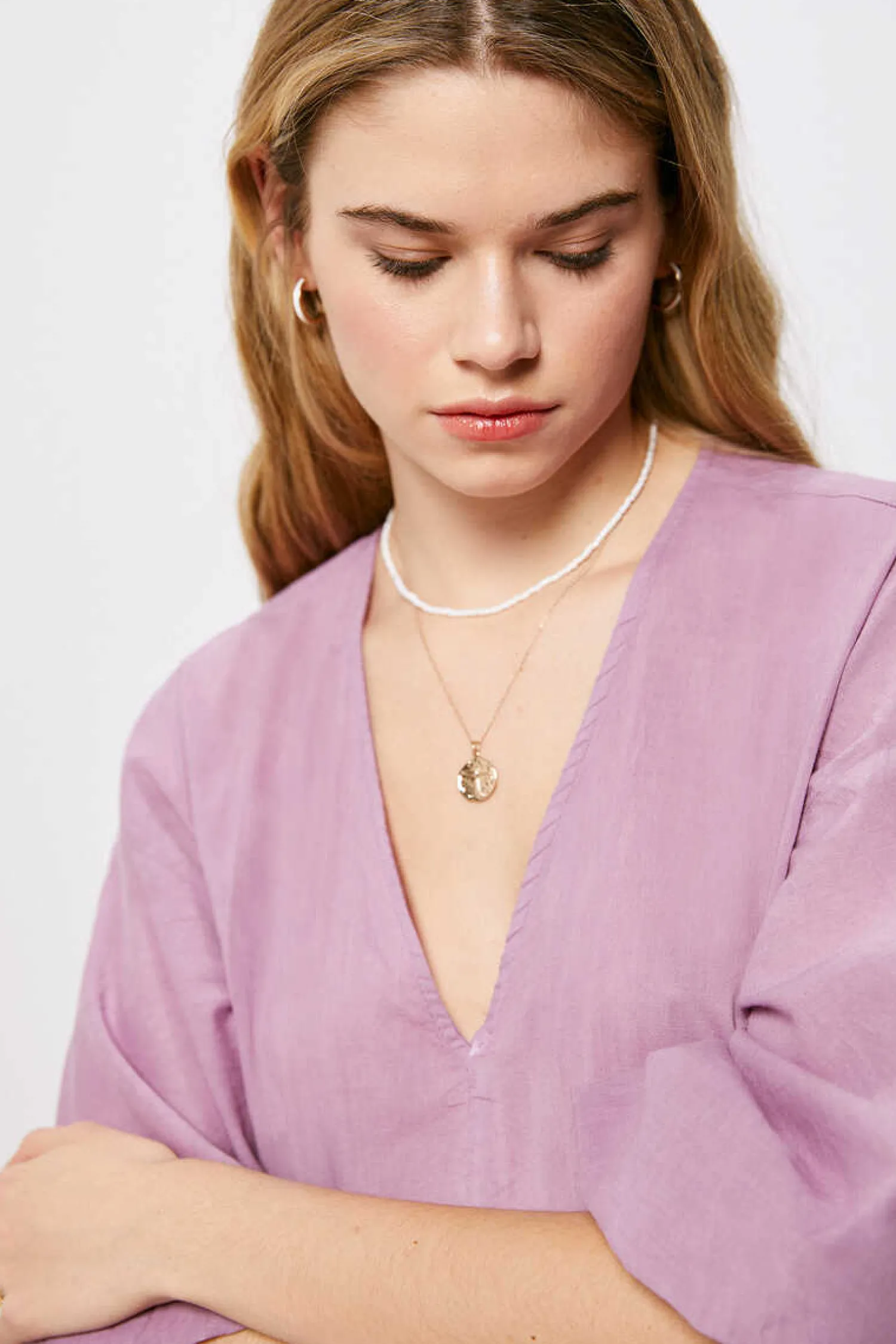 Vestido De Manga 7/8 Com Volume, Com Decote Em V, Com Elastico Nos Punhos, Com Paineis E Com Efeito Tingido.