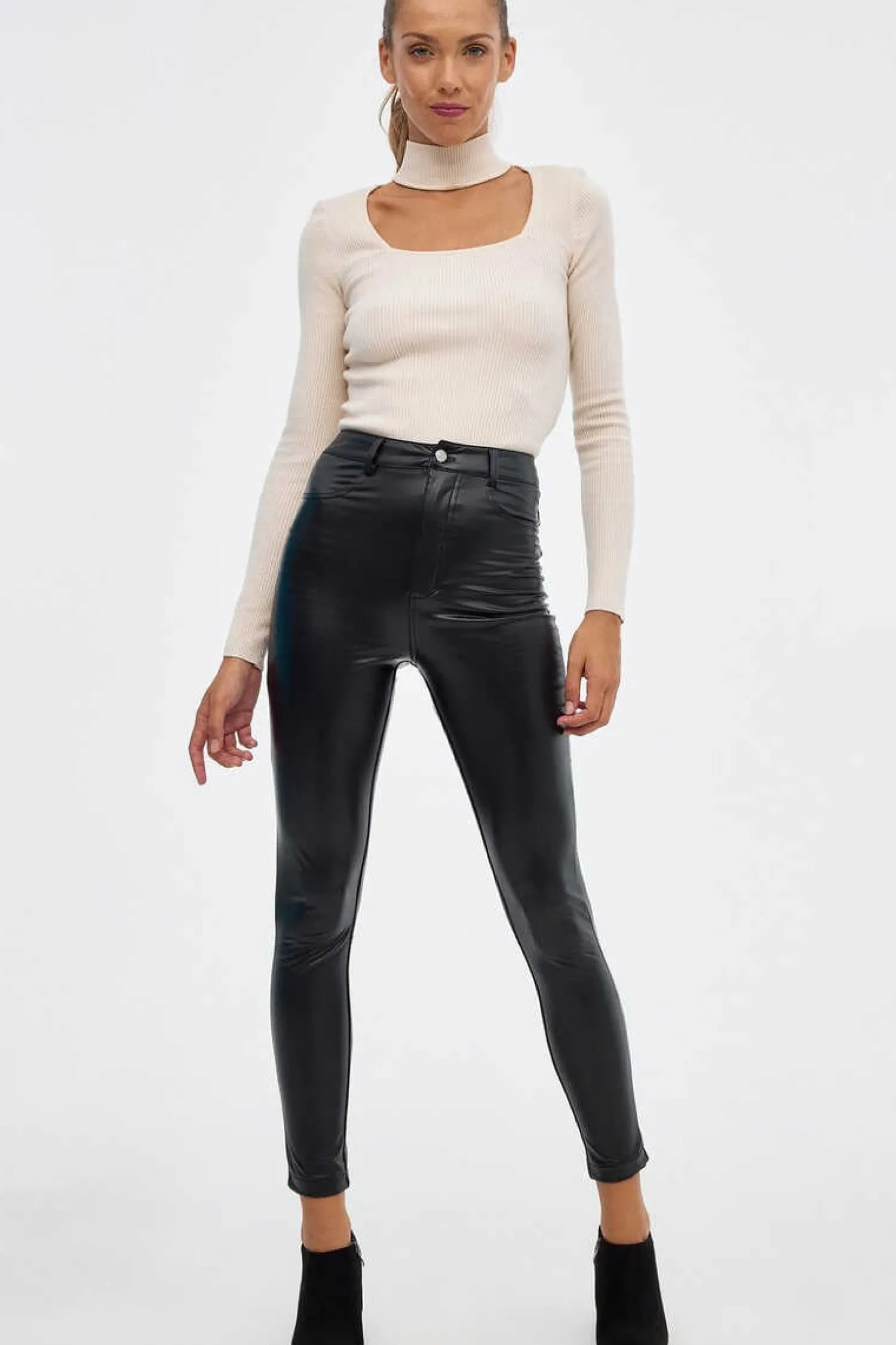 Leggings Superskinny De Cintura Subida De Tecido Efeito Pele E Fecho-Eclair E Botao.