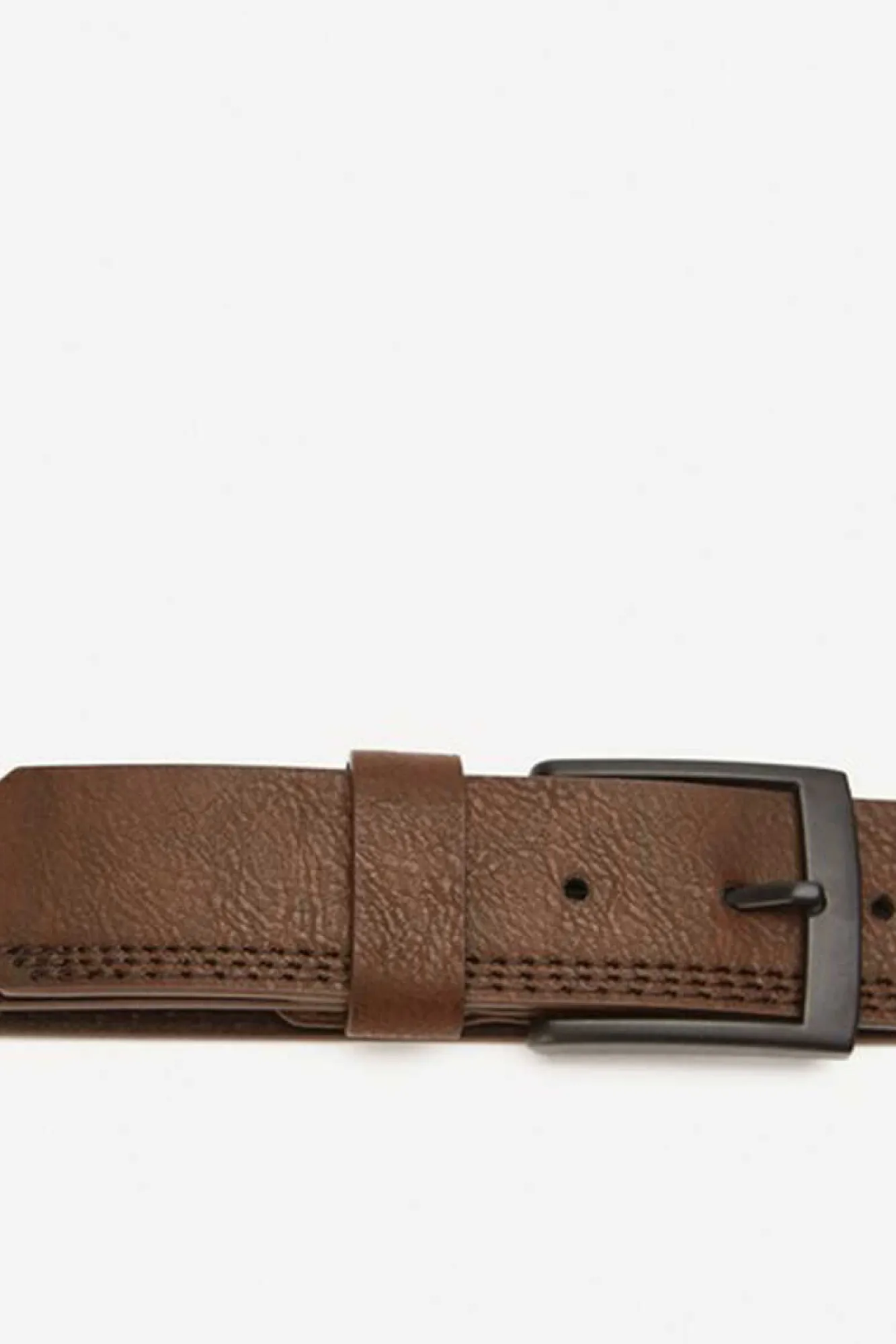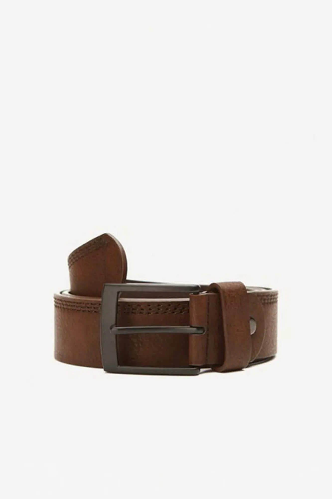 Cinto Efeito Pele Em Castanho, Com Detalhe De Pespontos E Fivela Metalica Quadrada.