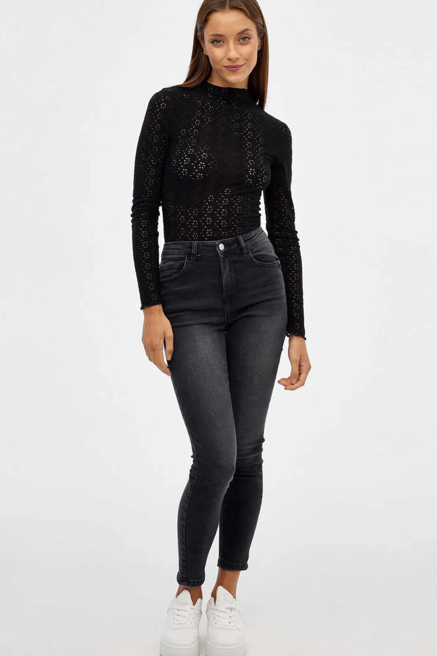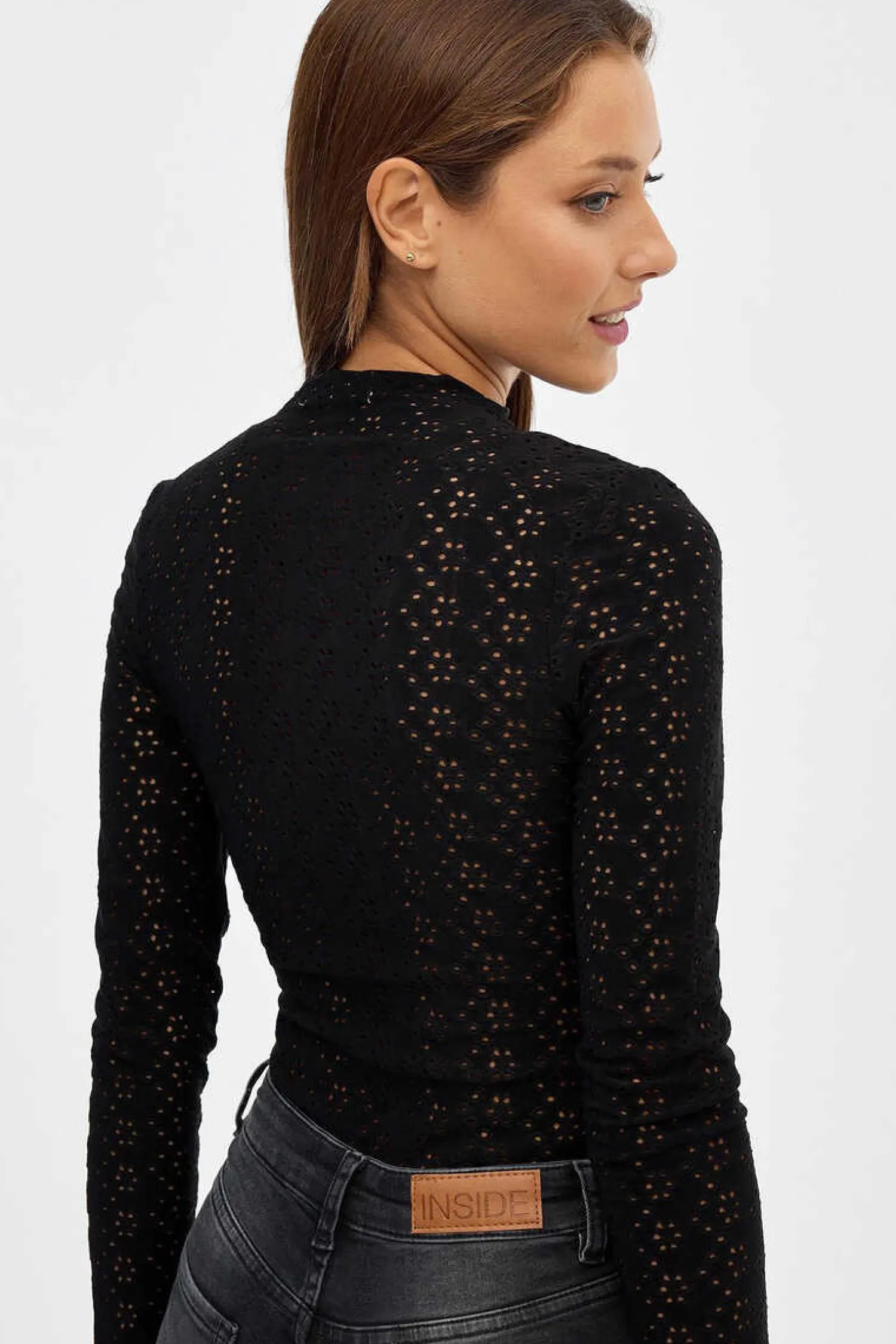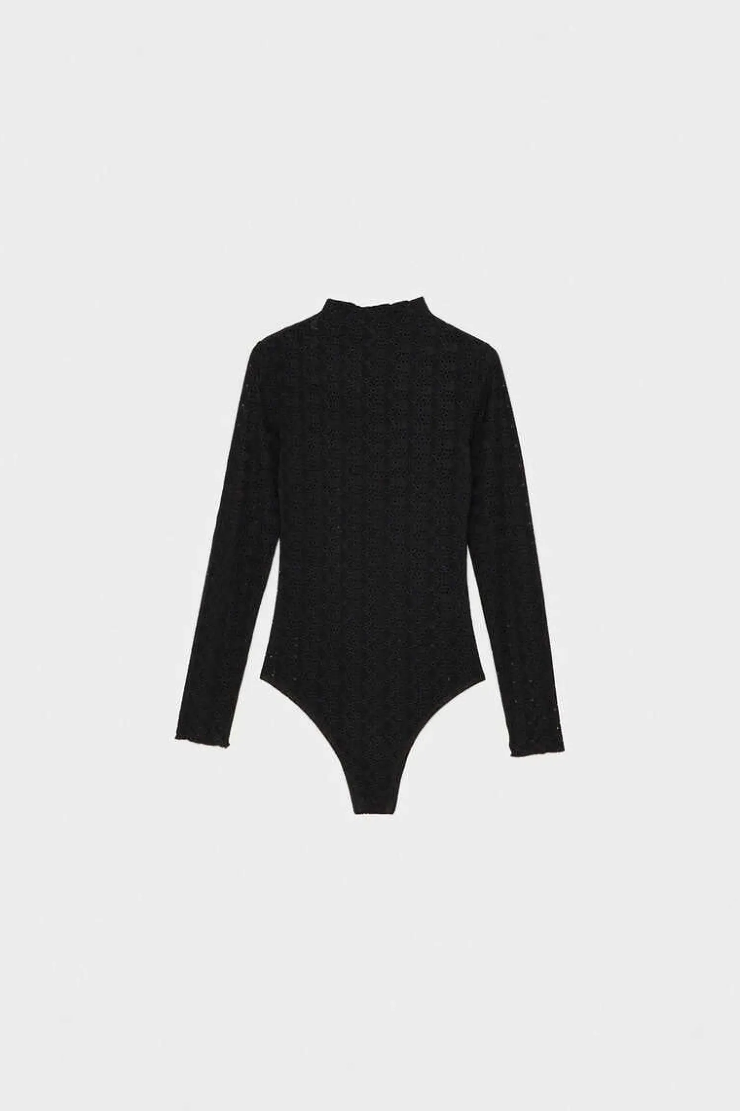 Body Ajustado De Manga Comprida E Gola Perkins Com Tecido De Crochet E Fecho De Colchetes.