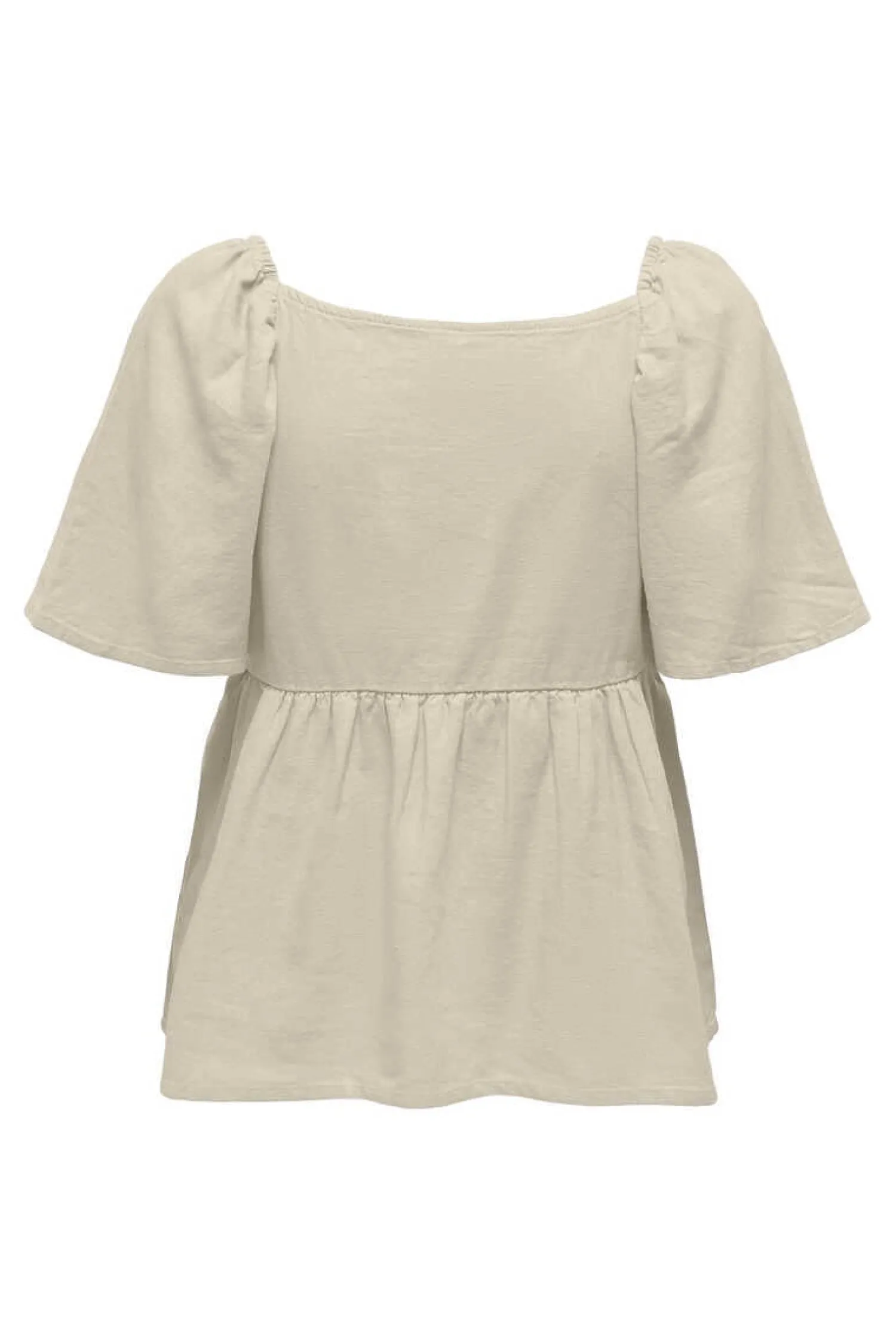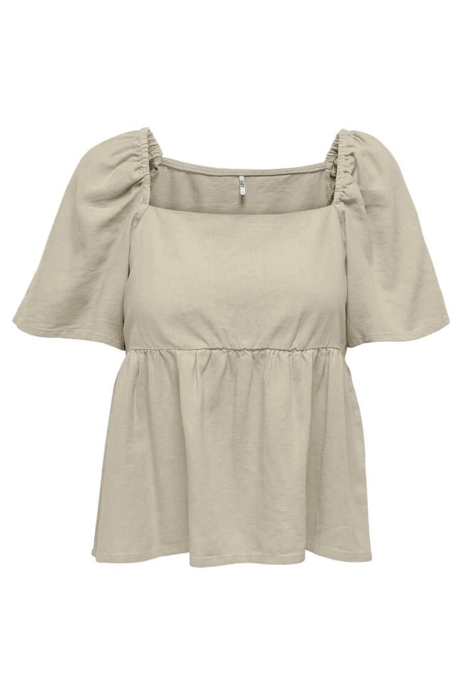 Blusa De Mistura De Linho De Manga Curta Com Volume, Gola Quadrada E Folho Inferior.