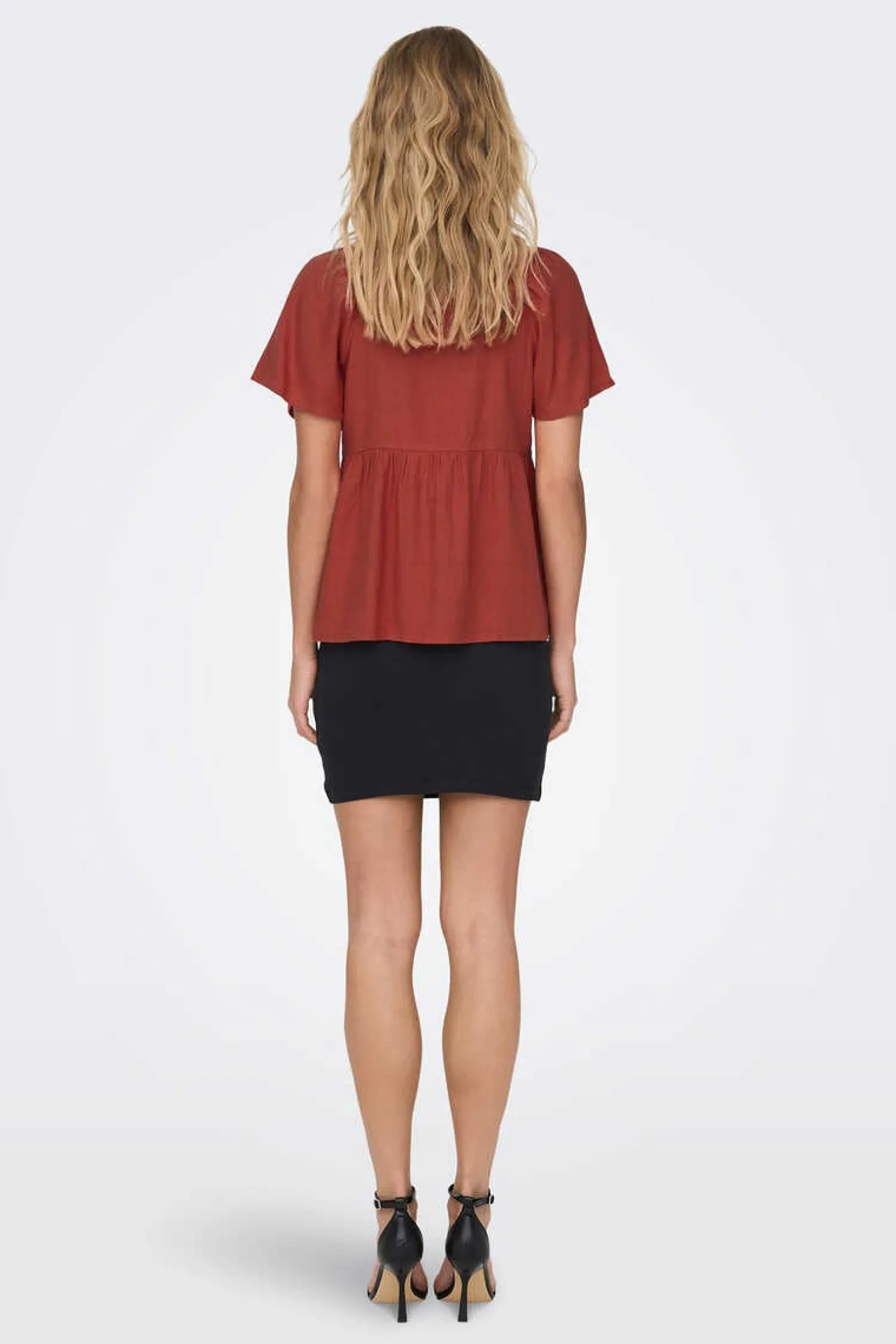 Blusa De Mistura De Linho De Manga Curta Com Volume, Gola Quadrada E Folho Inferior.