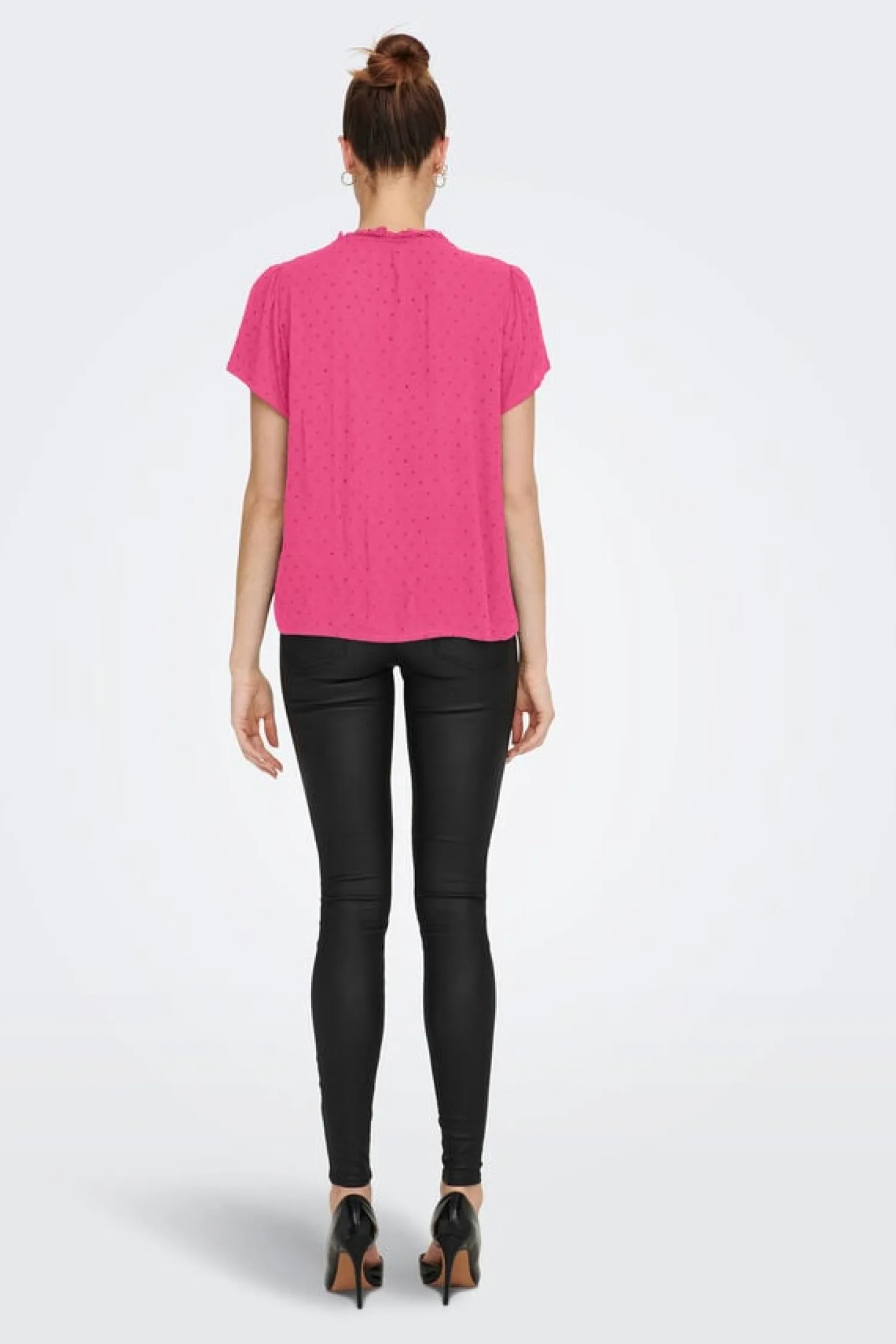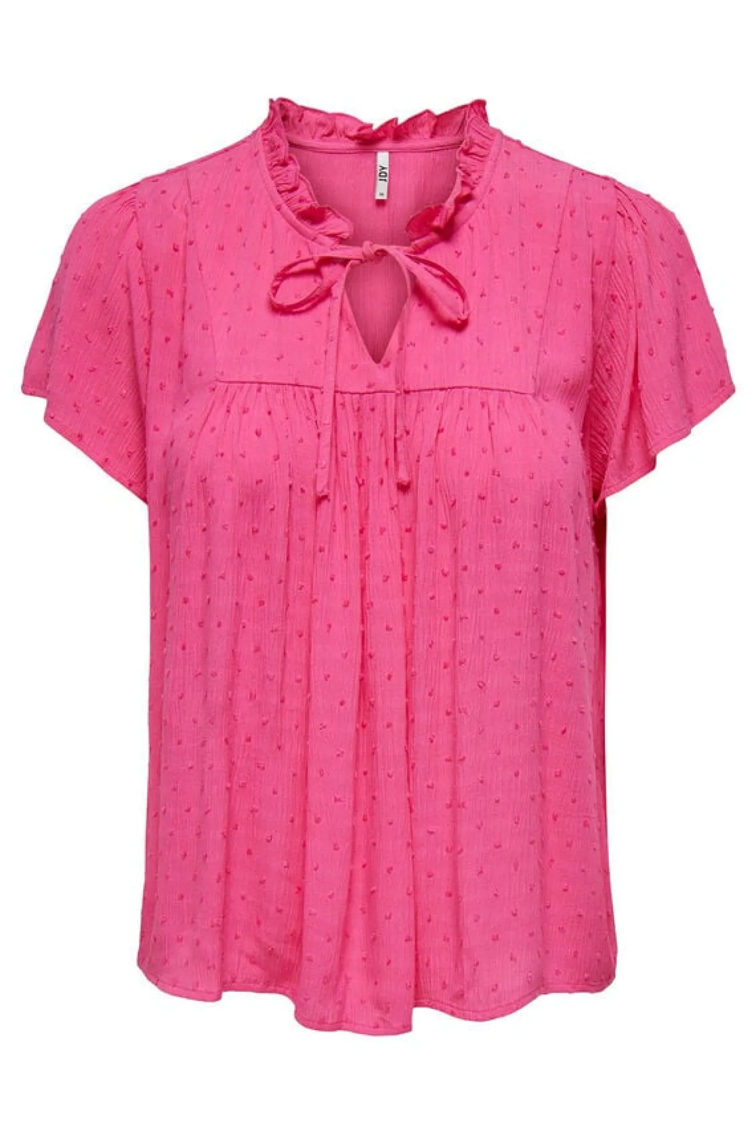 Blusa De Manga Curta, Gola Com Folhos E Decote Em Bico Com Lacada.