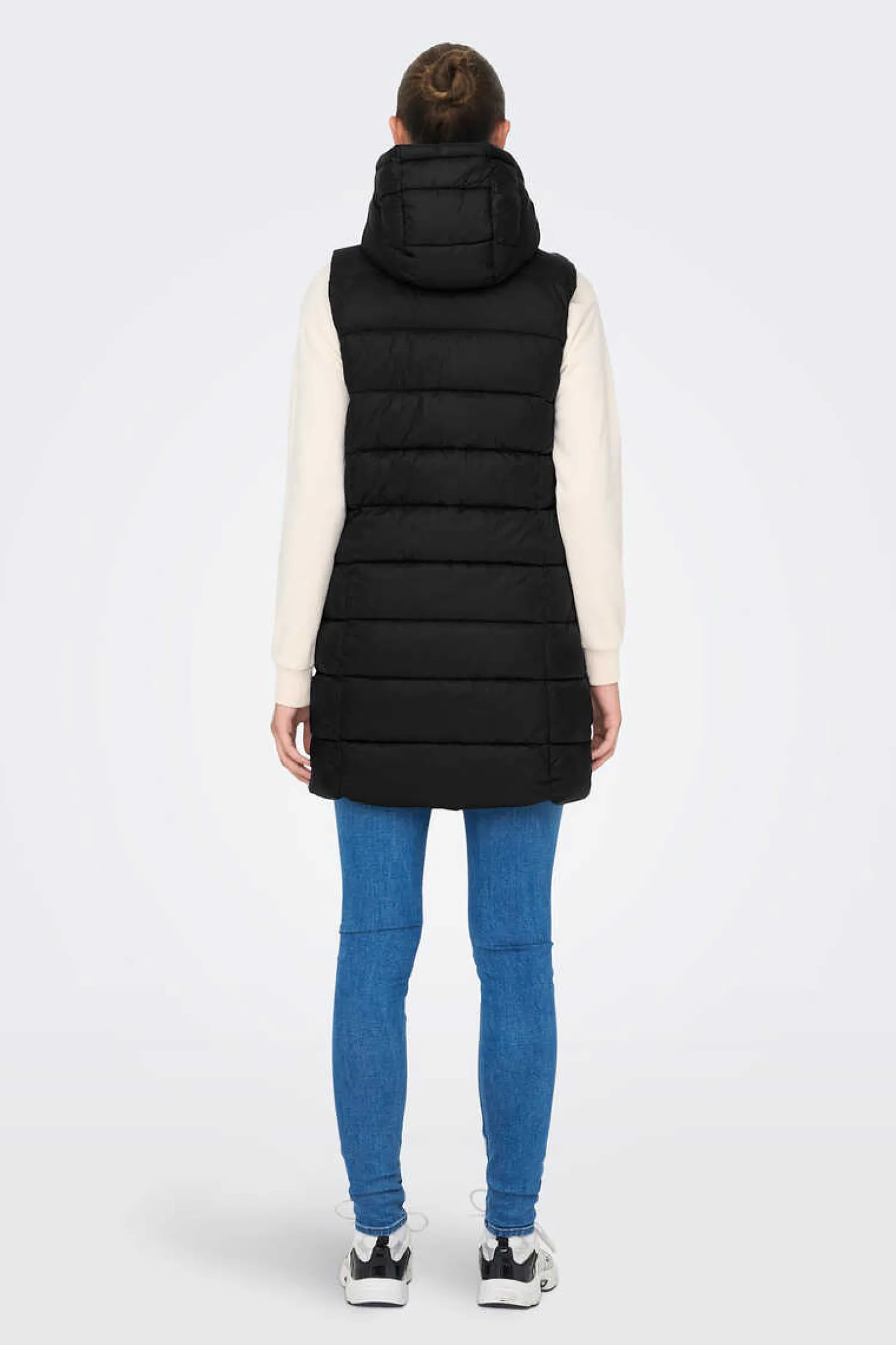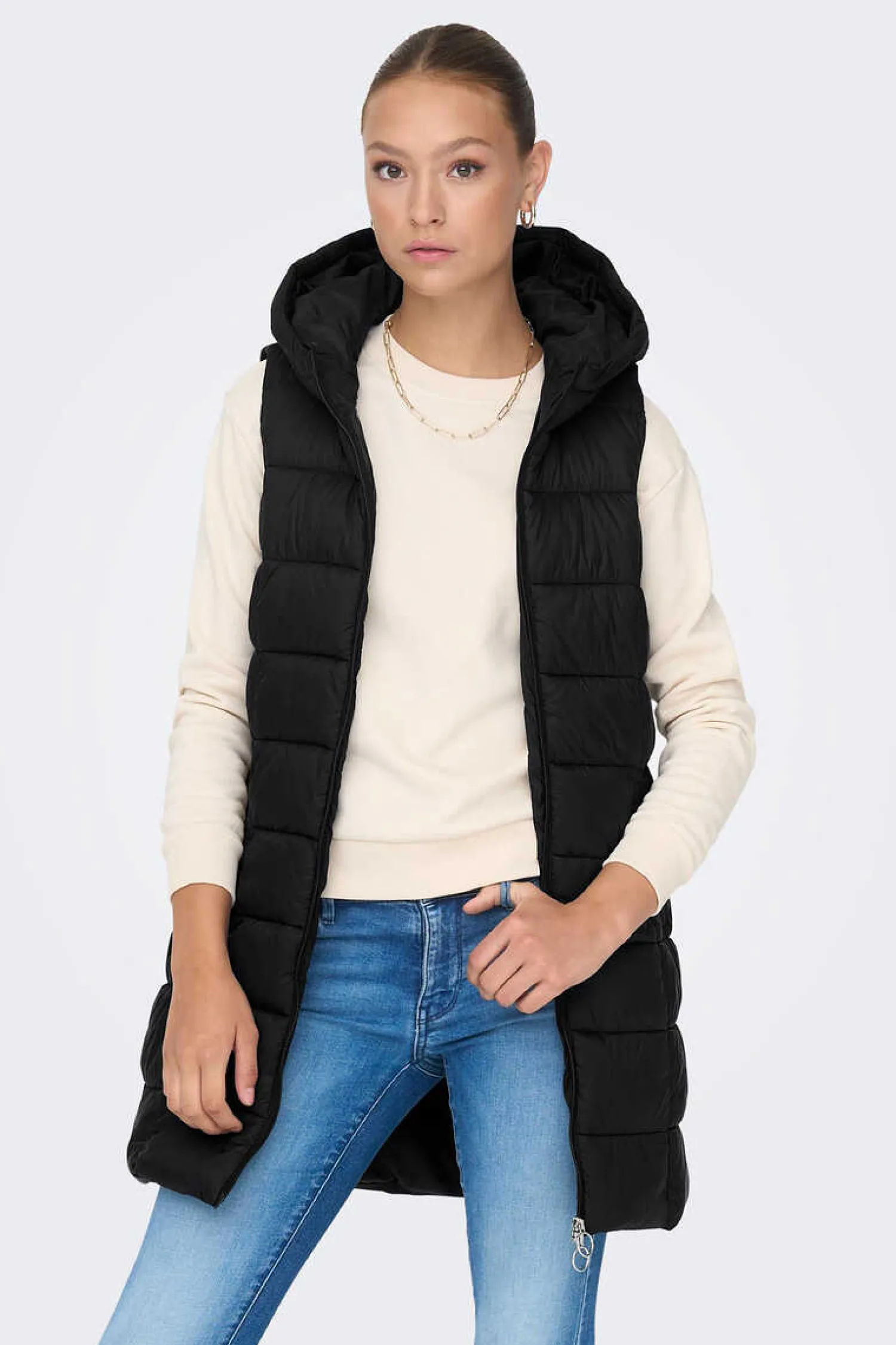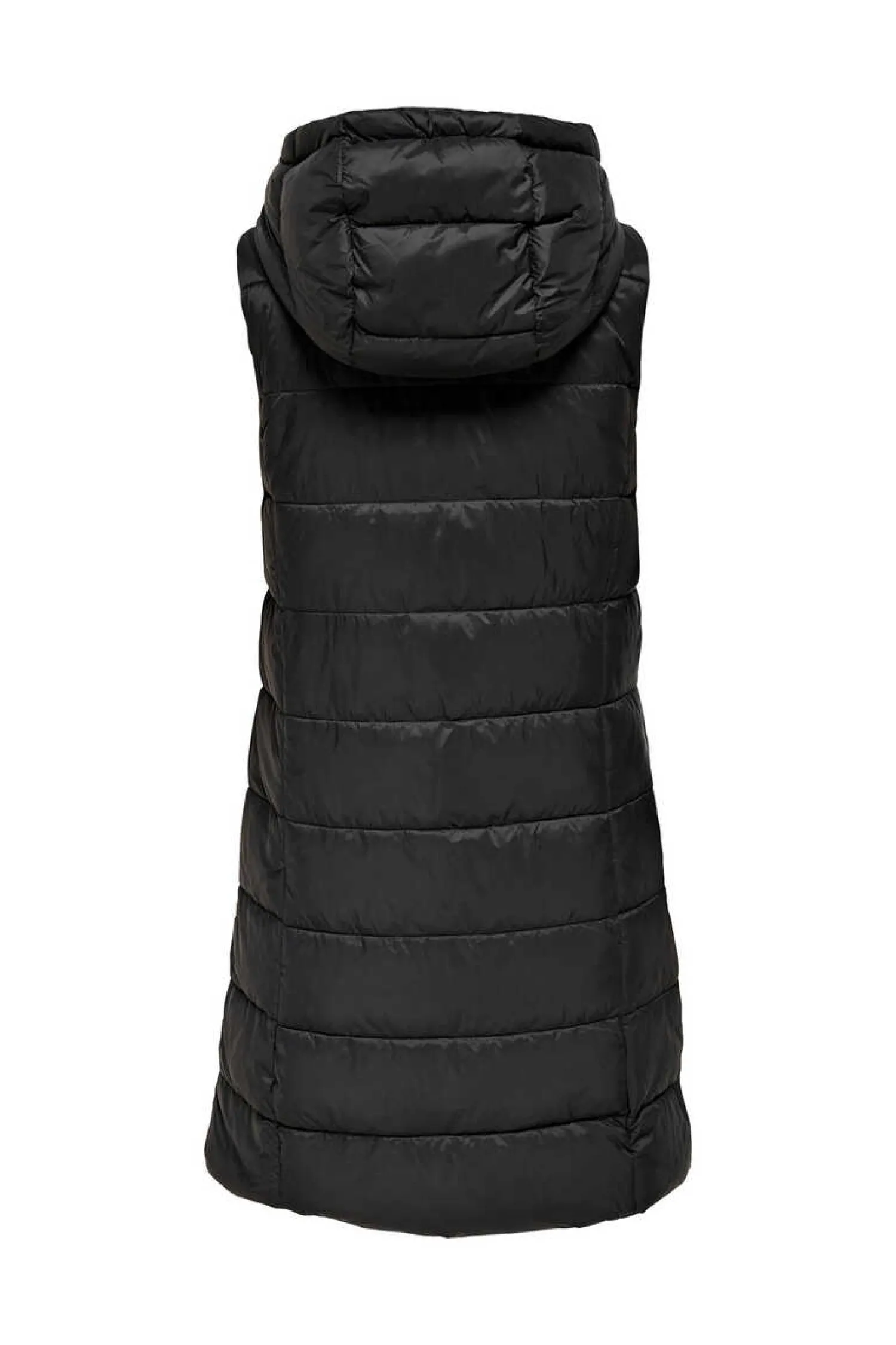 Colete Comprido Acolchoado Com Capuz. Sem Mangas. Fecho-Eclair Frontal E Dois Bolsos Laterais Com Botoes.
