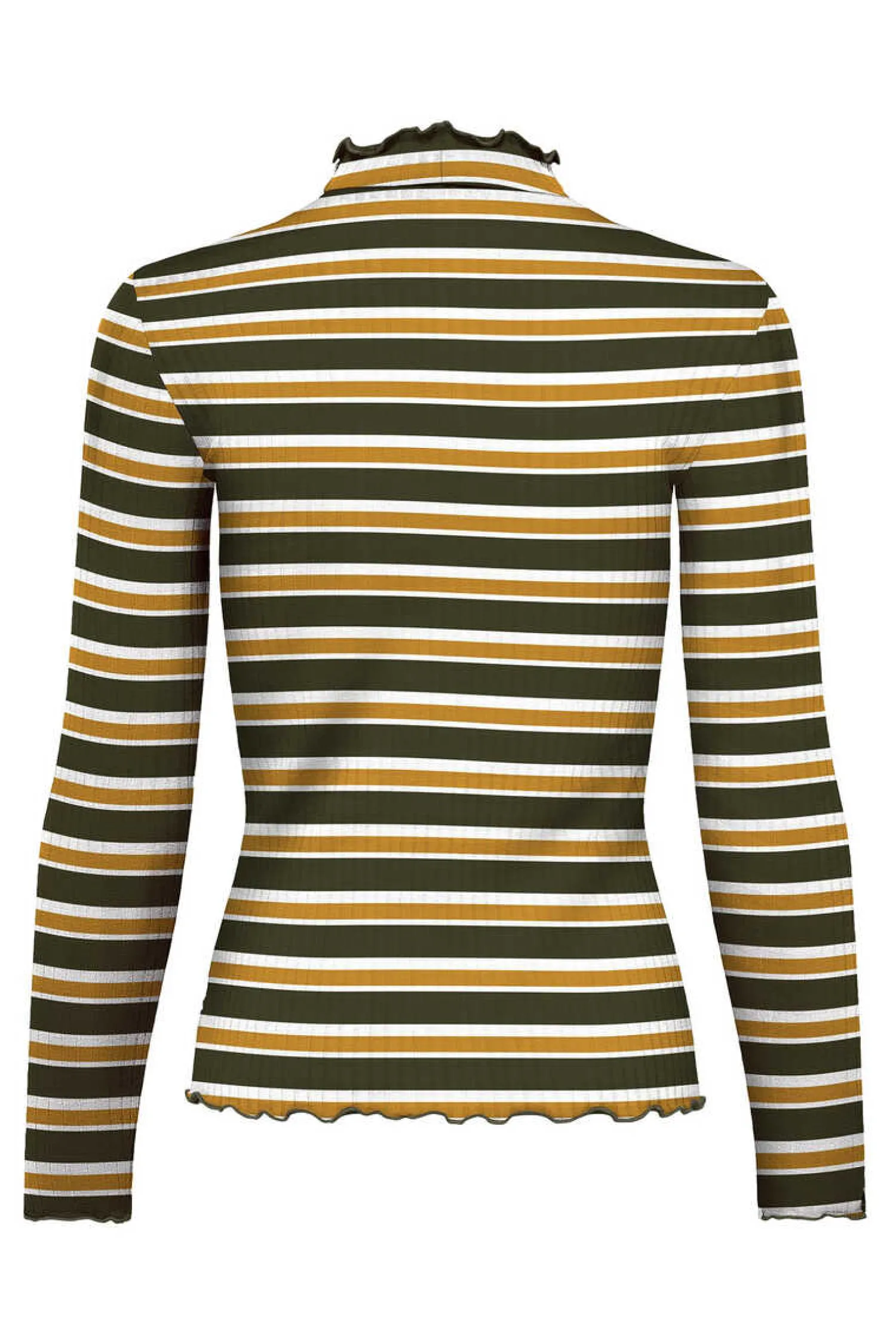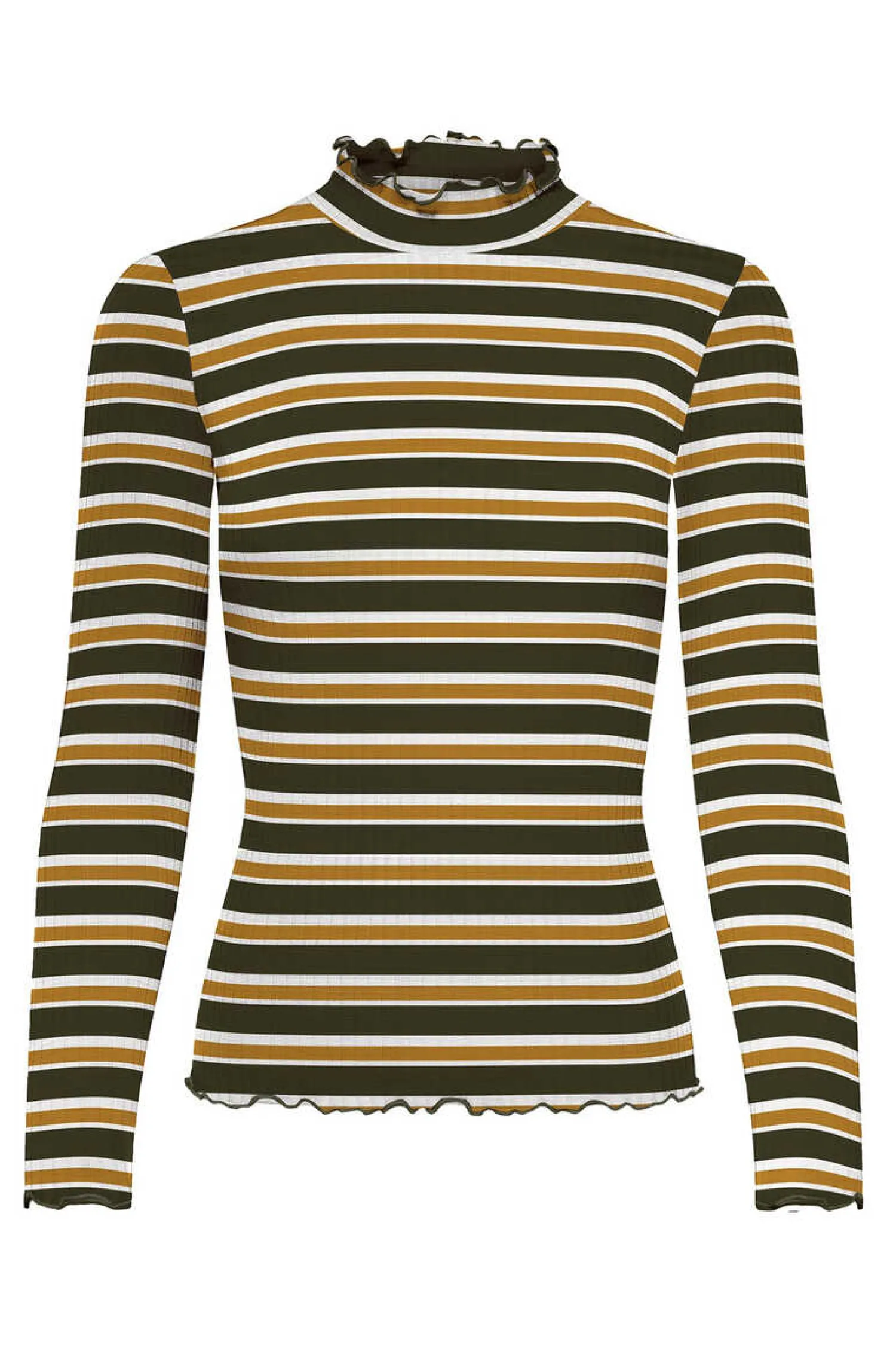 Top De Manga Comprida Canelado, Com Gola Alta E Bordas Com Folhos.
