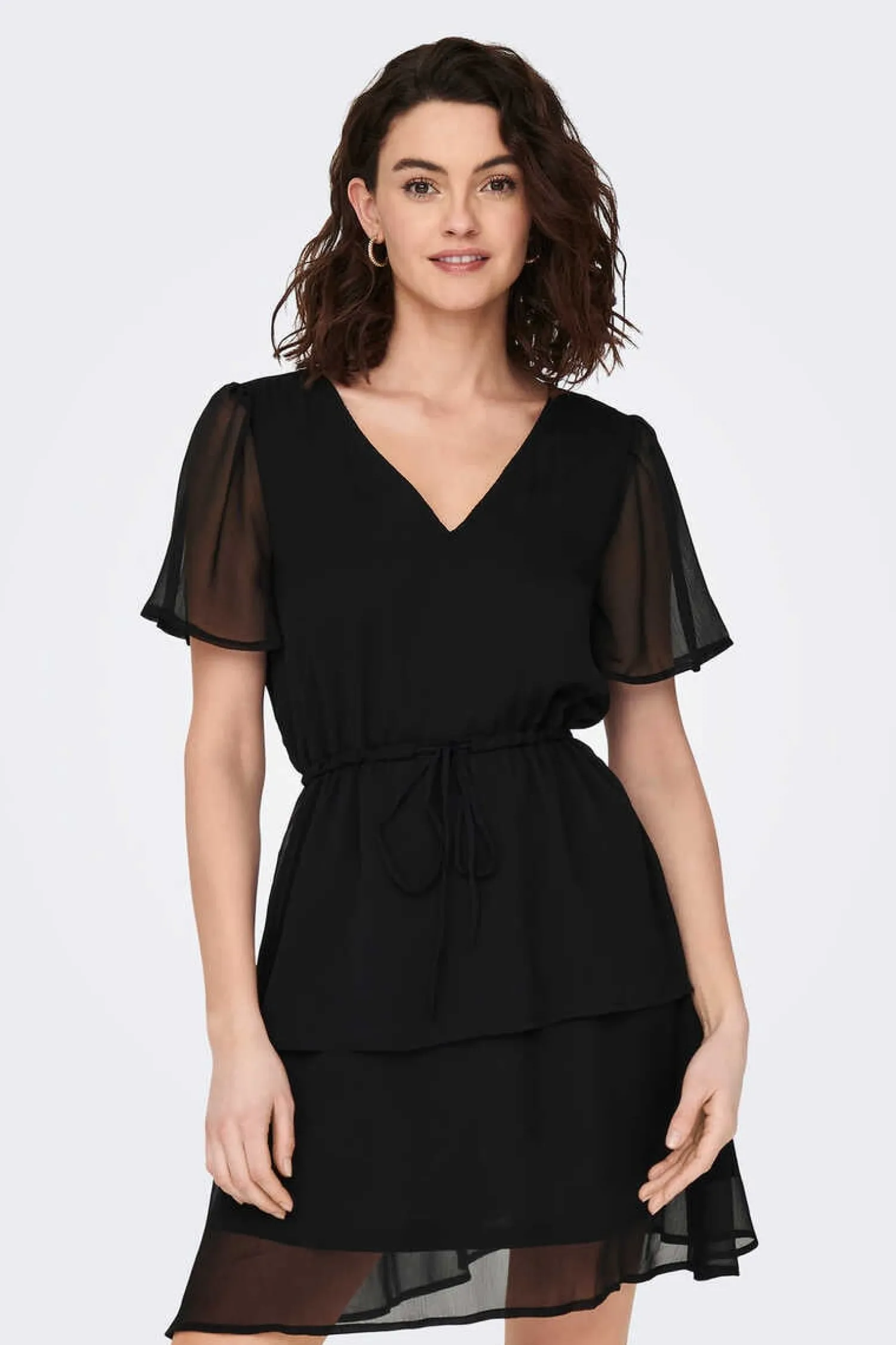 Vestido Curto, Manga Curta Com Folhos E Decote Em Bico. Paineis De Folhos E Cintura Com Laco Ajustavel.