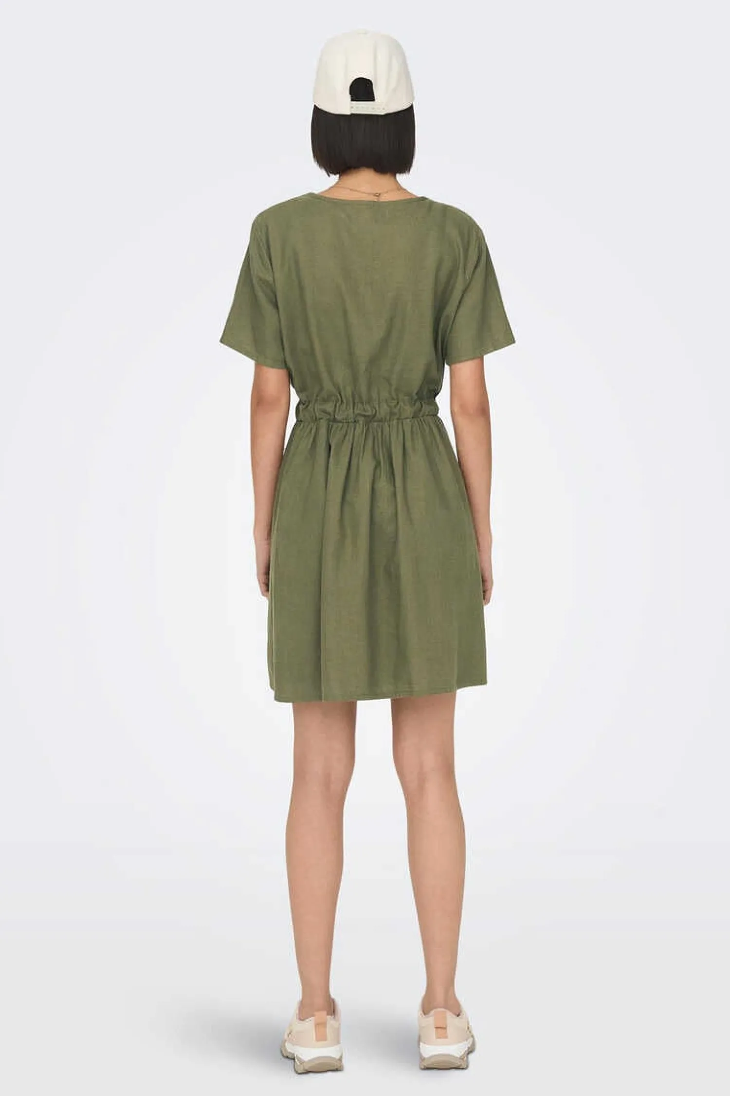 Vestido Curto De Mistura De Linho Com Decote Em Bico E Mangas Curtas. Cintura Ajustavel Com Cinto De Lacada Do Mesmo Tecido.