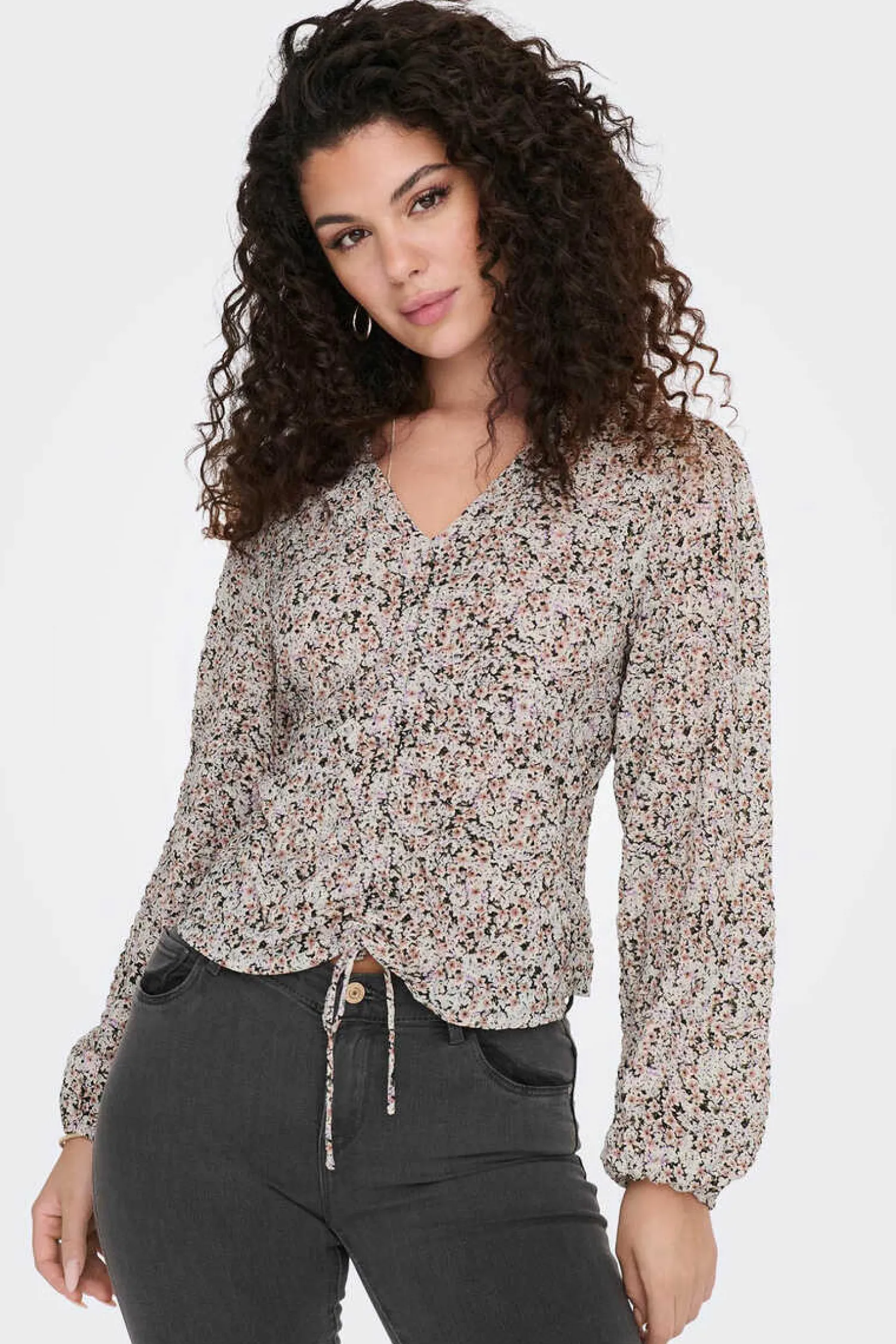 Blusa De Manga Comprida Com Gola Em Bico E Franzido A Frente.