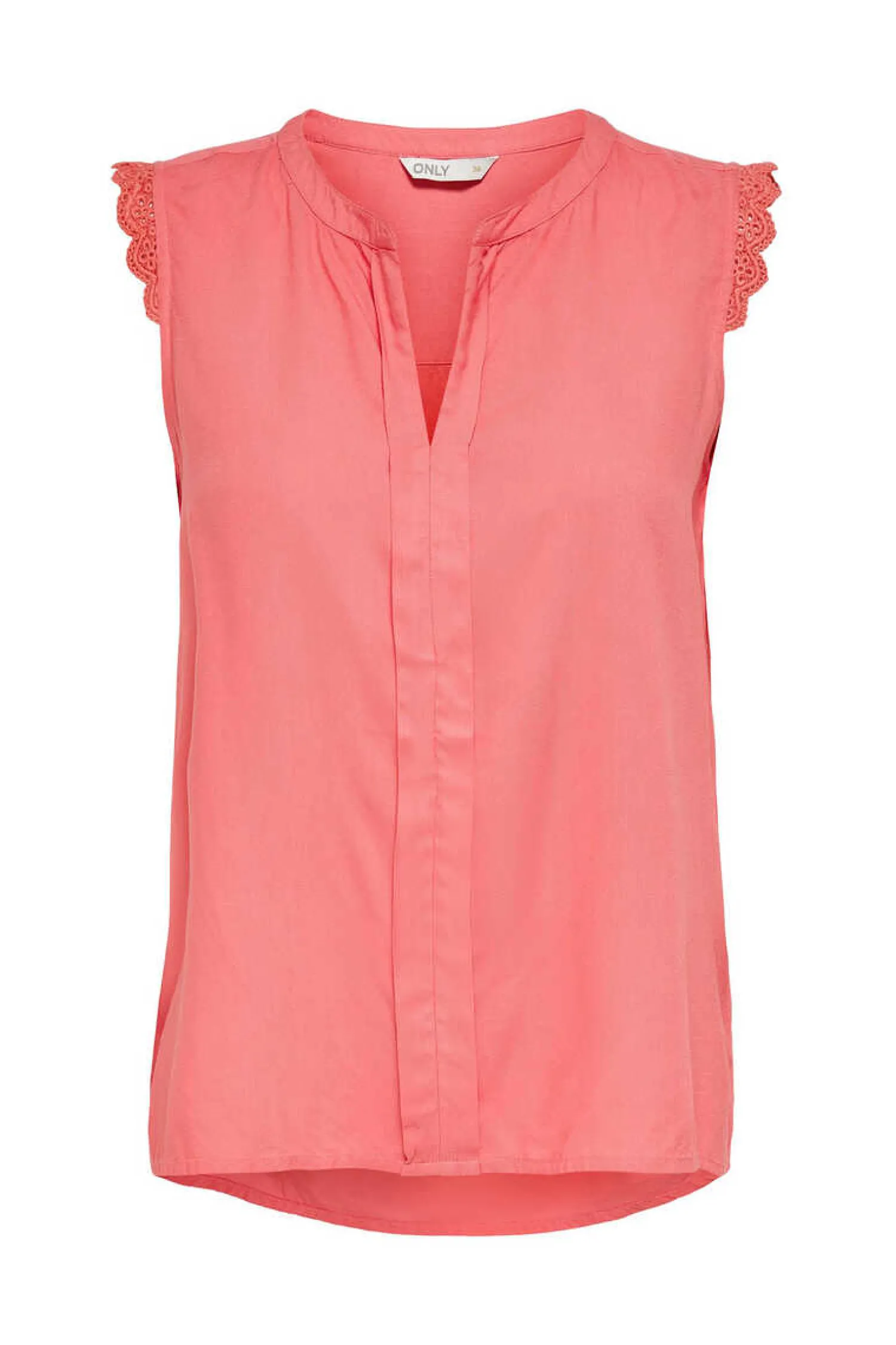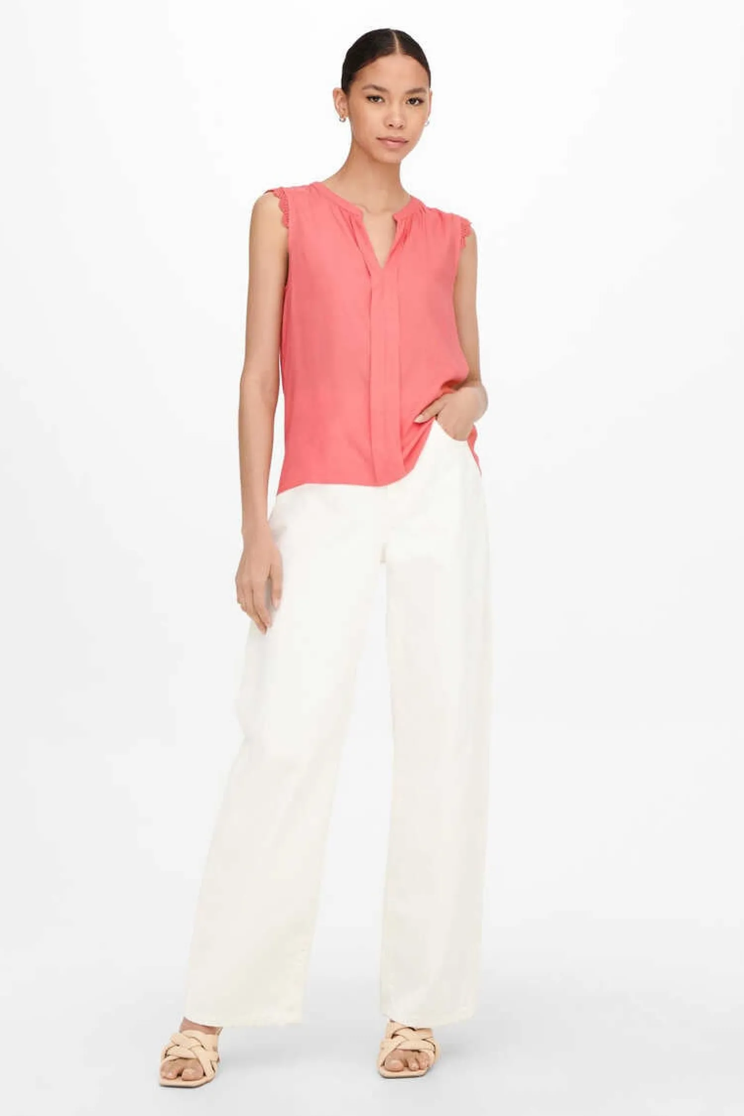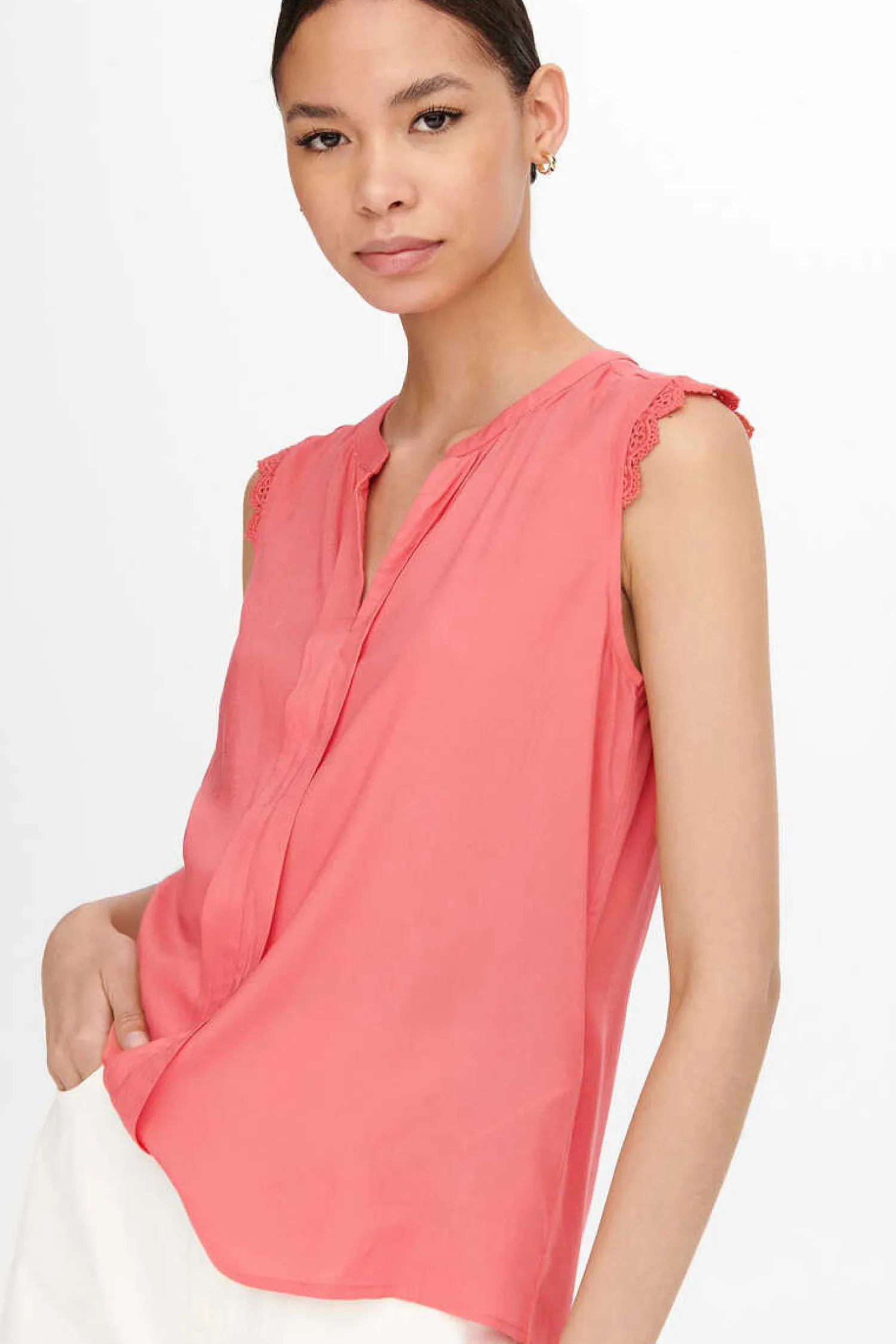 Top Sem Mangas Com Decote Em Bico, Detalhe De Agulha De Crochet Nas Cavas, Corte Folgado E Parte Posterior Mais Comprida.