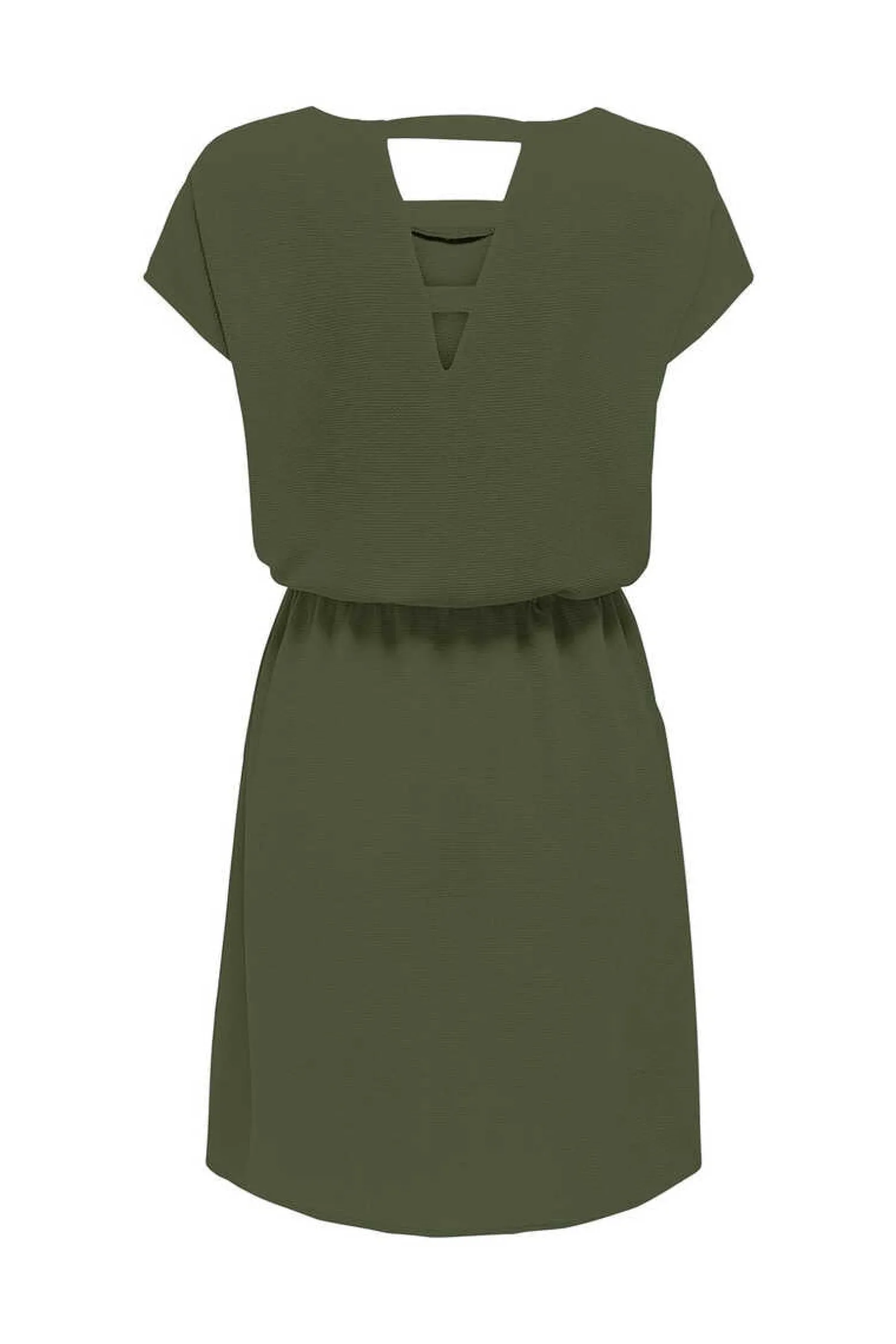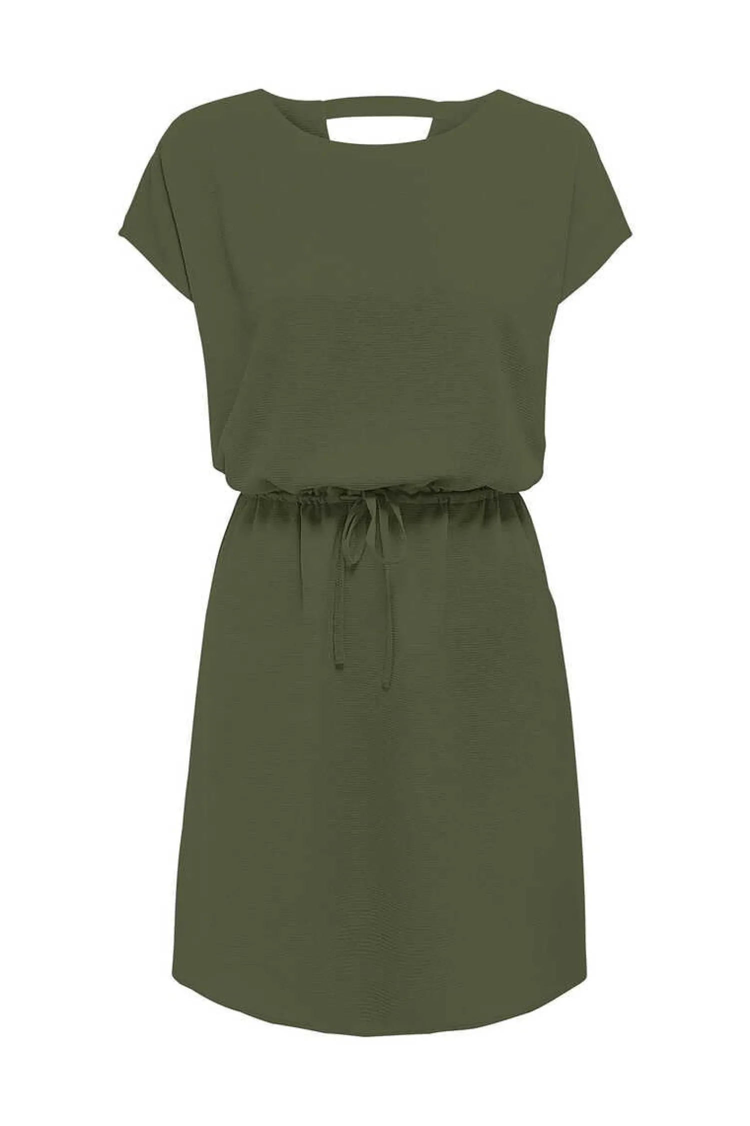 Vestido Mini Liso De Manga Curta, Abertura Nas Costas E Cintura Ajustavel Com Cordao.