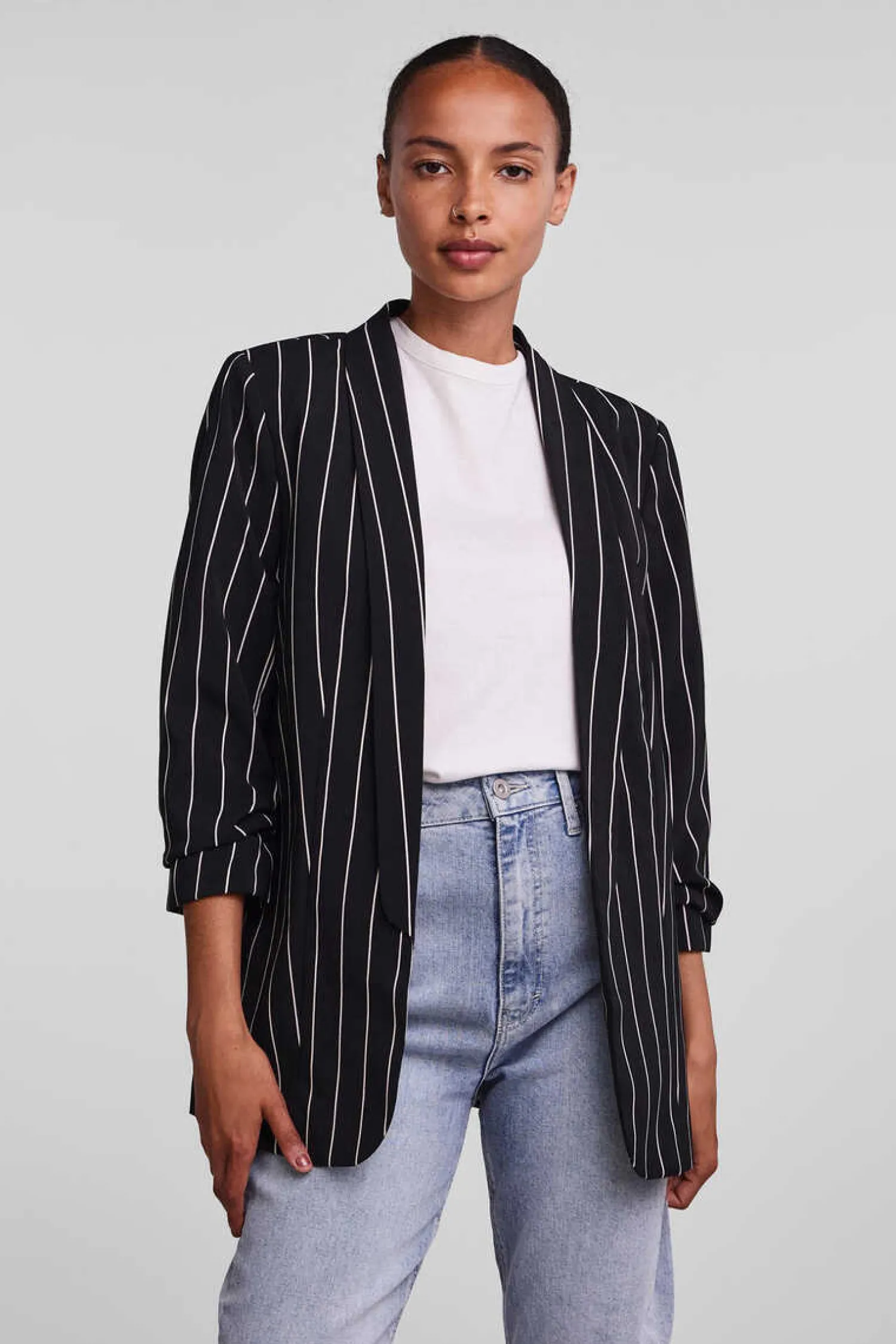 Casaco Estilo Blazer Fluido, De Manga 3/4. Com Lapelas, Sem Botoes.