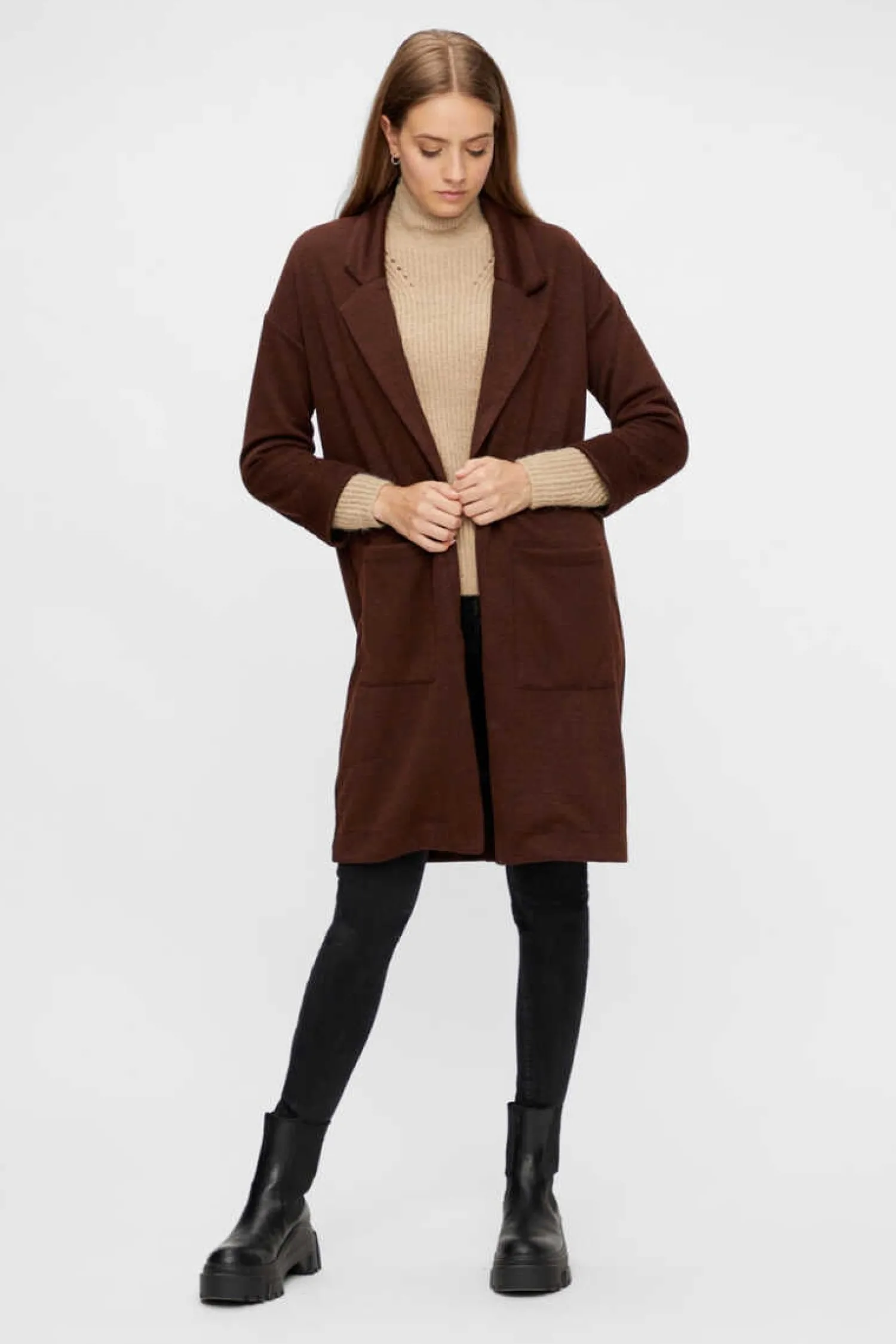 Casaco Comprido Sem Fecho. De Manga Comprida E Decote Com Lapelas. Dois Bolsos A Frente E Detalhe De Punhos Com Dobra.
