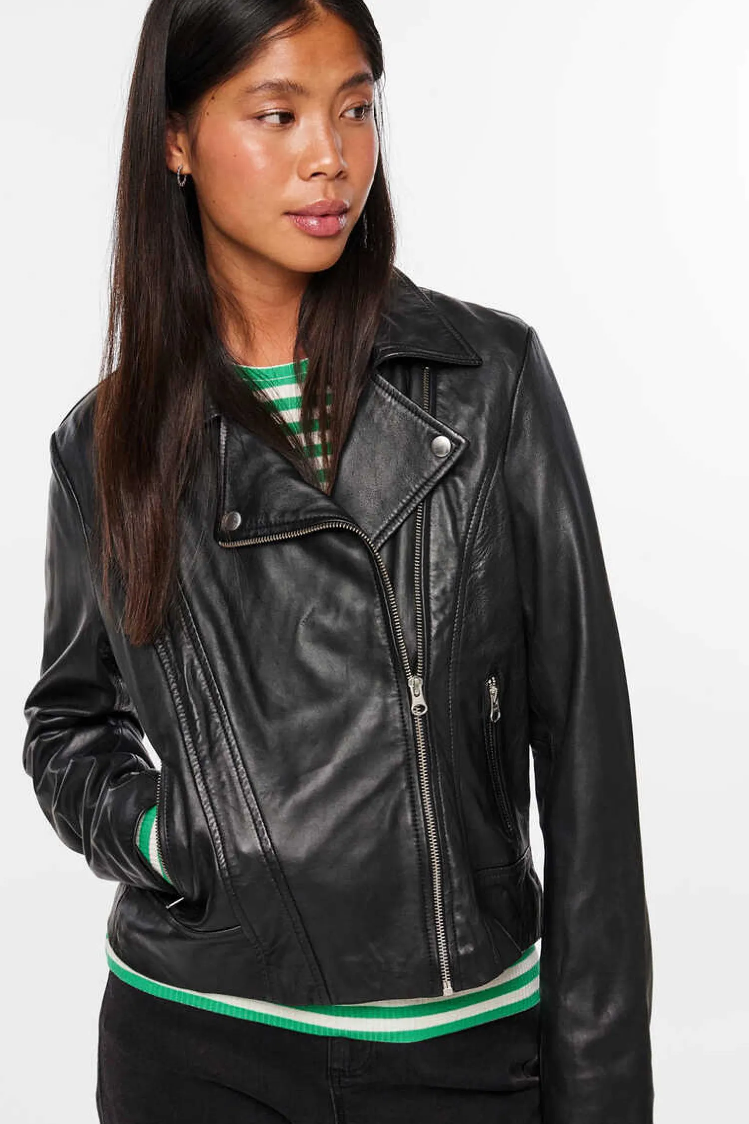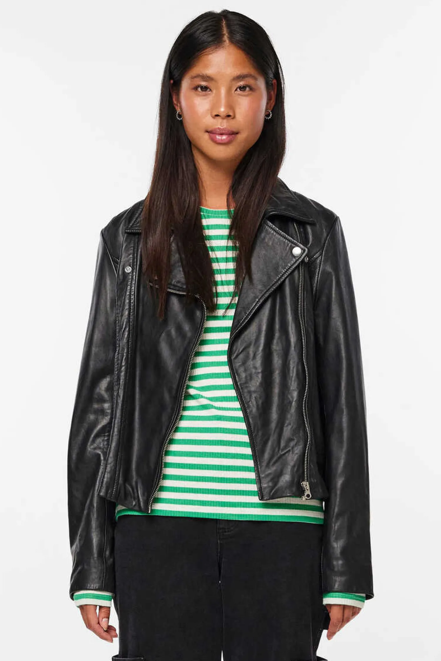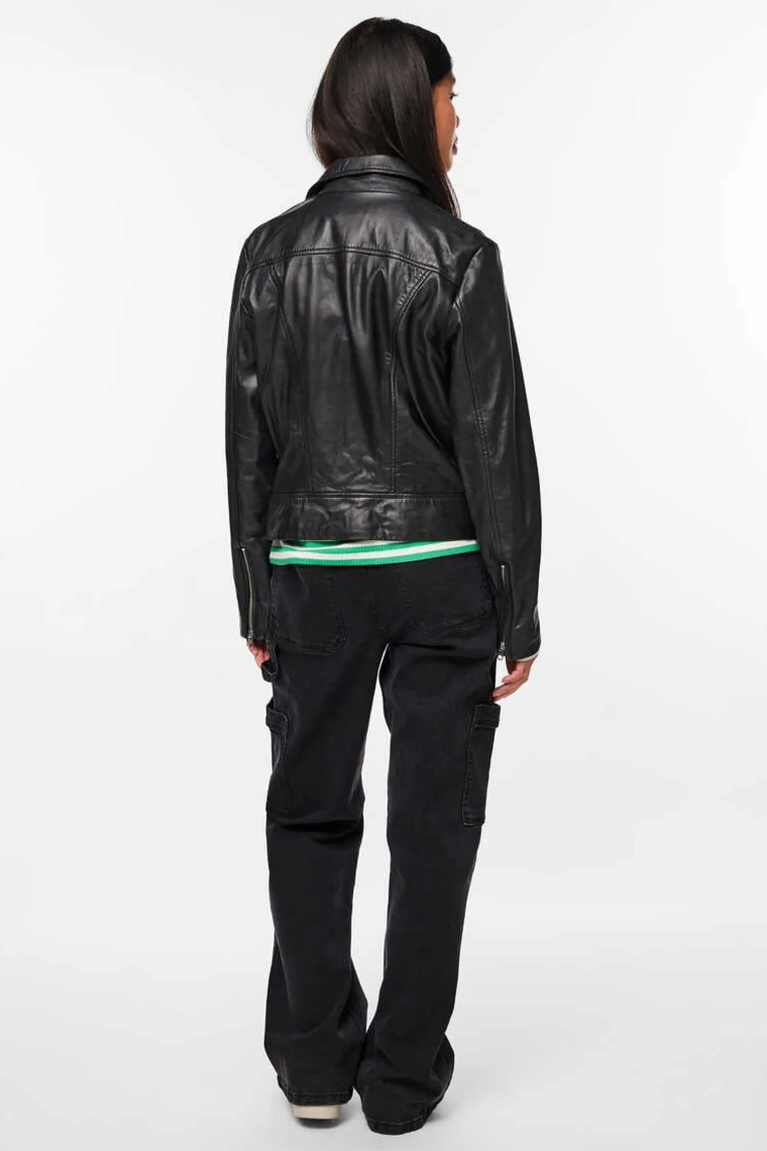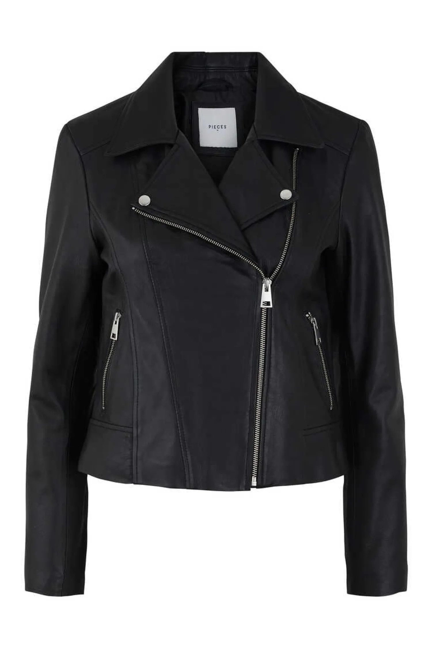 Casaco De Couro De Managa Comprida E Decote Com Lapela. Fecho A Frente Em Forma De Fecho-Eclair. Dois Bolsos Dianteiros Com Fecho-Eclair.
