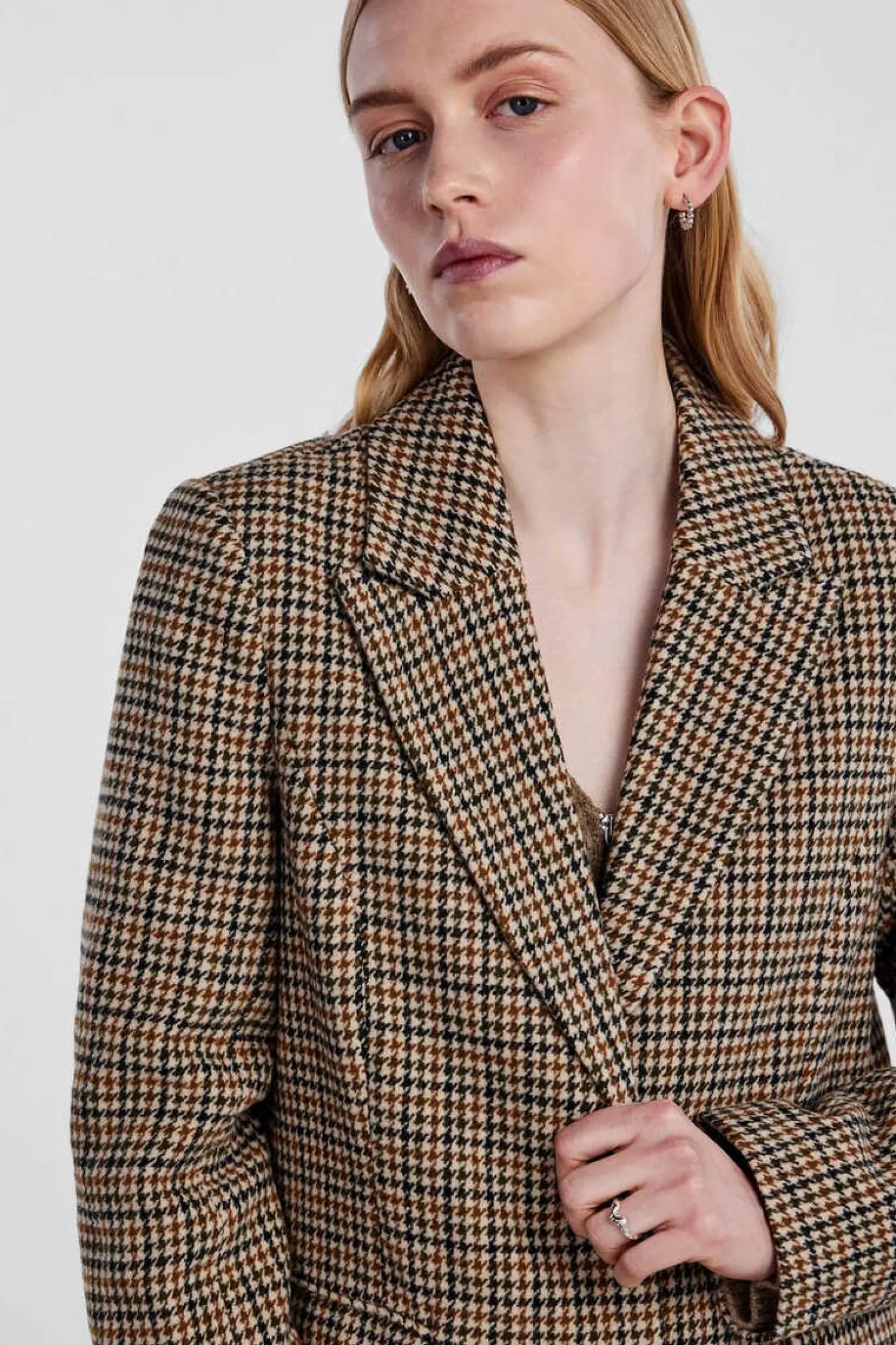 Sobretudo Midi Reto Com Gola De Lapela E Fecho A Frente De Botoes. Dois Bolsos Laterais. Estampado De Quadrados.