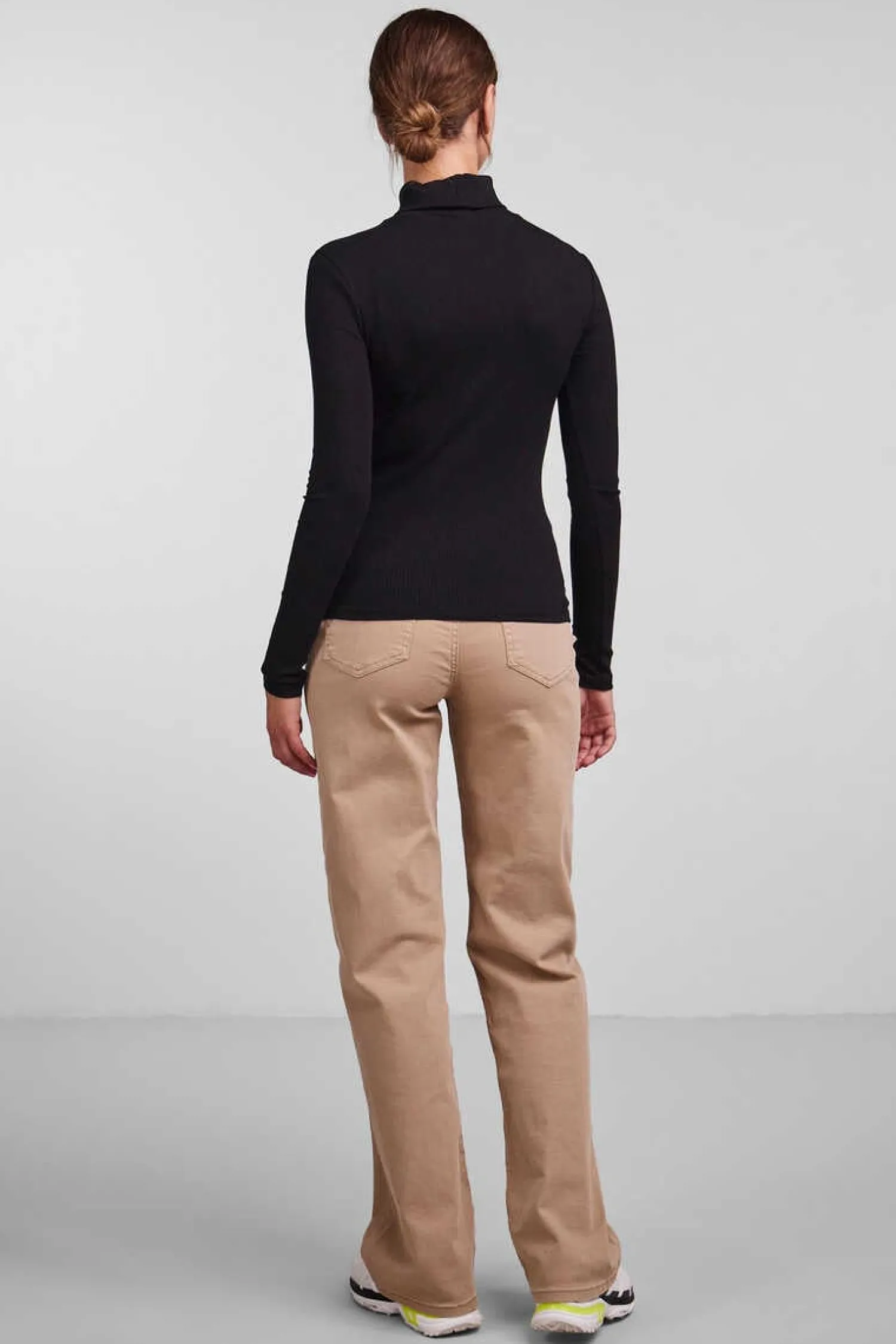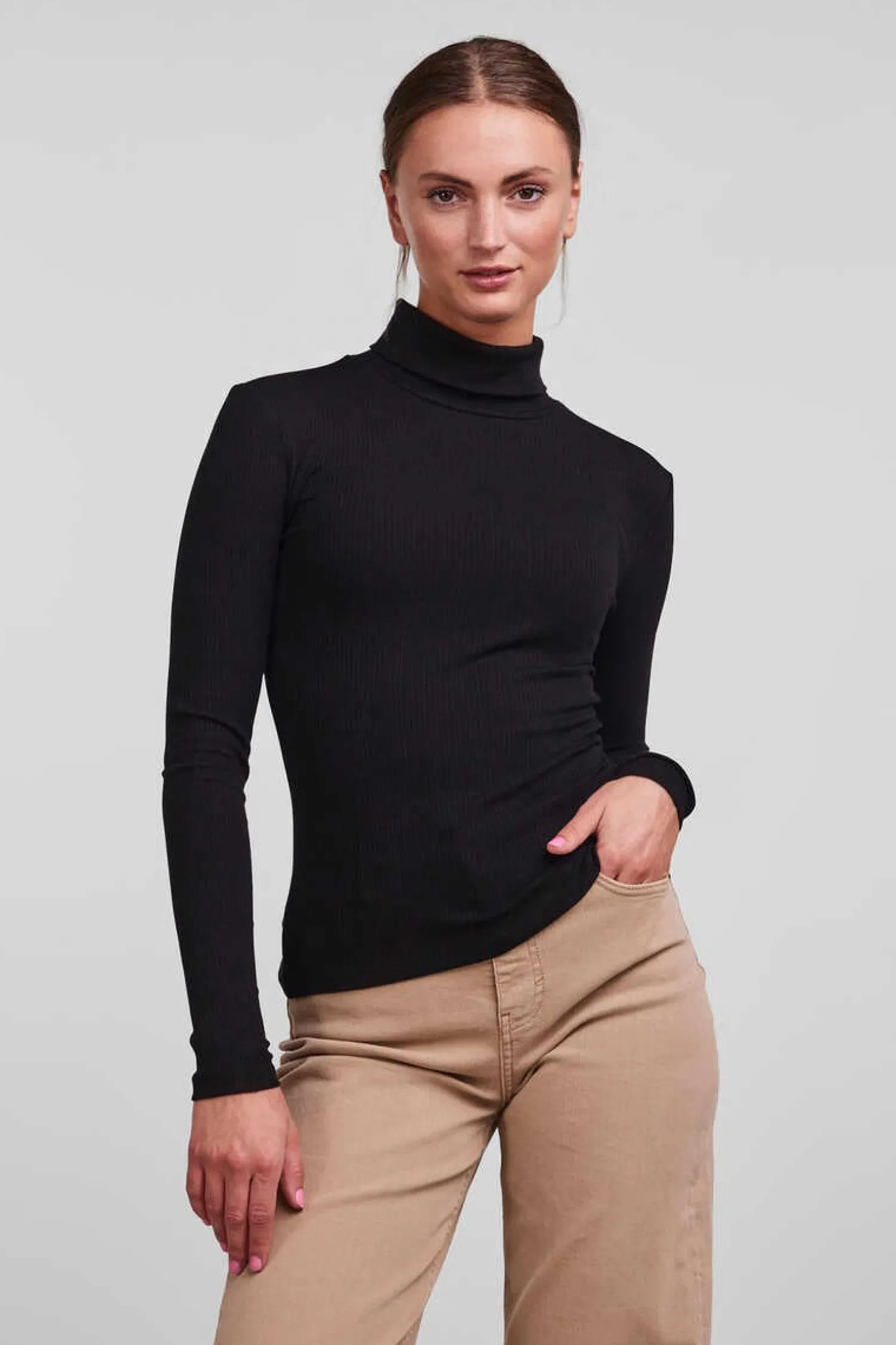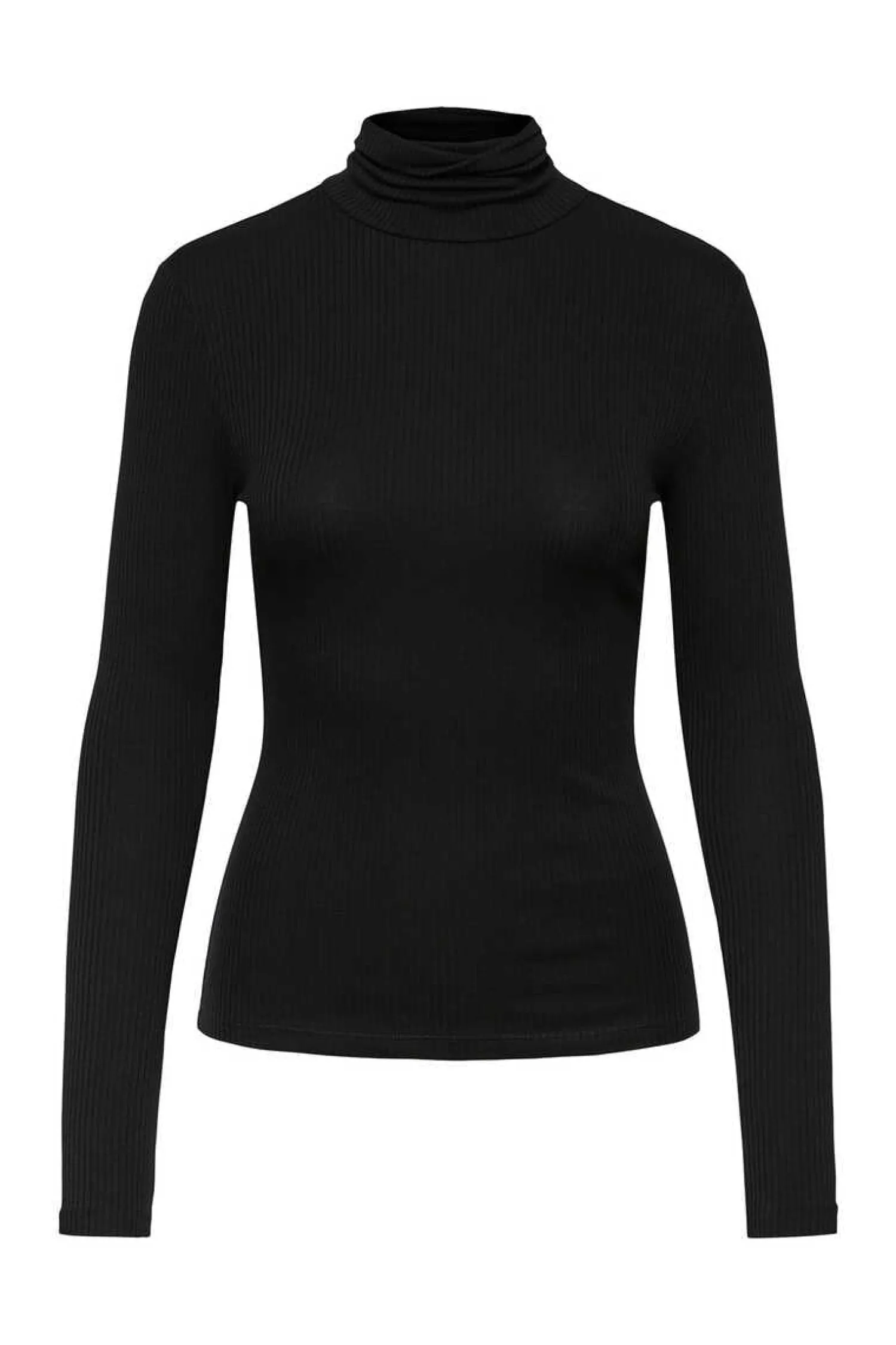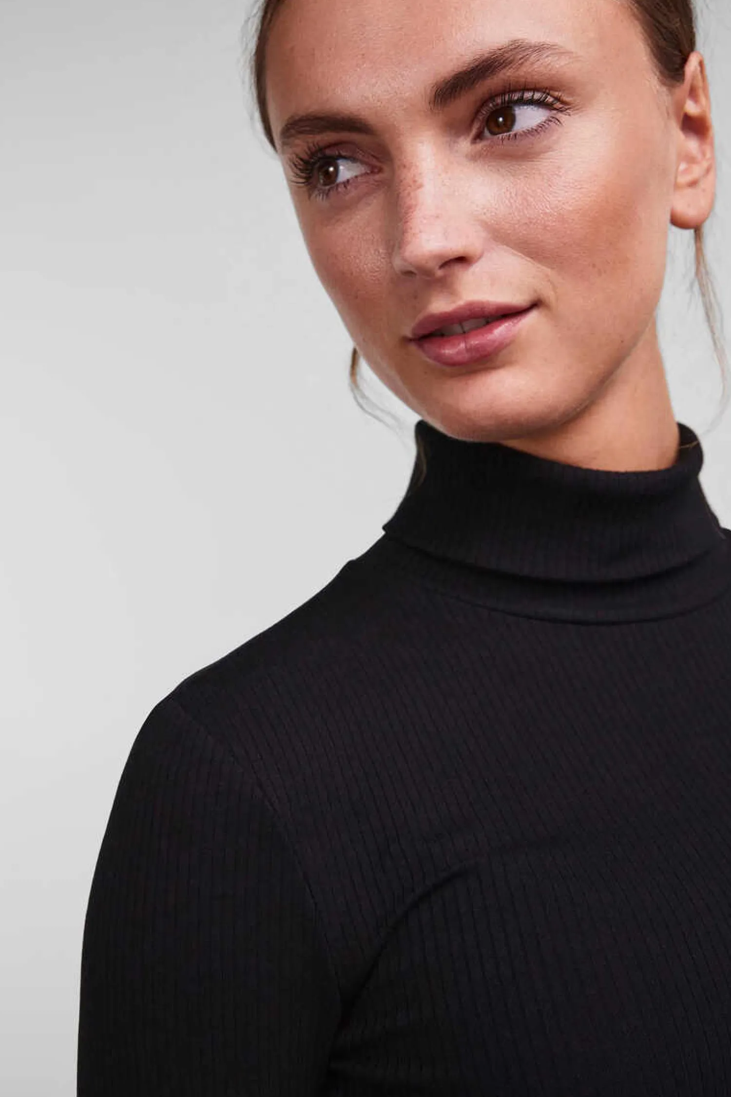 Top Efeito Canelado De Manga Comprida De Mulher, Gola Alta E Estilo Ajustado.