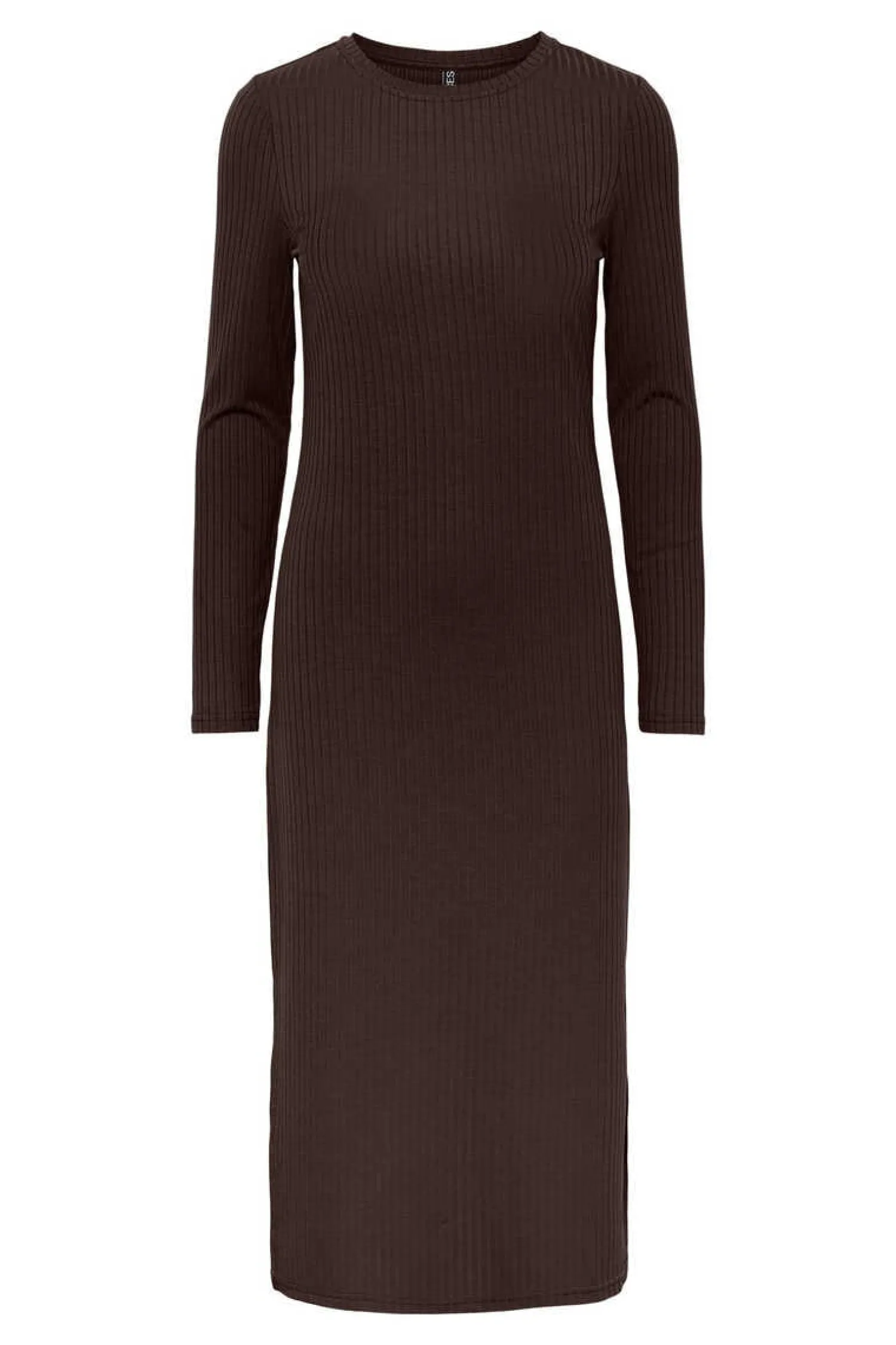 Vestido Comprido Elastico De Manga Comprida E Decote Redondo. Tecido Com Estrutura Canelada.