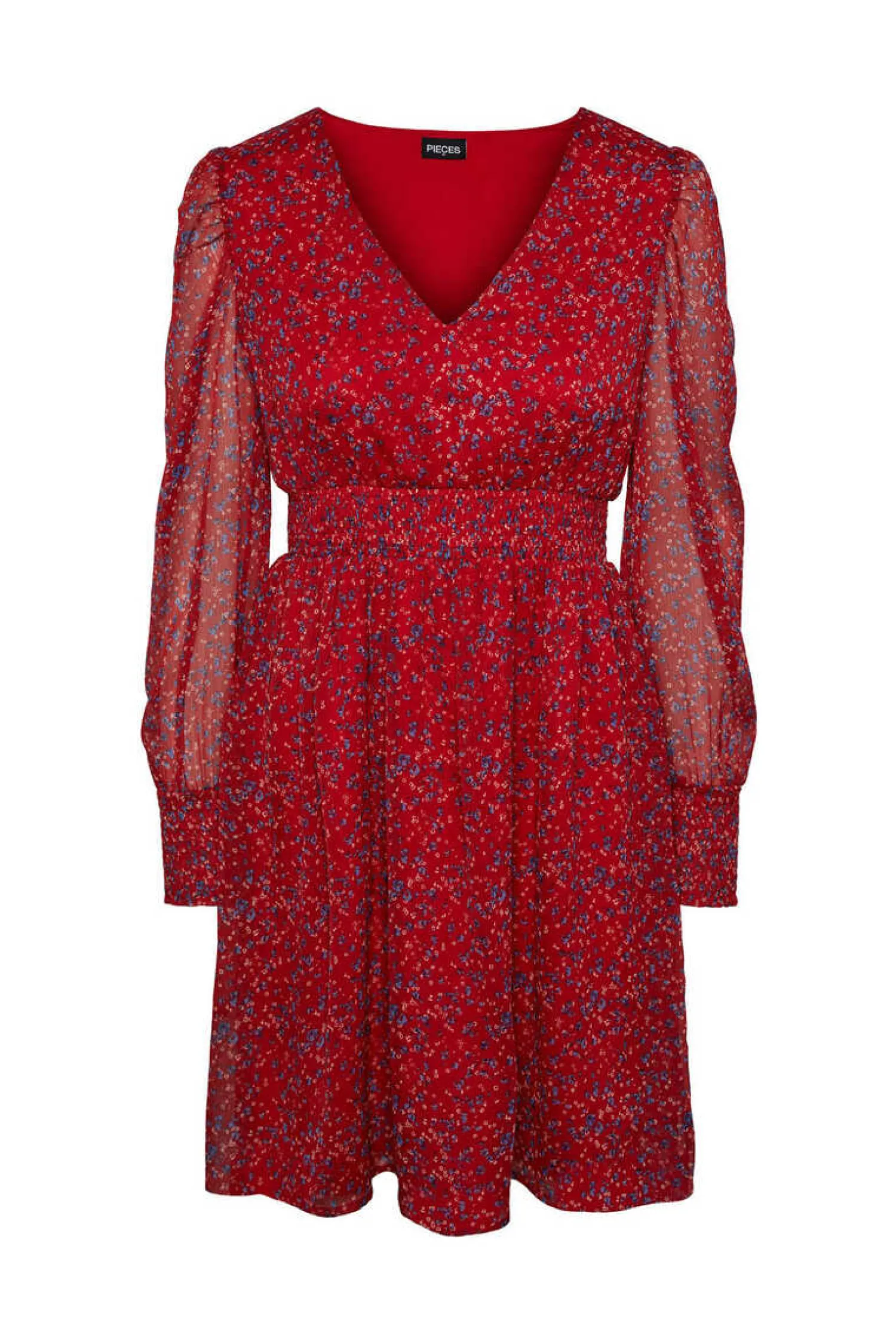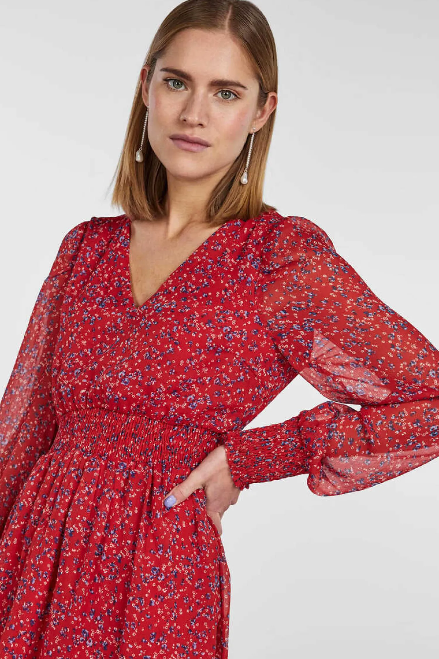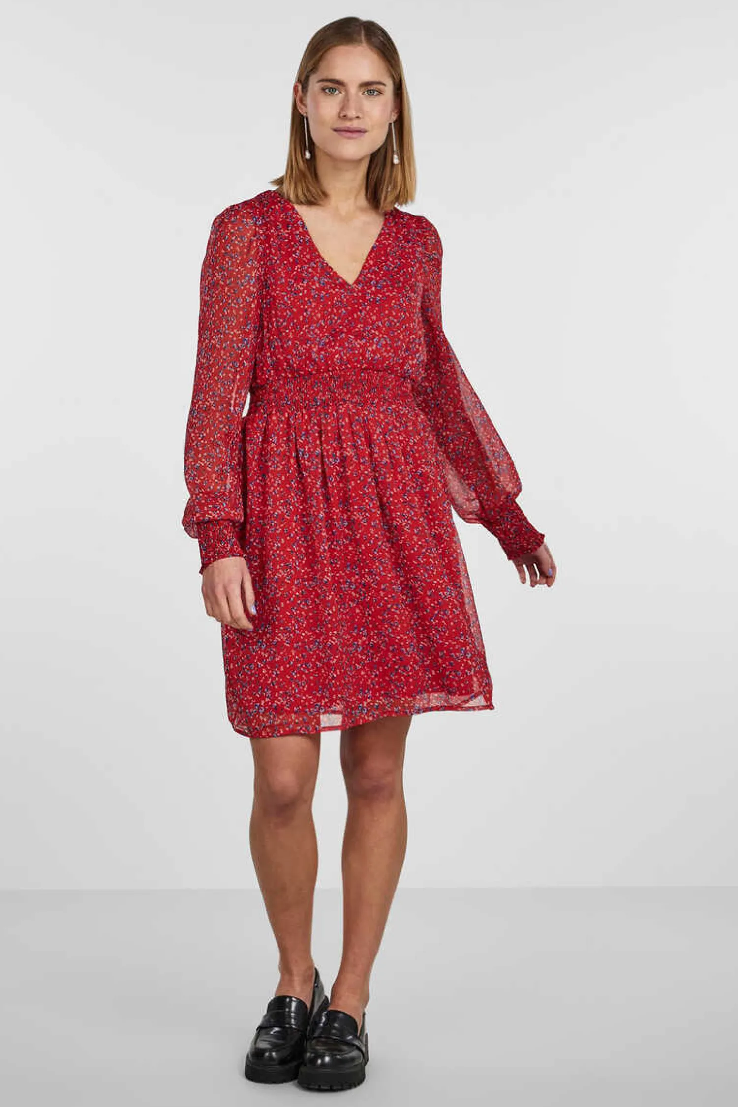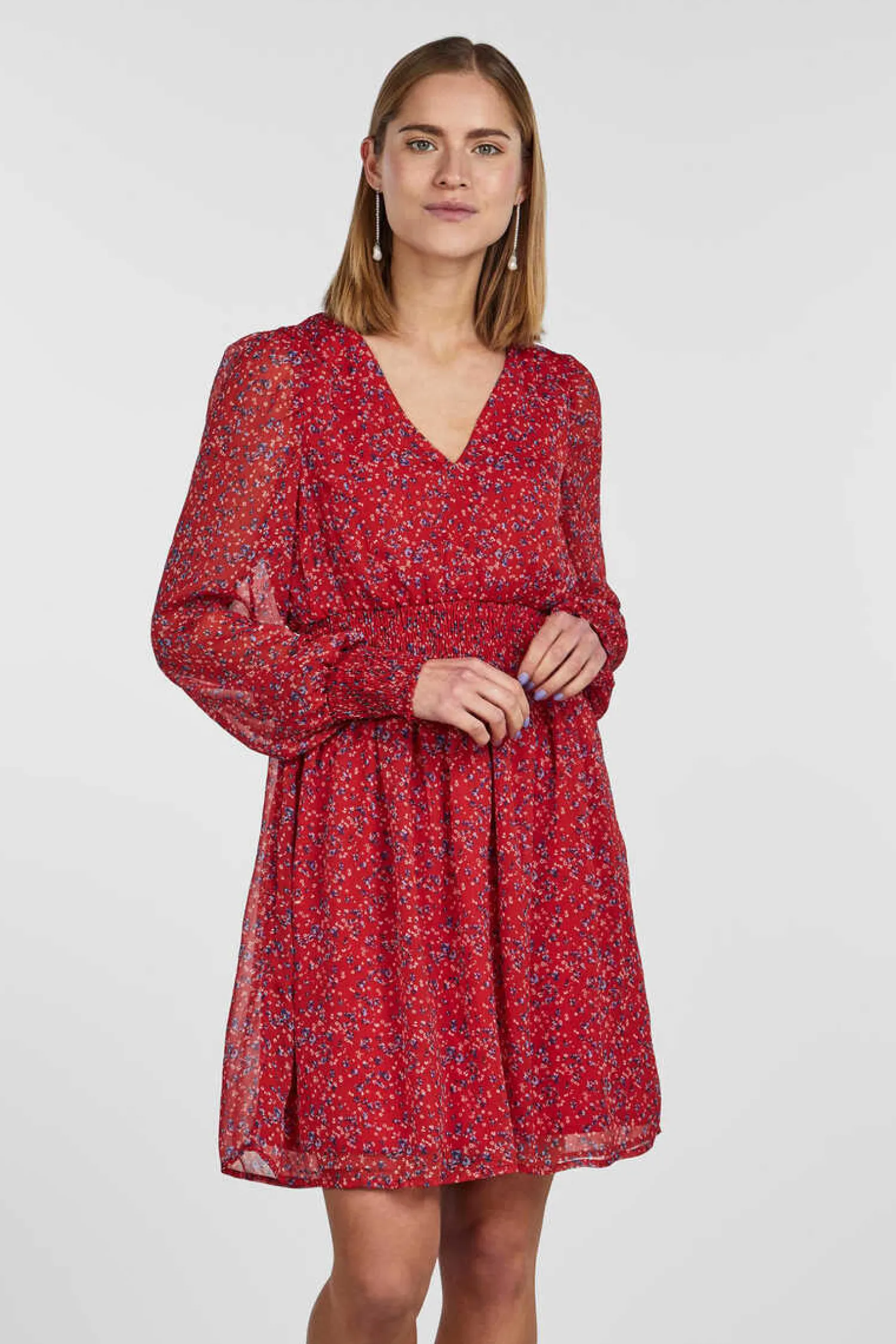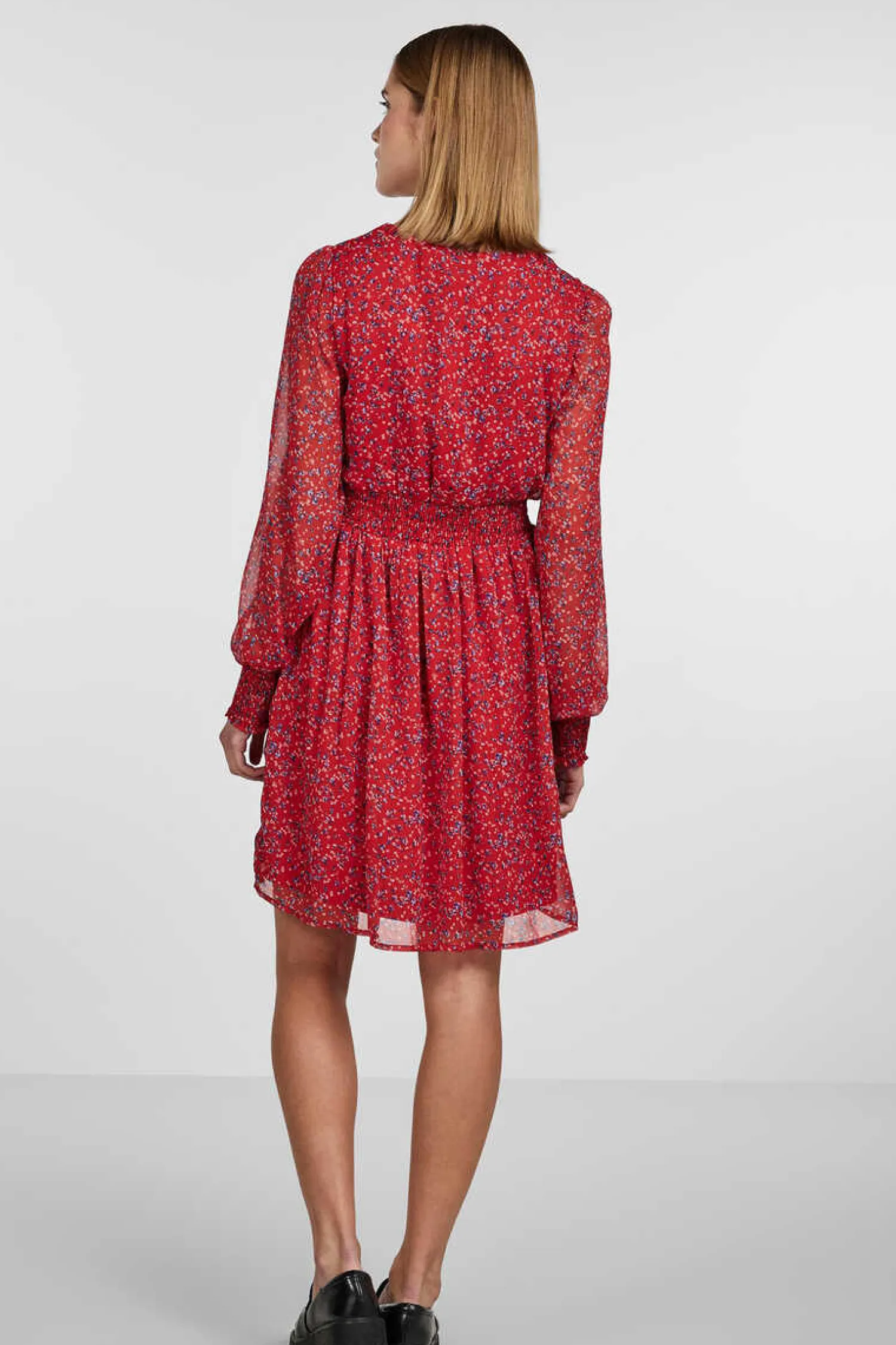 Vestido Curto De Manga Comprida E Com Estampado. Gola Em Bico. Detalhe De Cintura Elastica E Punho Franzido.