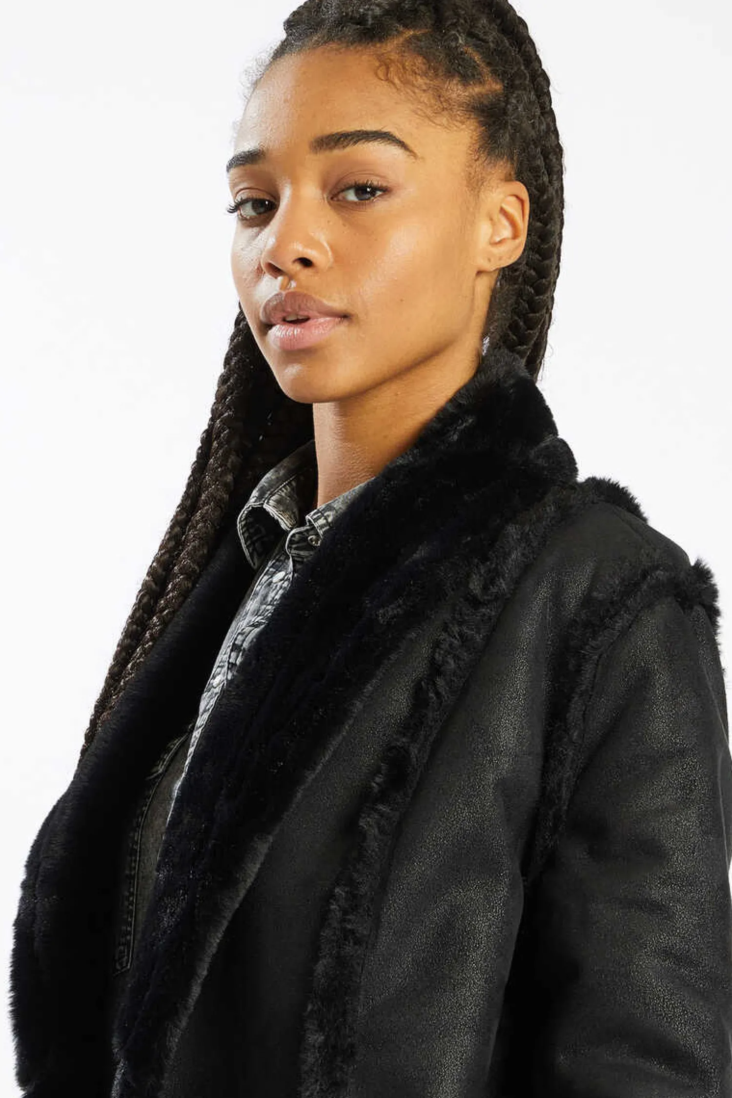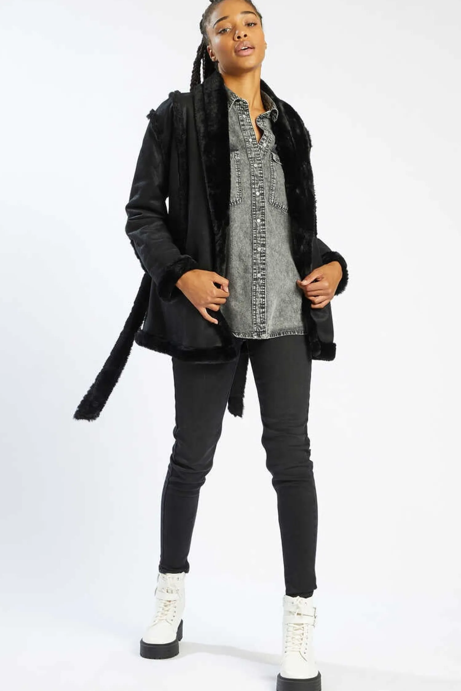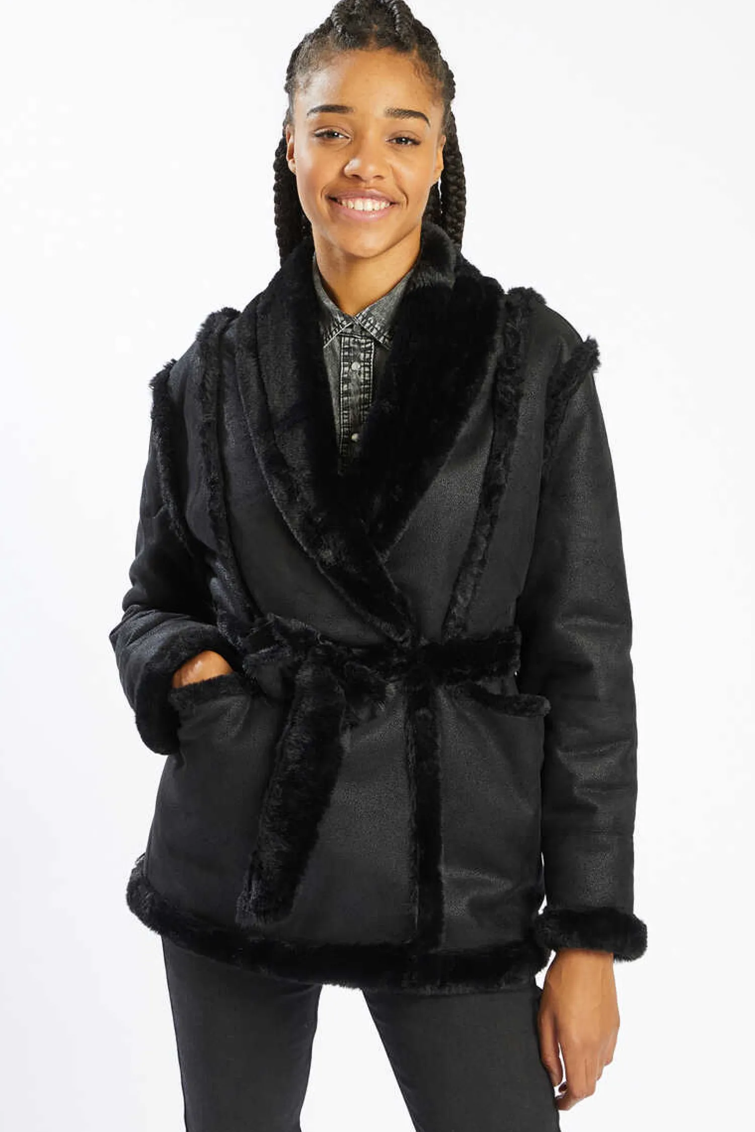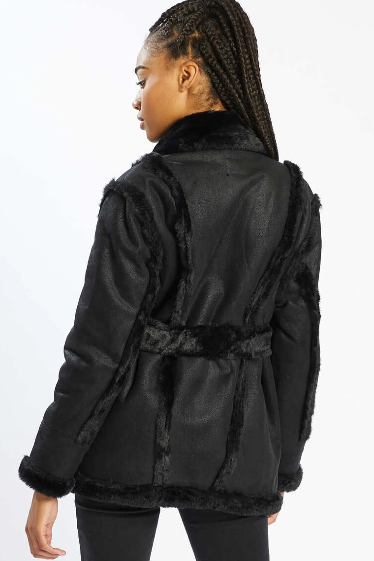 – Casaco Preto De Dois Tecidos Com Cinto.