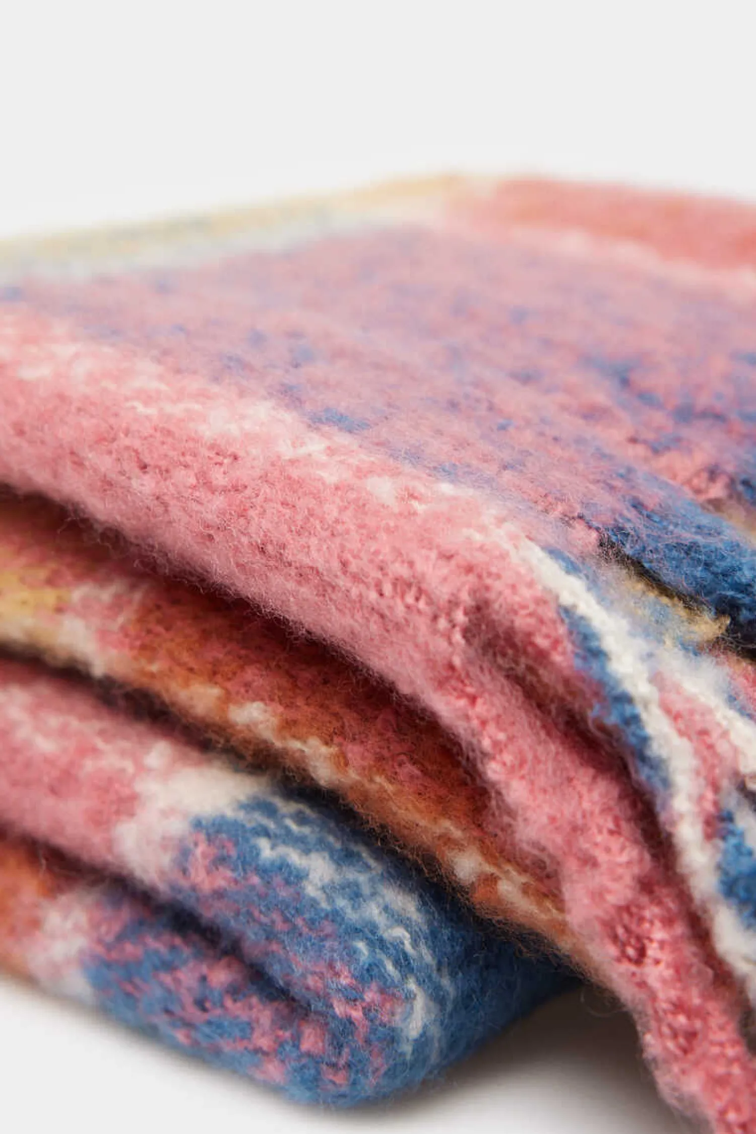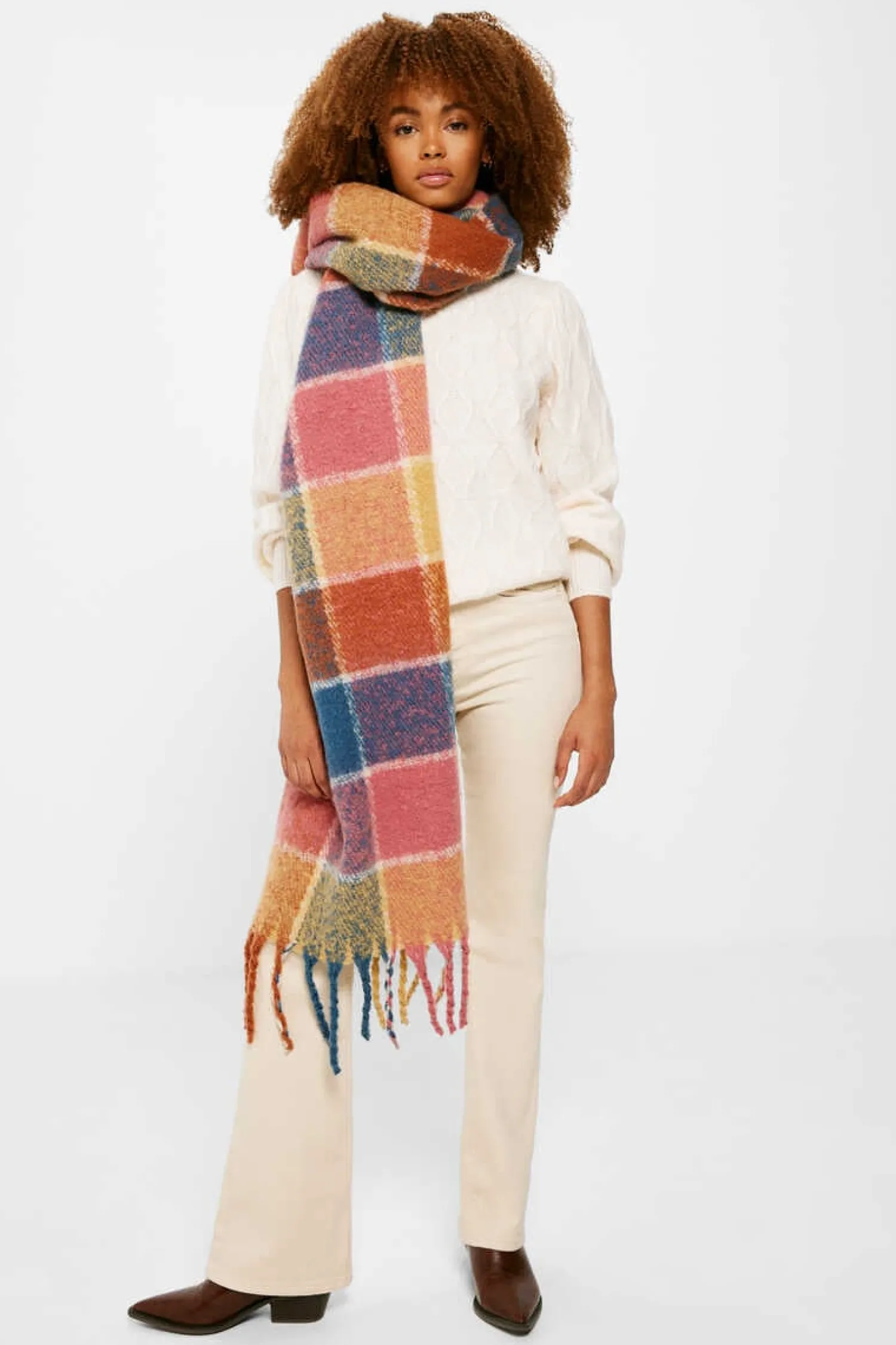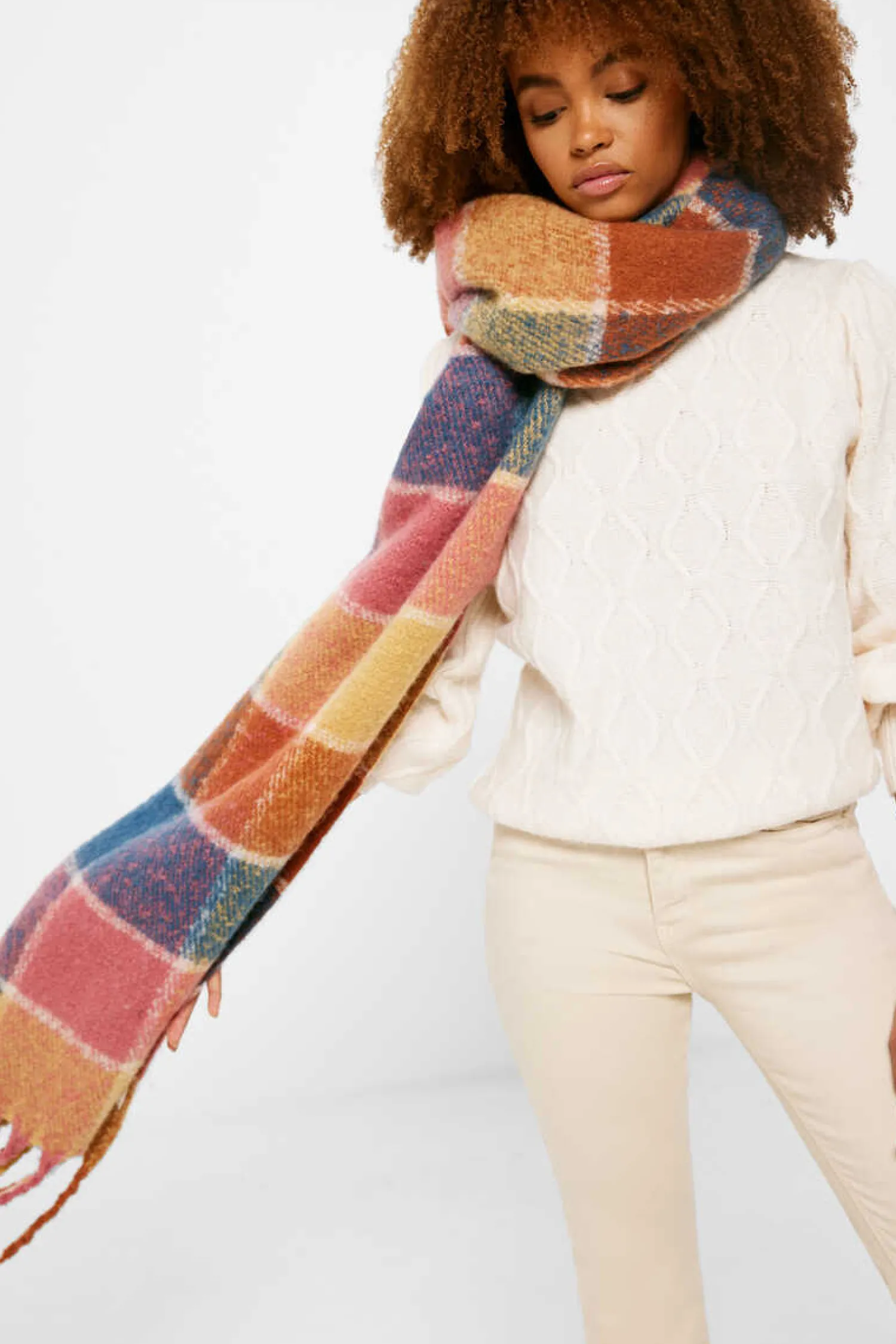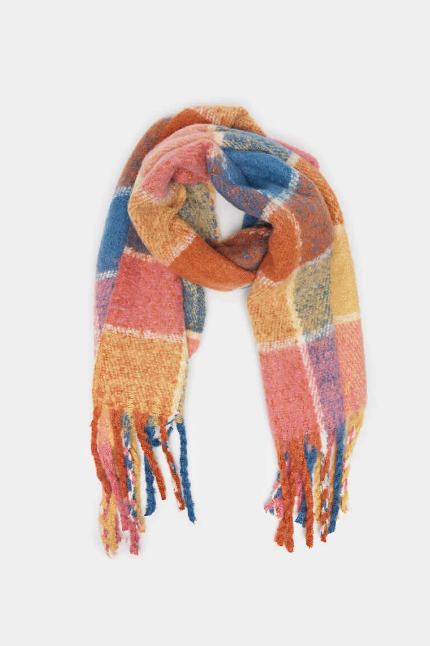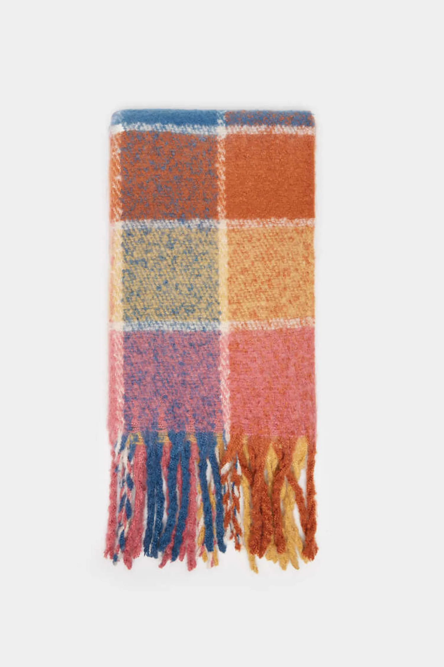 Cachecol Grosso De Quadrados De Cores, Com Detalhe De Franjas Laterais.