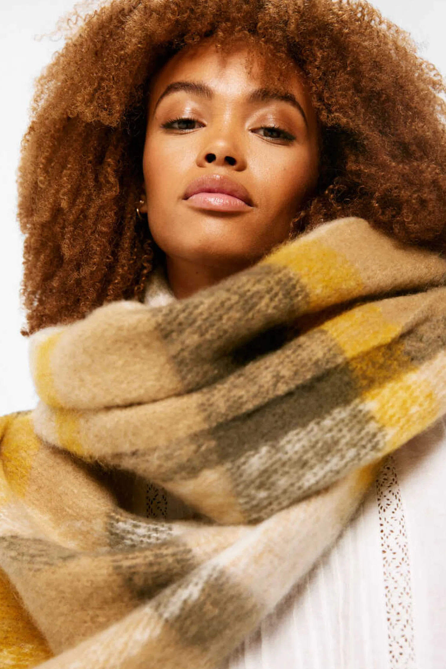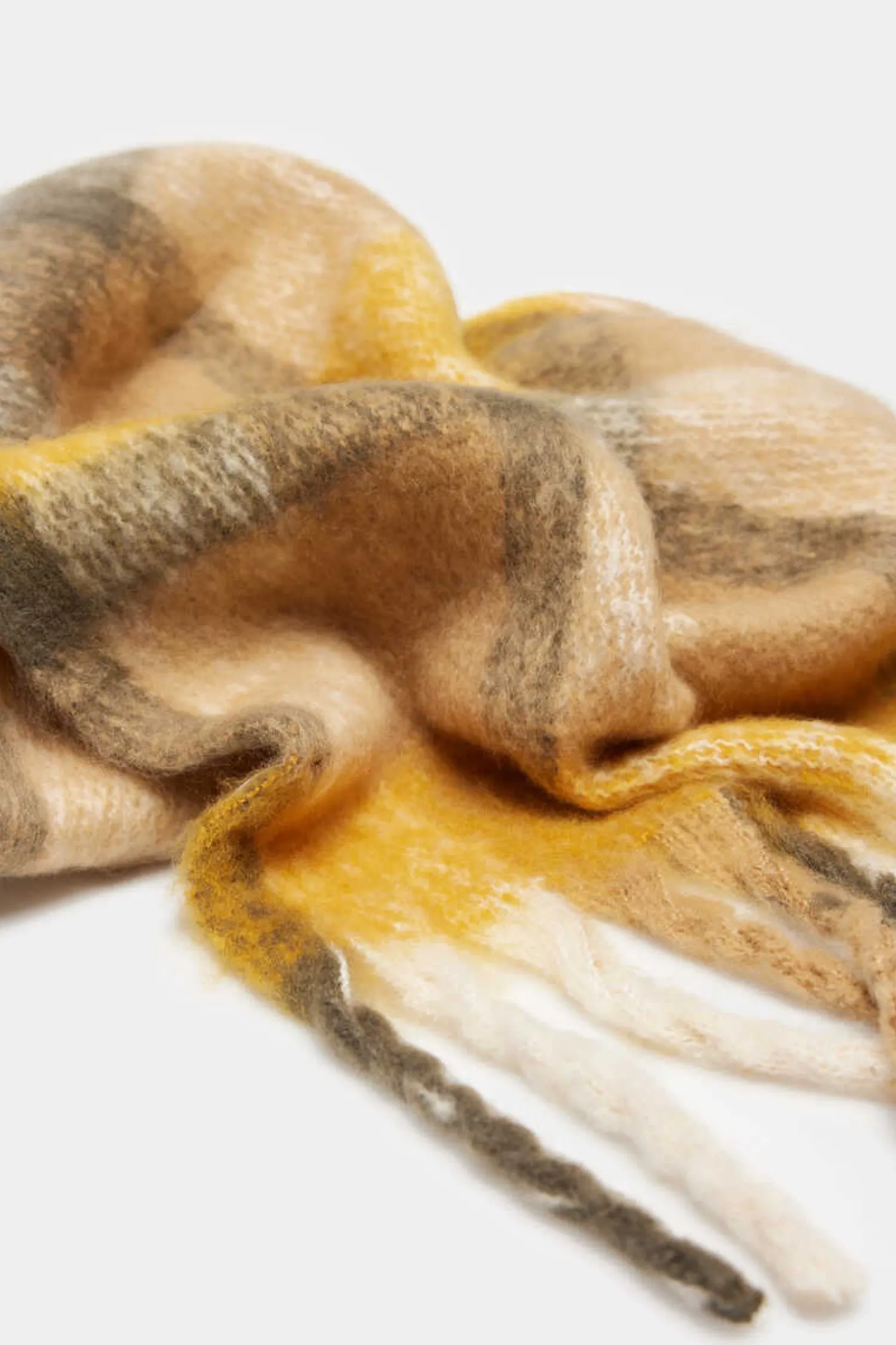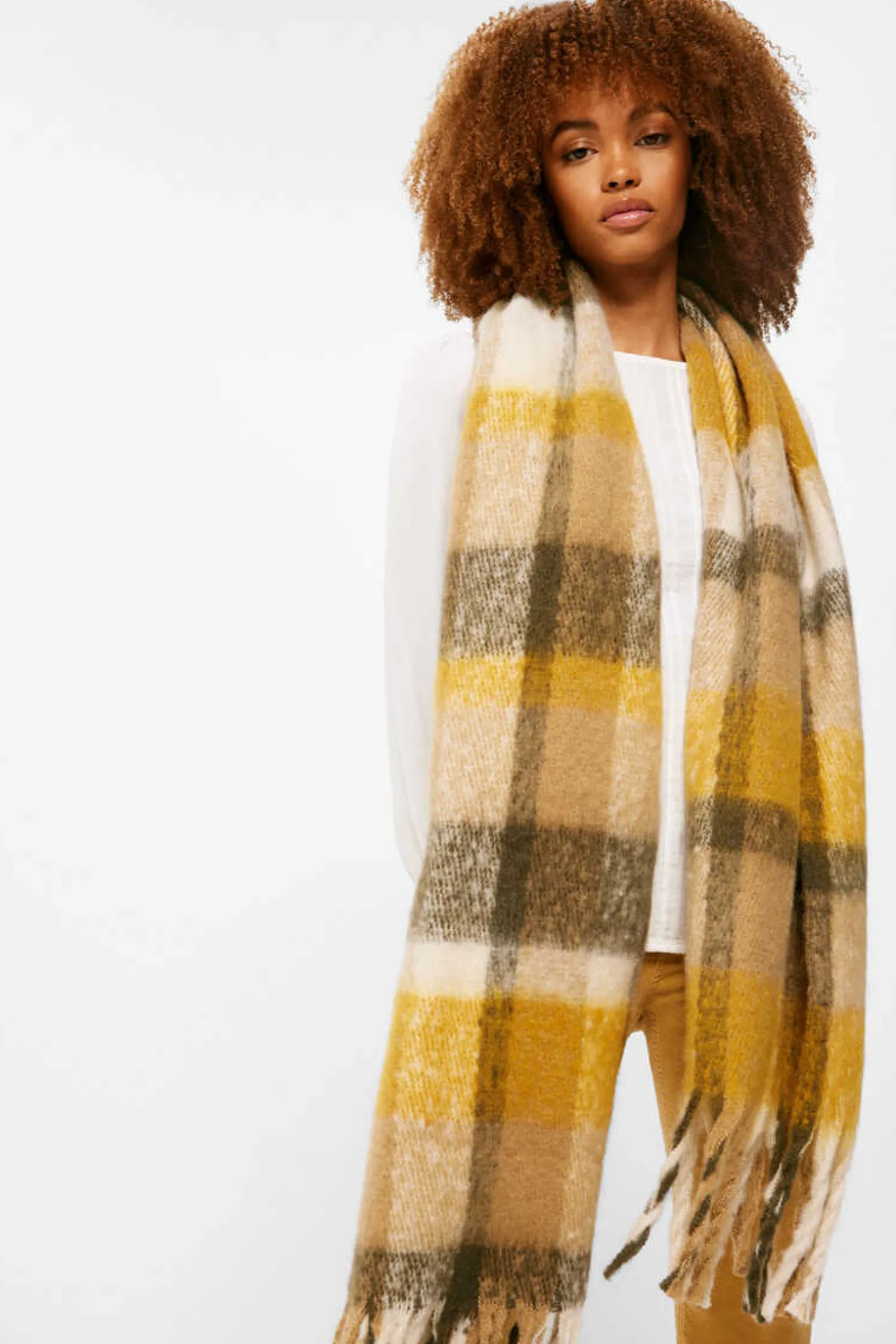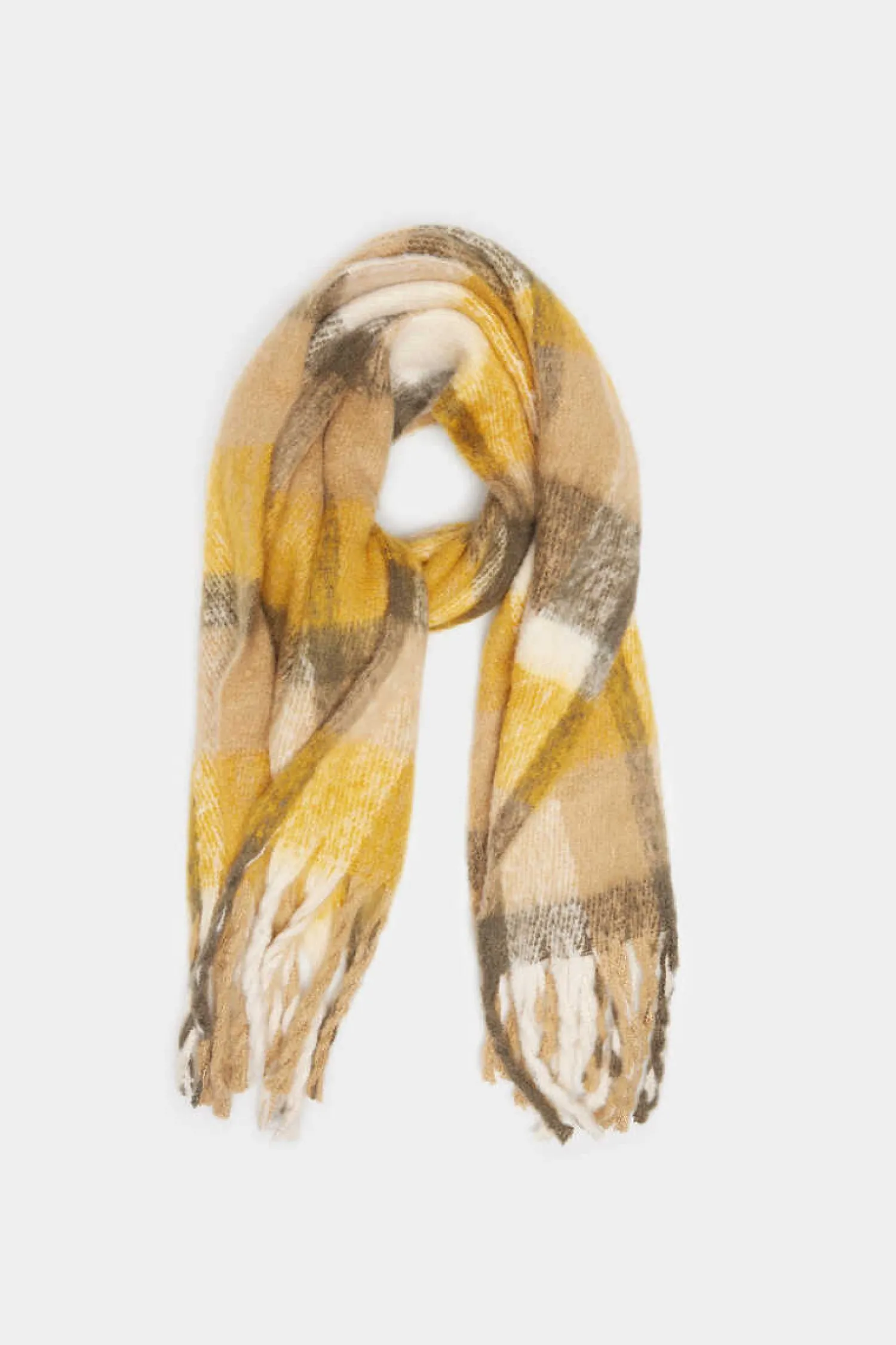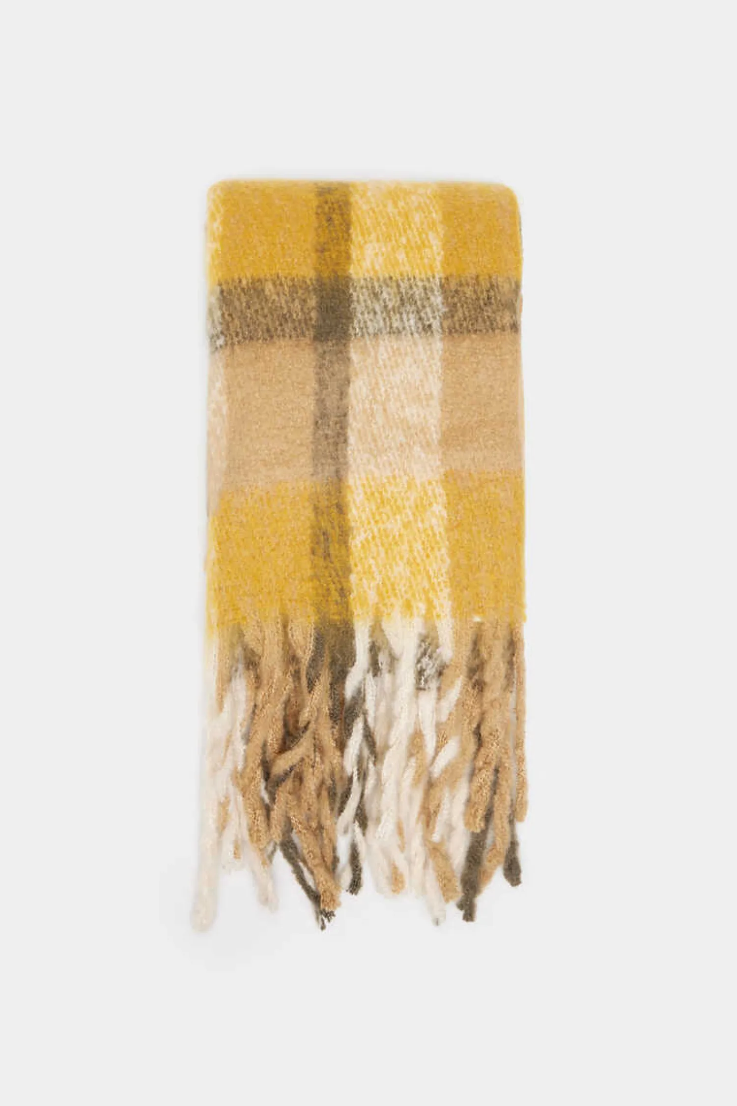 Cachecol Grosso, Com Quadrados Bicolores, Com Detalhe De Franjas Laterais.