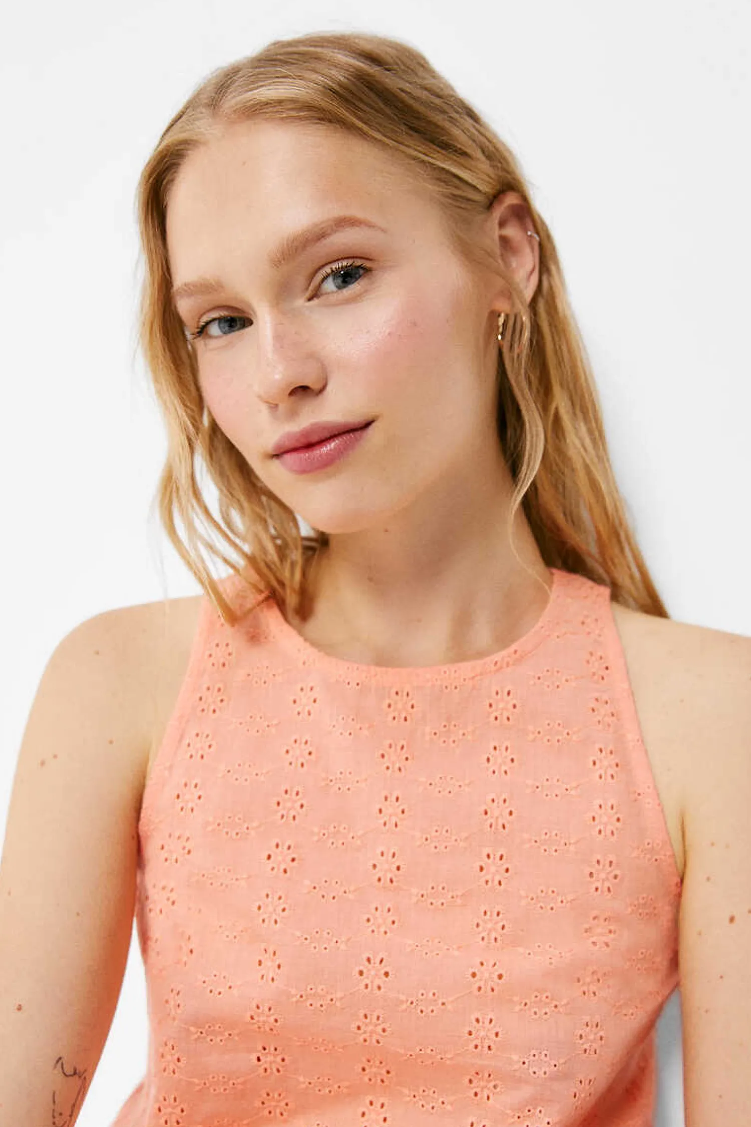 Blusa Sem Mangas, Com Gola Redonda, Abertura Em Forma De Lagrima Com Fecho De Botao Nas Costas, Detalhe De Bordado Suico Na Frente.