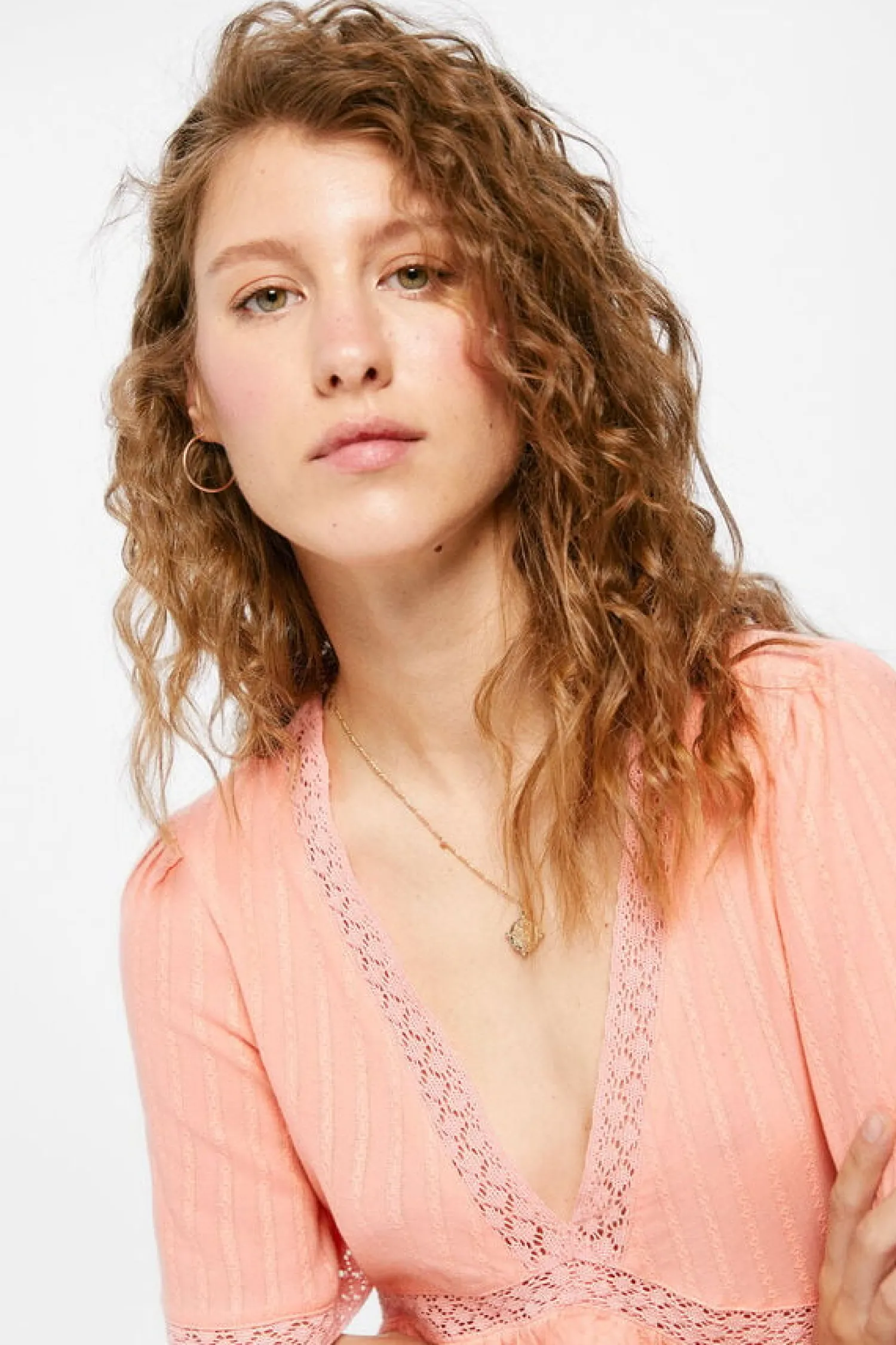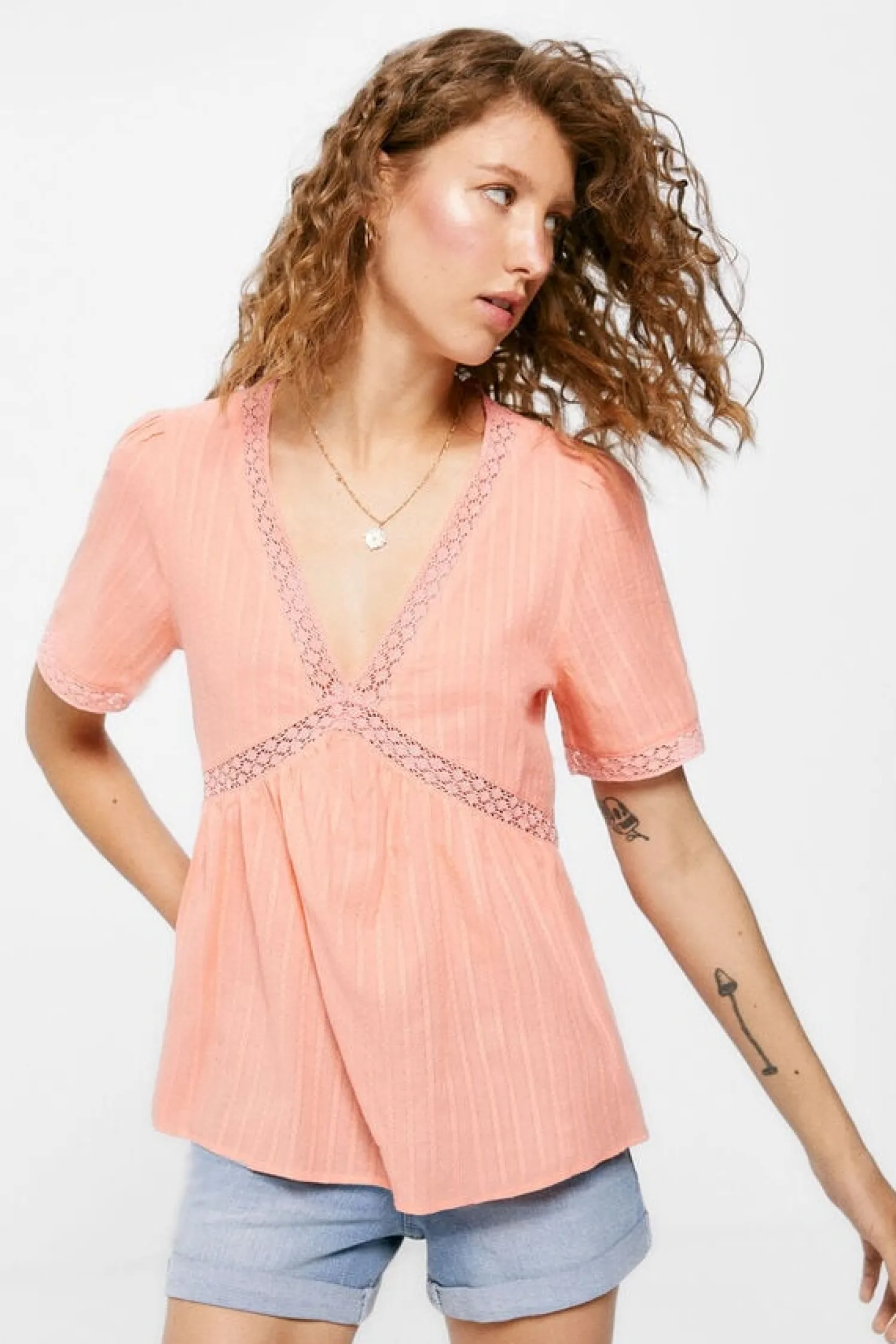 Blusa De Manga Curta Boca De Sino, Com Decote Em V, Detalhes De Fitas De Lace No Decote Por Baixo Do Peito E Nas Mangas, Com Corpo Com Volume.