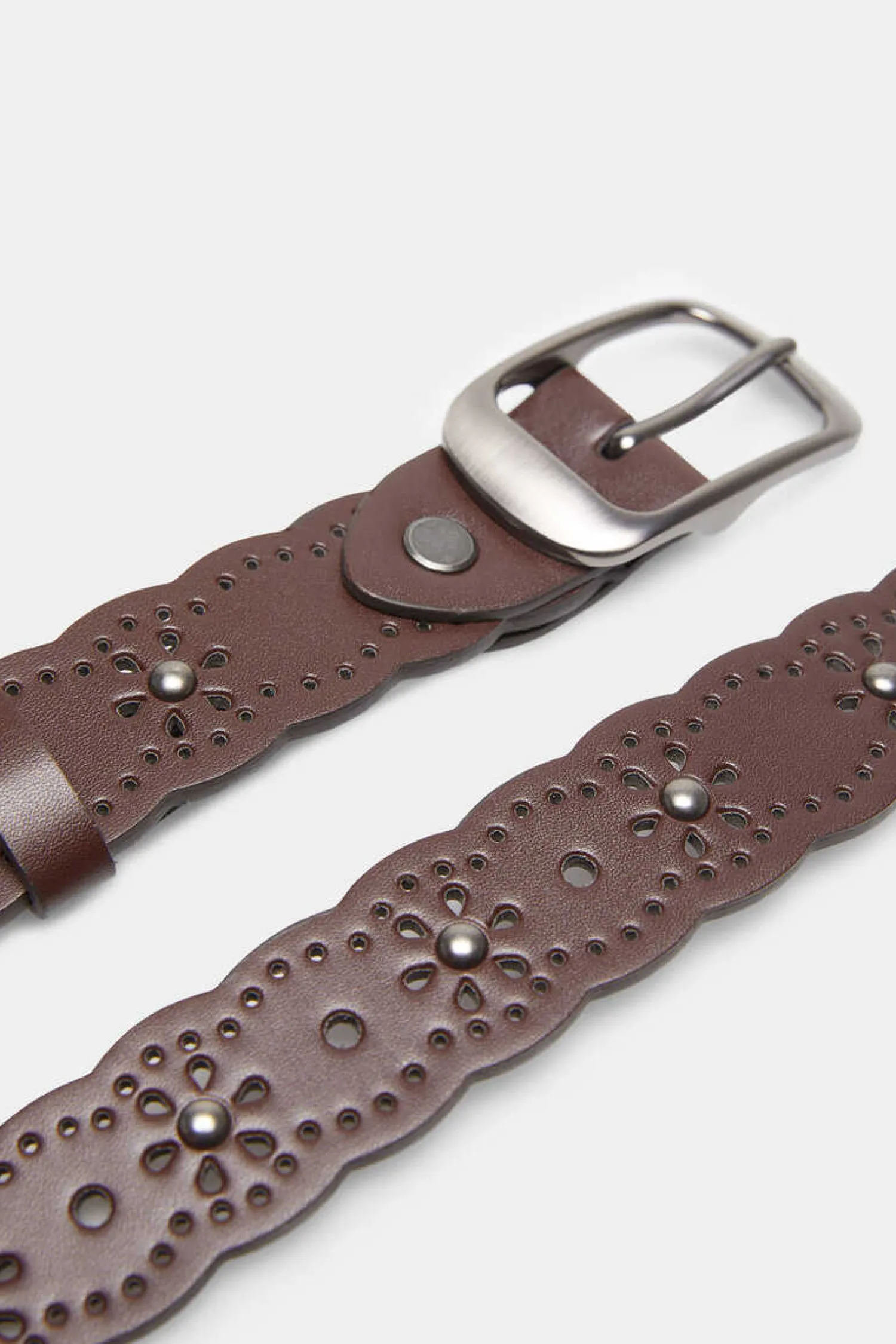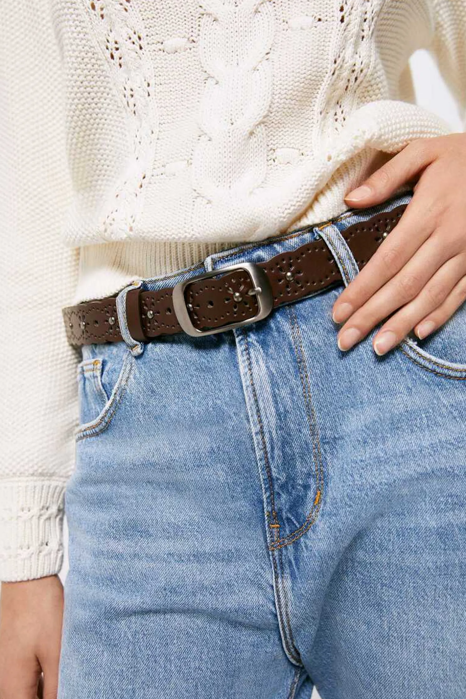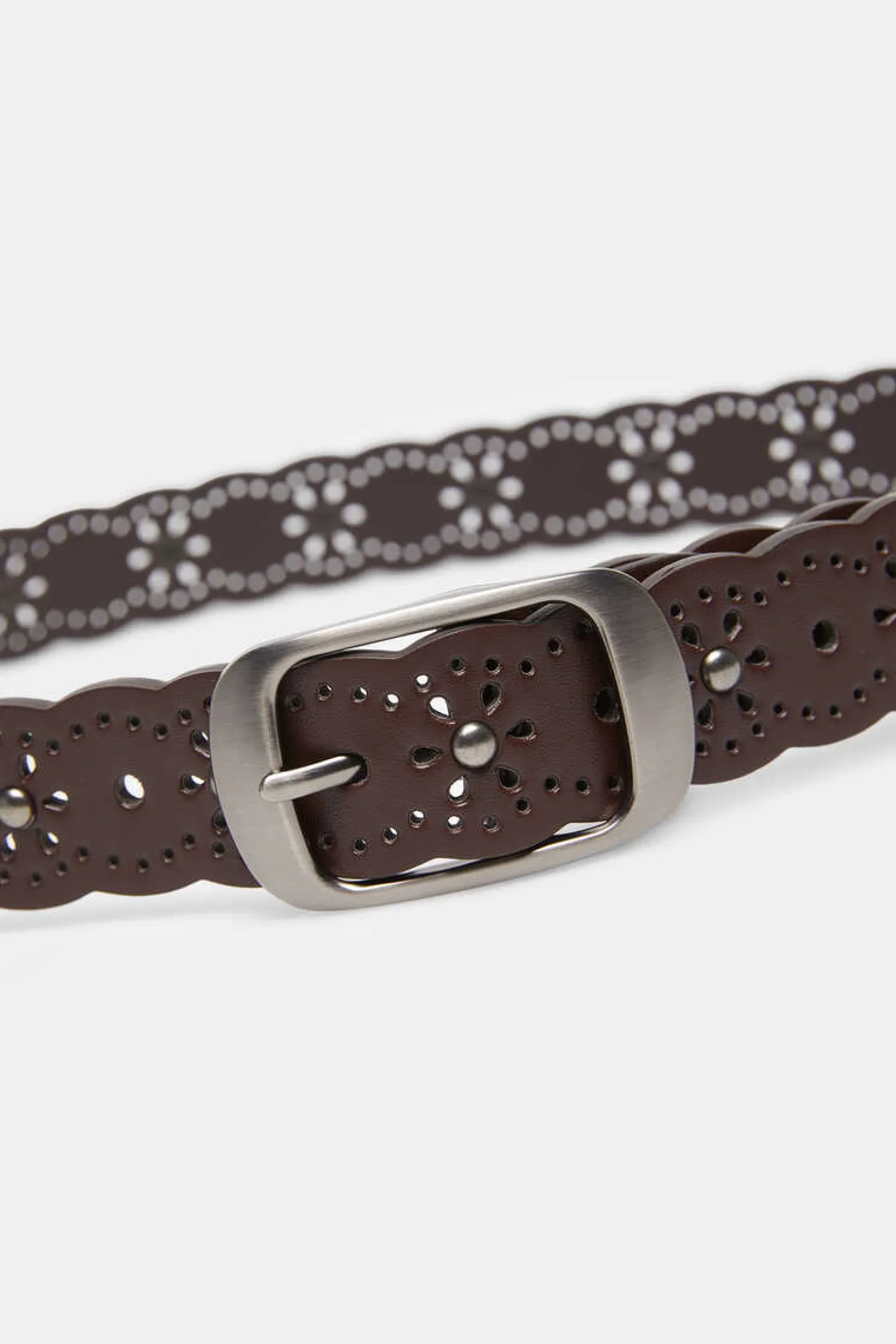 Cinto Com Perfurados Em Forma De Flor E Detalhe De Pedras Azuis No Centro, Com Fivela Metalica Quadrada.