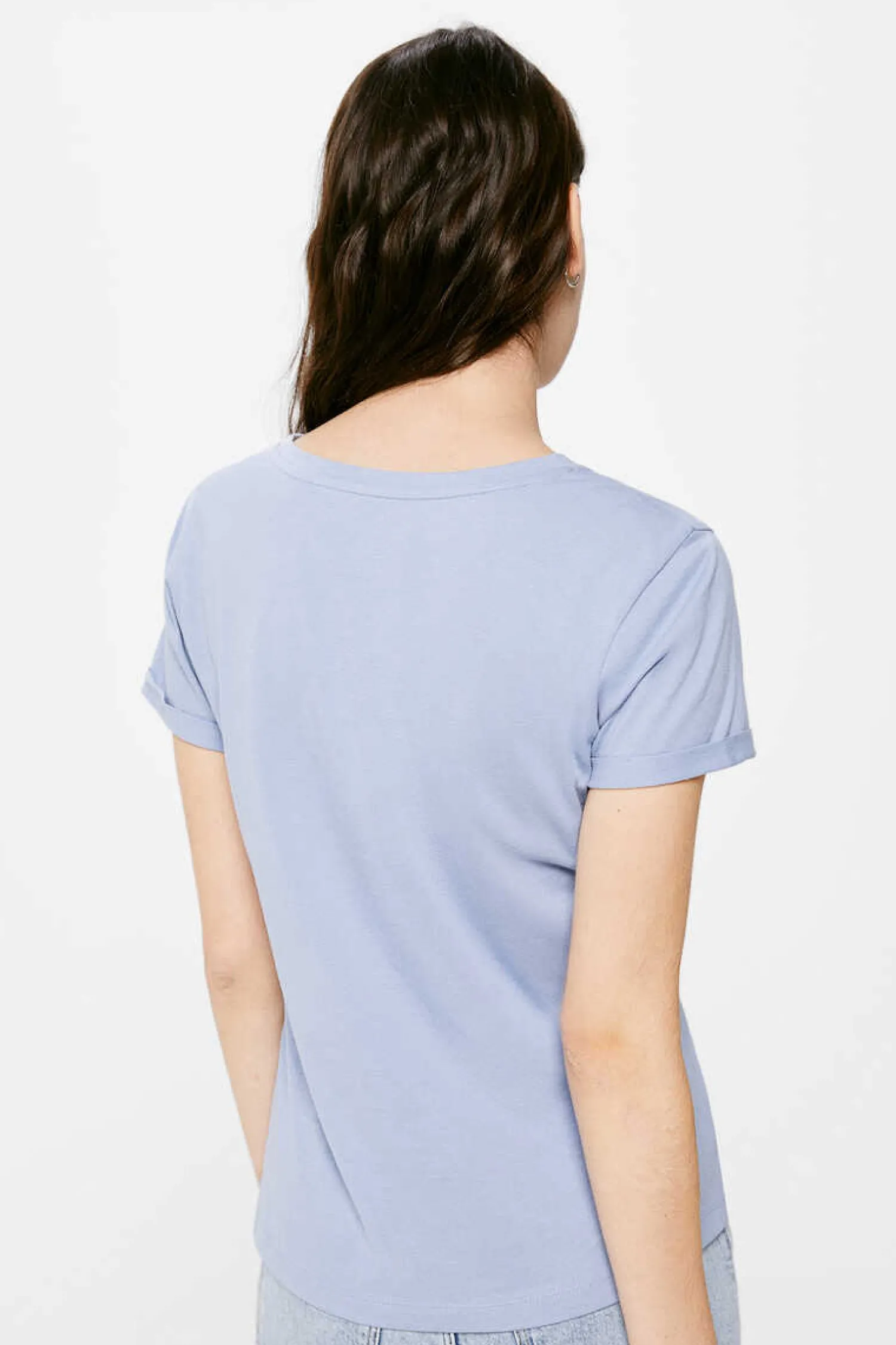 T-Shirt De Gola Redonda, Com Estampagem Grafica Posicional De Desenho E Texto A Frente.