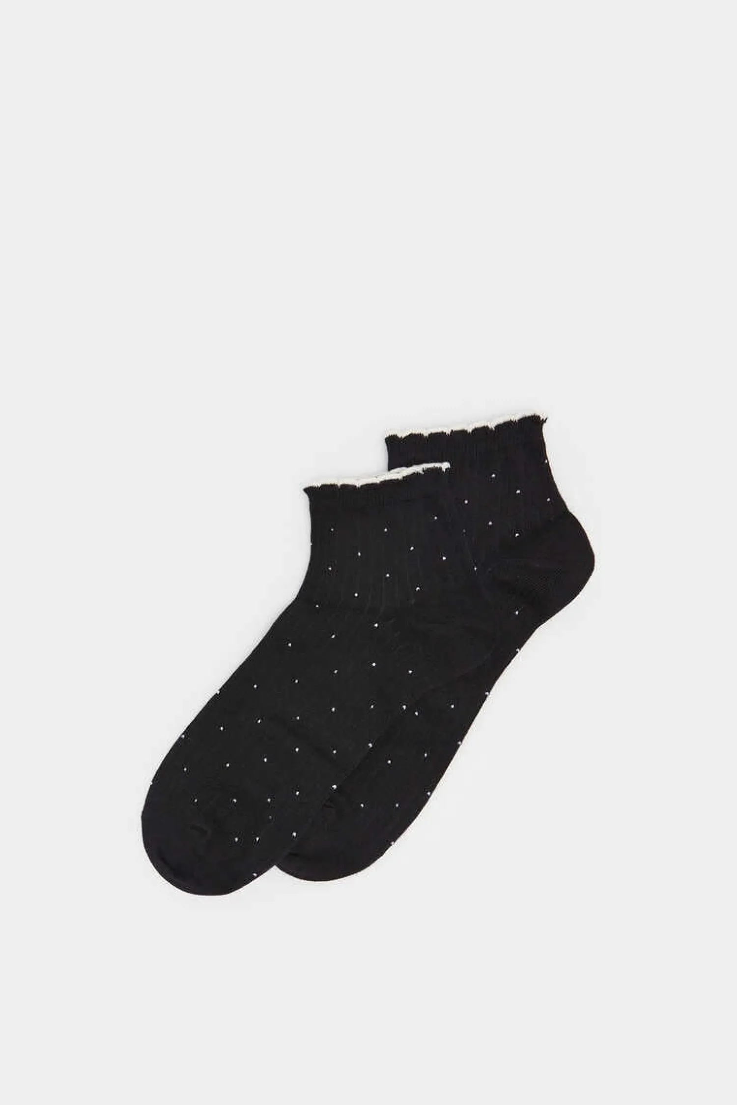 Meia Curta Com Canelado, Com Bolinhas, Com Mini Folhos Nos Canos E Com Contraste De Cor.
