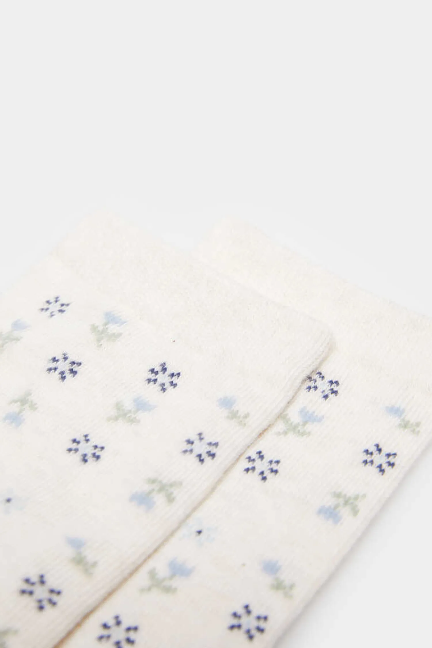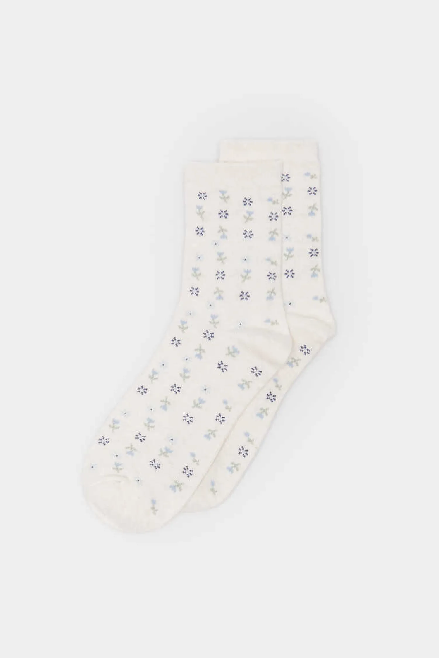 Meia Comprida, Com Desenho De Mini Flores Em Tons Azuis, Com Biqueira, Calcanhar E Cano Lisos.
