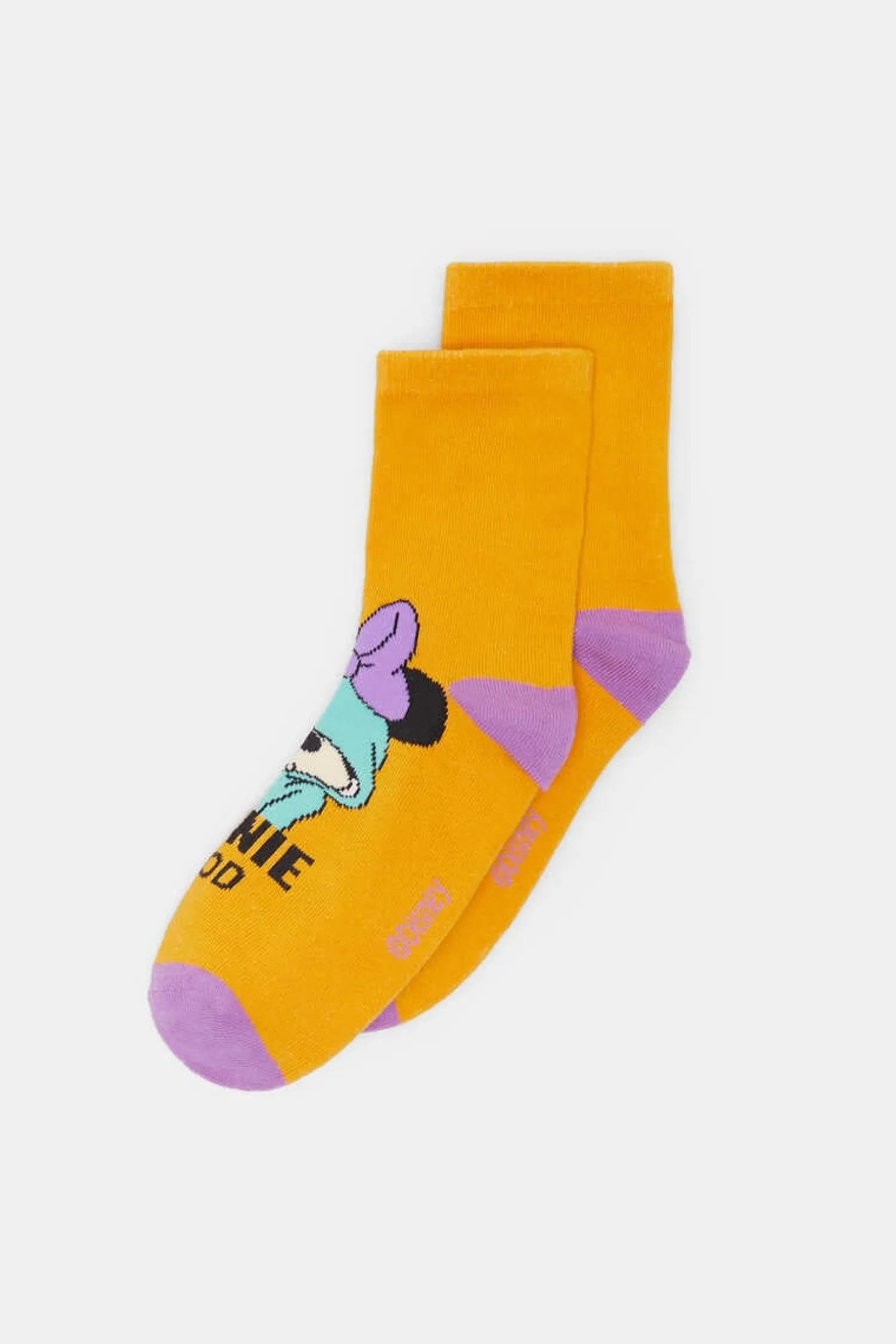Meia Comprida Lisa Com Desenho Da Minnie Com Texto Na Frente, Com Biqueira E Calcanhar Em Contraste De Cor.