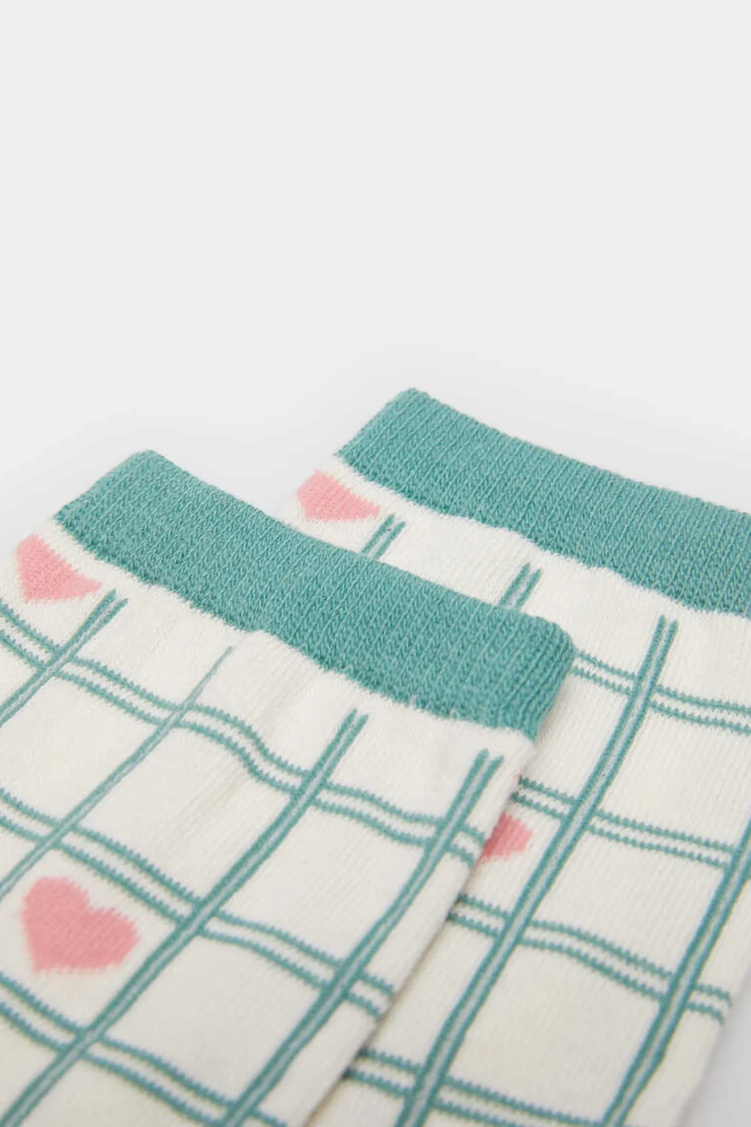 Meia Comprida, Com Desenho De Quadros Com Coracoes No Interior, Com Biqueira, Calcanhar E Canos Com Contraste De Cores.