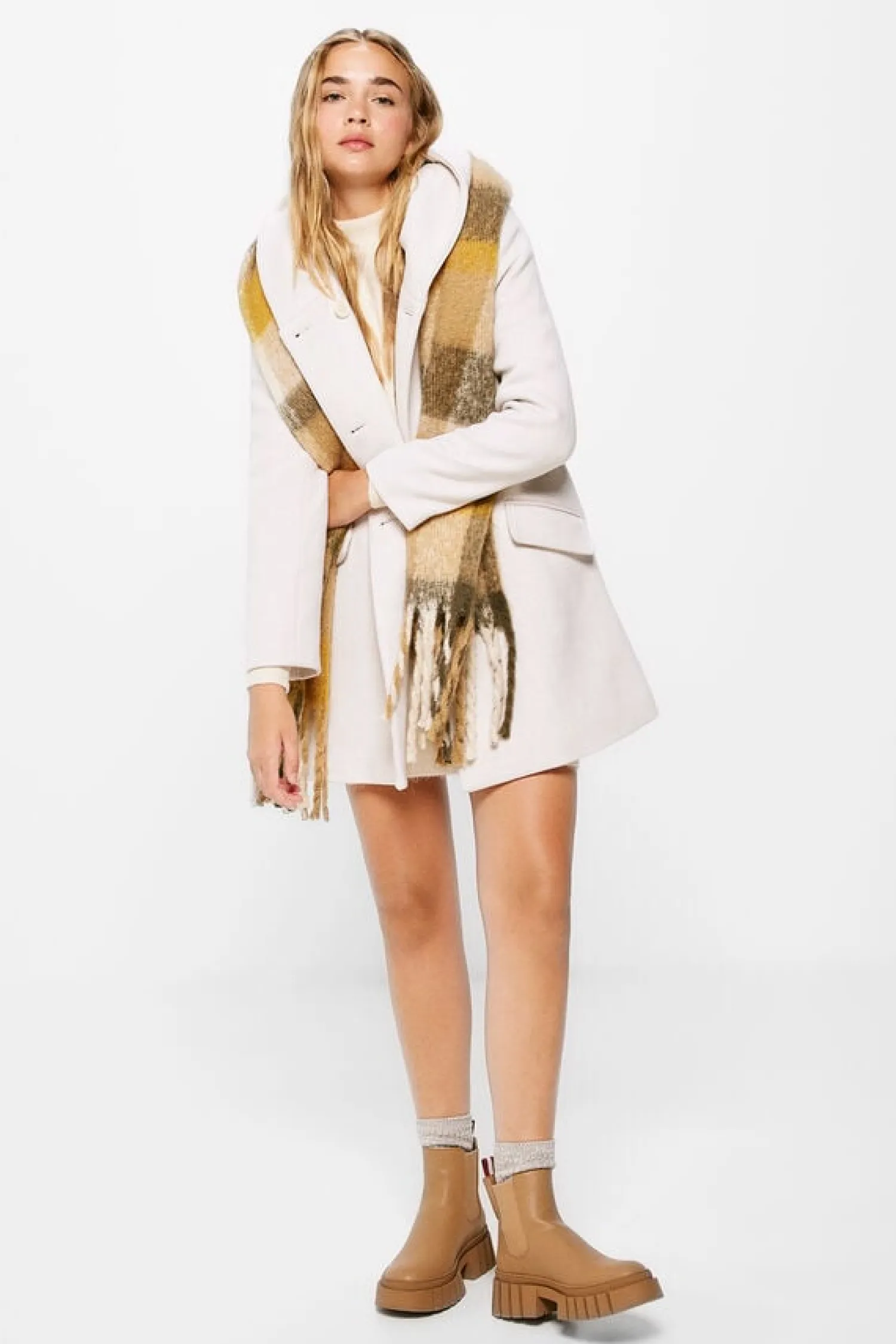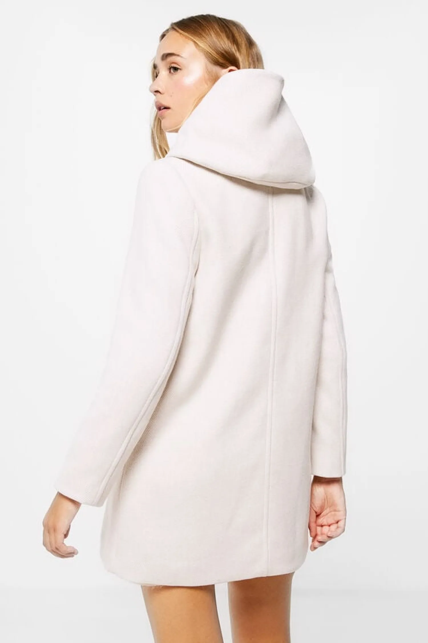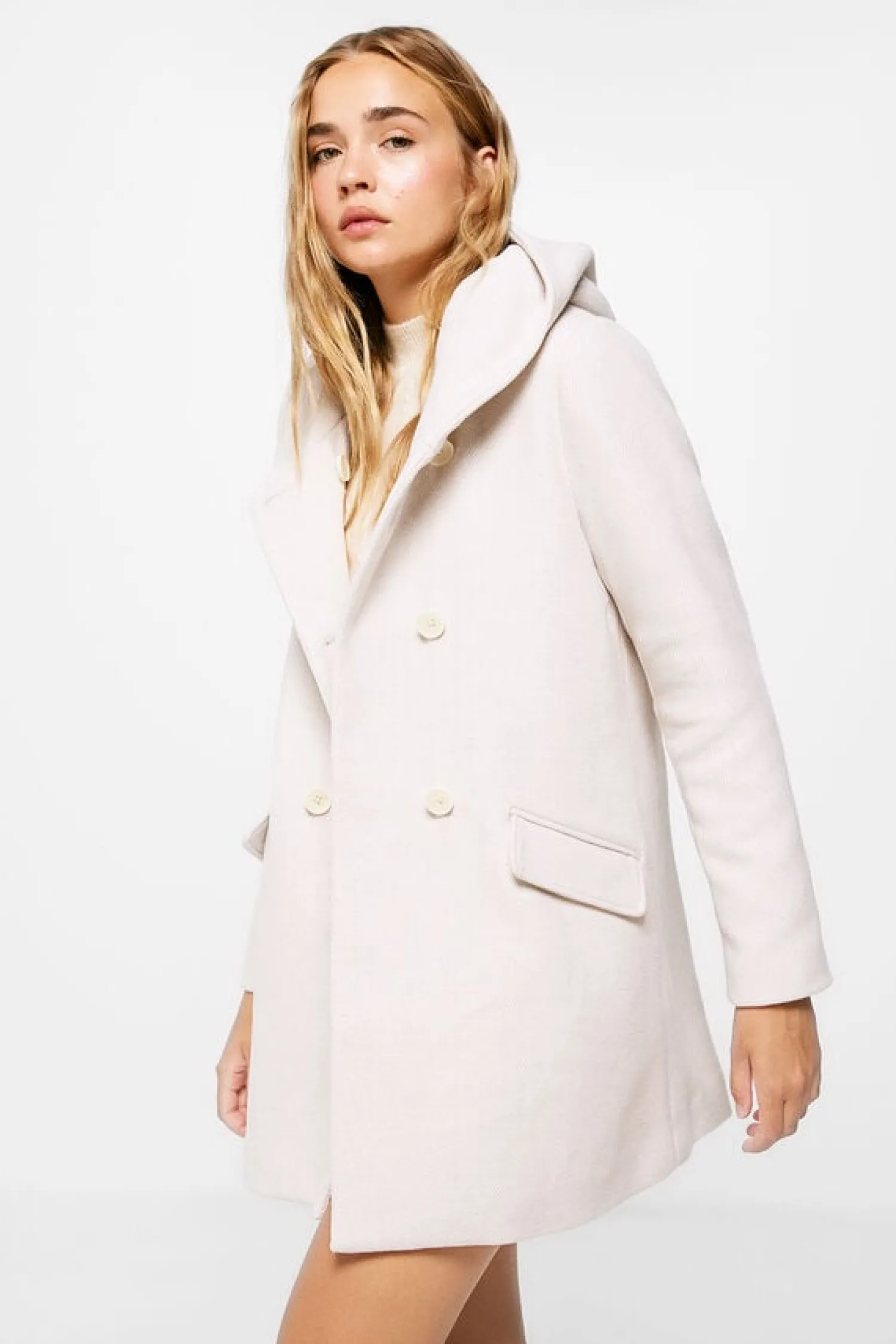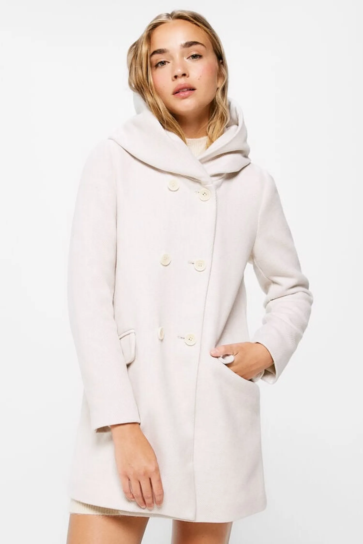 Sobretudo Medio De Linha “A” Com Capuz, Com Bolsos Laterais, Com Dupla Abotonadura Na Frente E Com Forro Interior.