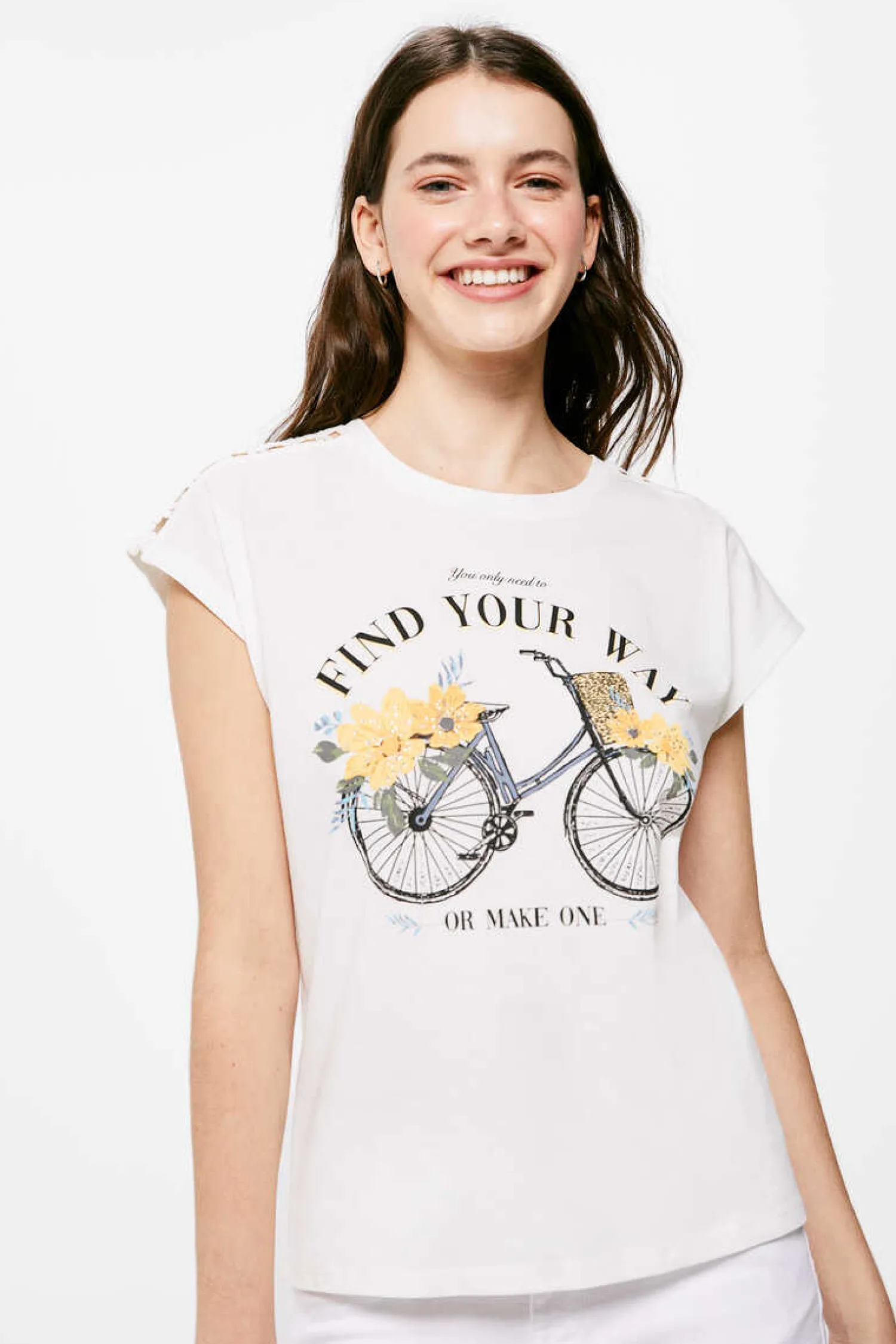 T-Shirt De Manga Curta Descaida, Com Gola Redonda, Detalhe De Laco Nos Ombros, Estampagem Grafica Posicional De Desenho E Texto A Frente.