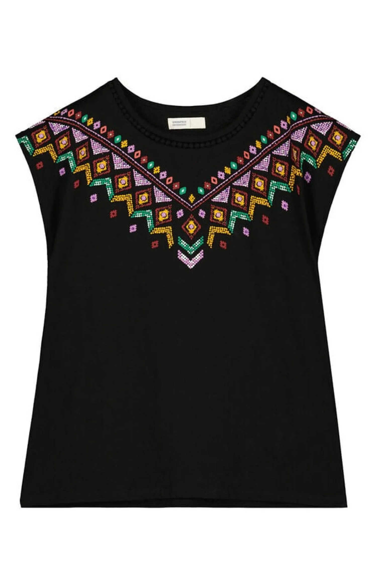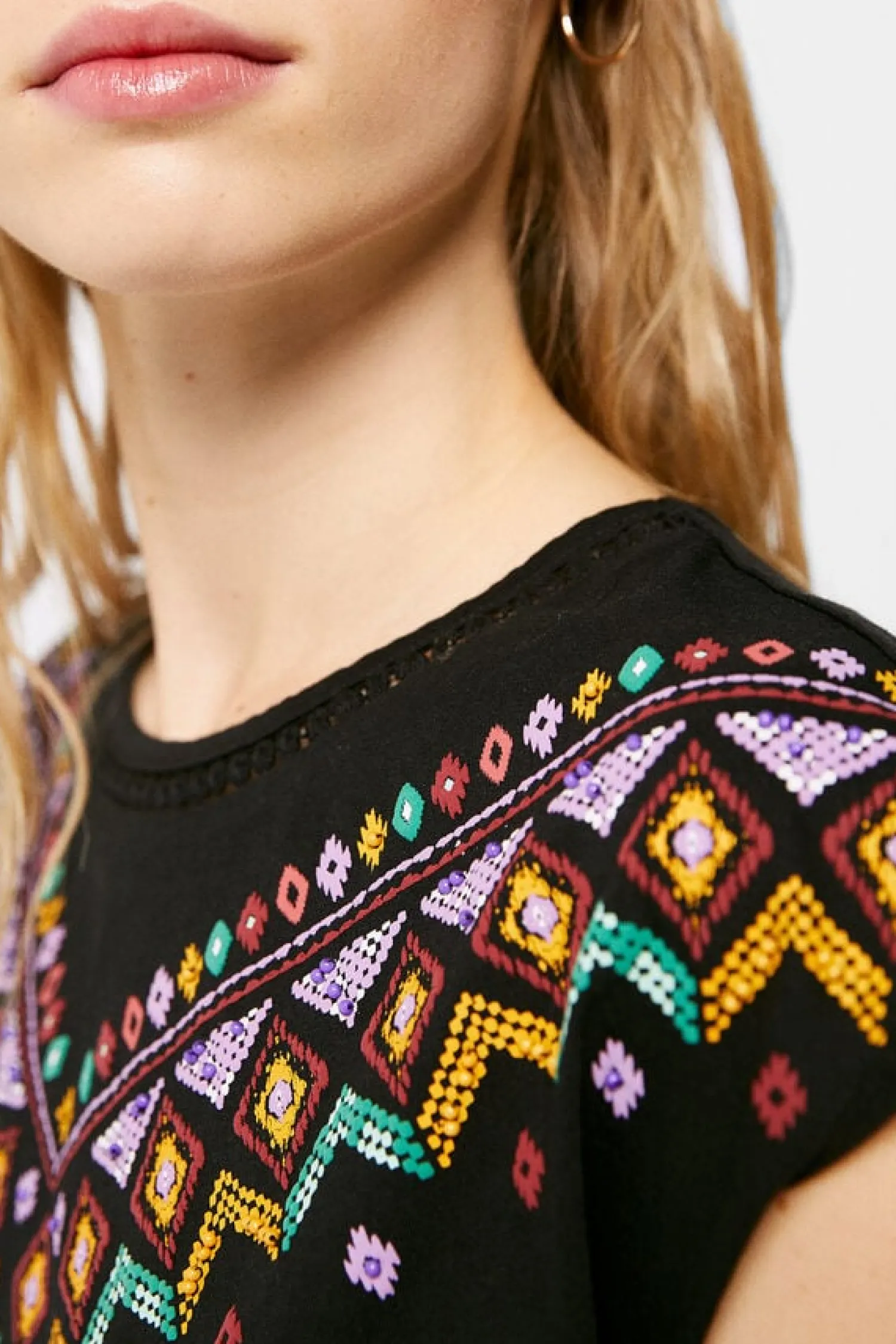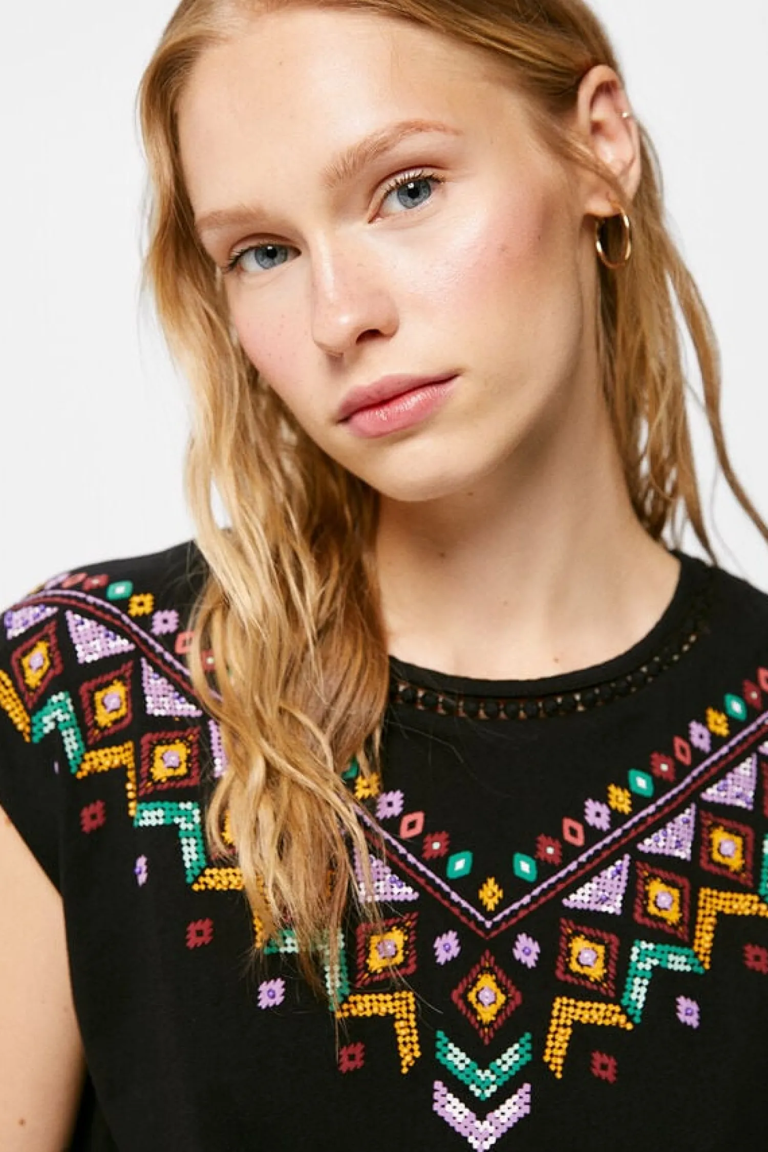 T-Shirt Reta De Manga Curta Descaida, Com Gola Redonda, Com Estampado Grafico Posicional Etnico Com Relevo E Detalhe De Missangas Posicionadas No Corpete, Com L … Ace De Bolinhas Na Gola.Ver Mais