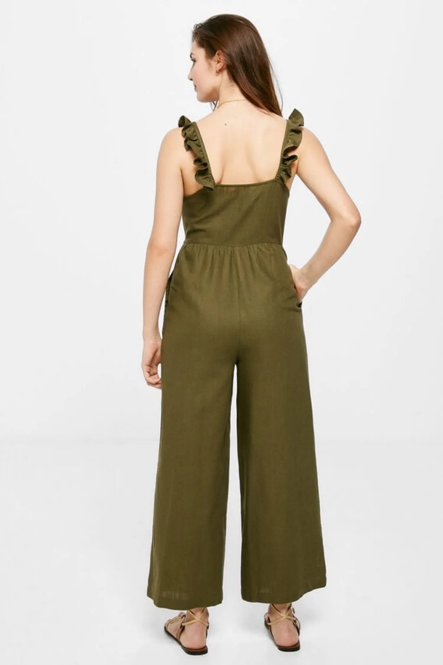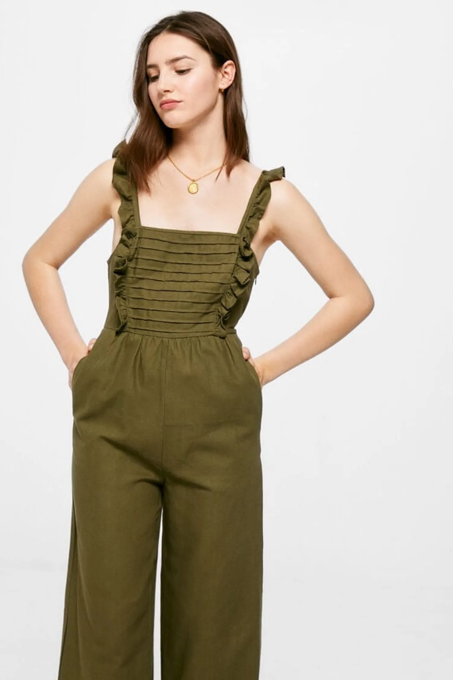 Macacao De Alcas Com Folhos, Com Decote Quadrado Na Frente E Nas Costas, Com Detalhe De Plissados Na Frente, Borracha Na Cintura, Fecho-Eclair Invisivel E Com P … Erna Larga Com Comprimento Pelo Tornozelo.Ver Mais