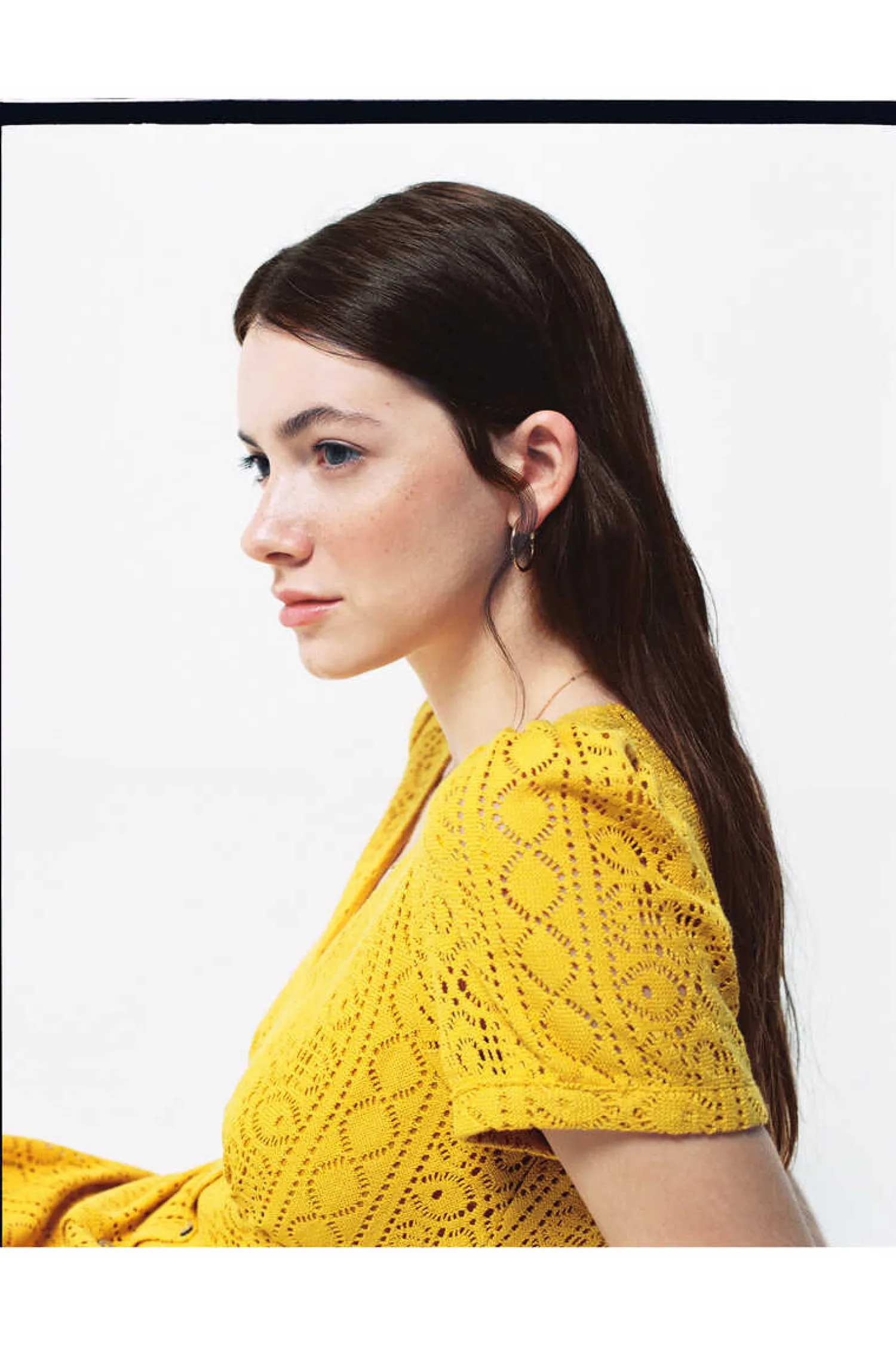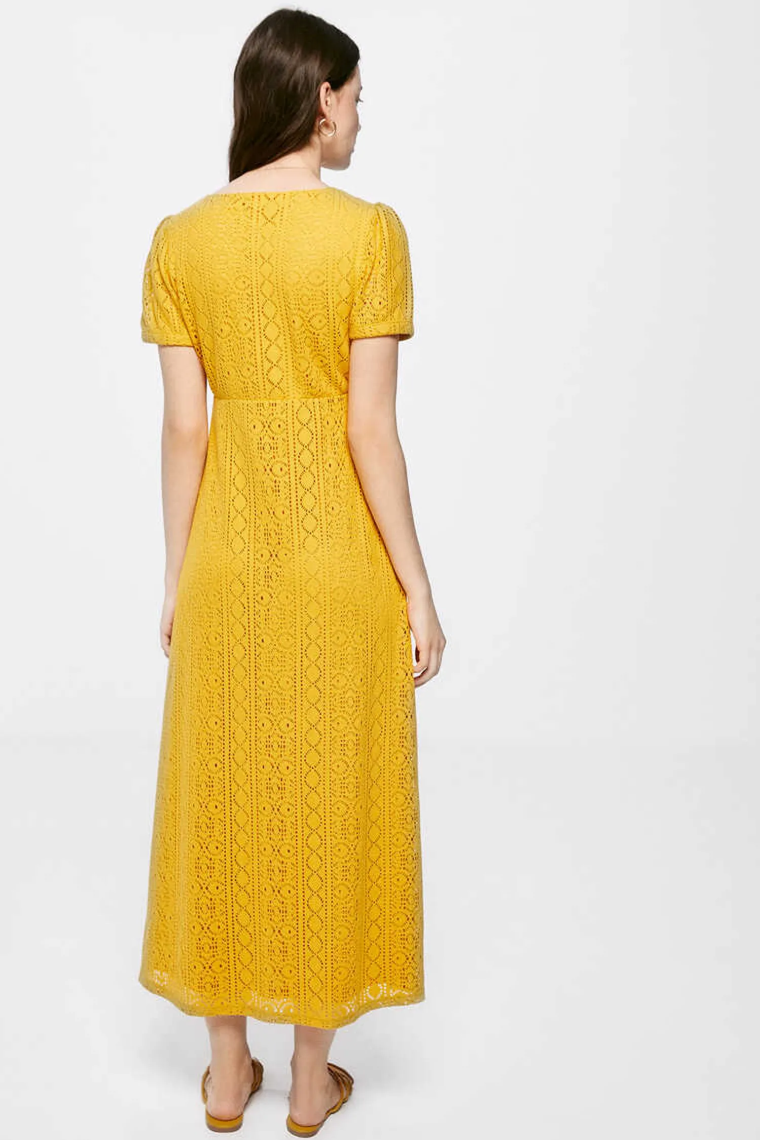 Vestido De Manga Curta, Com Decote Em V, Com Corte Debaixo Do Peito, Com Botoes Na Frente, Com Saia Com Roda E Com Crochet.
