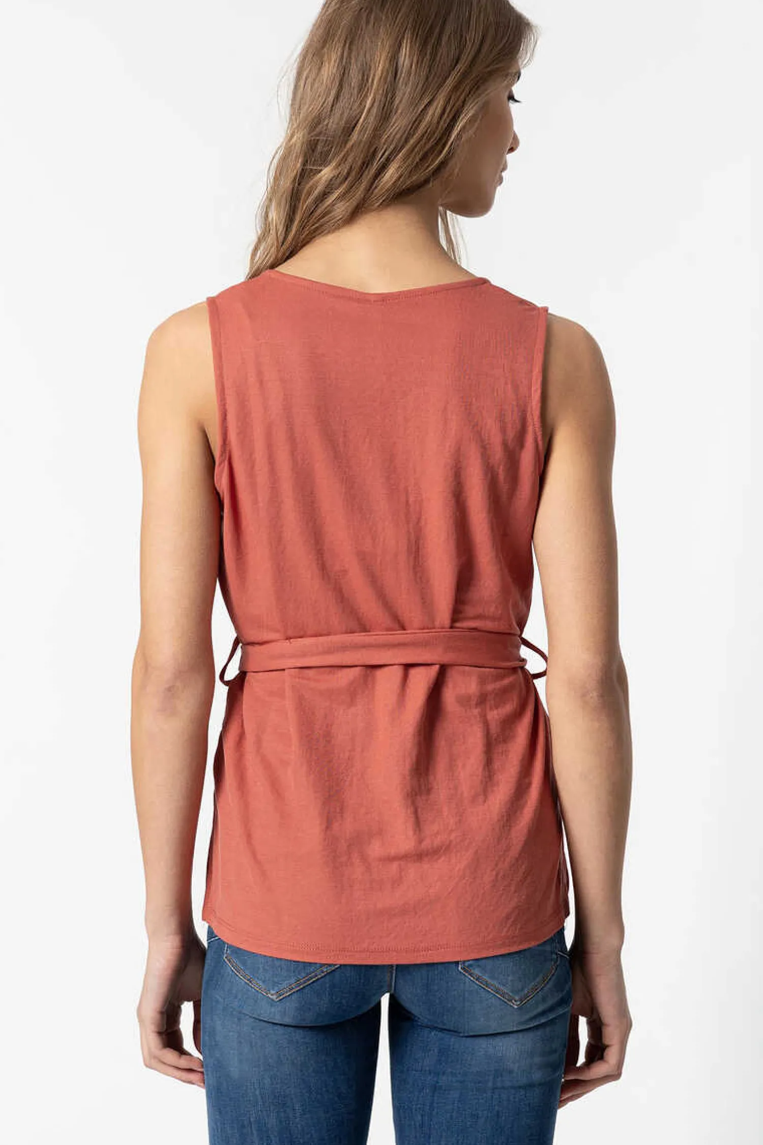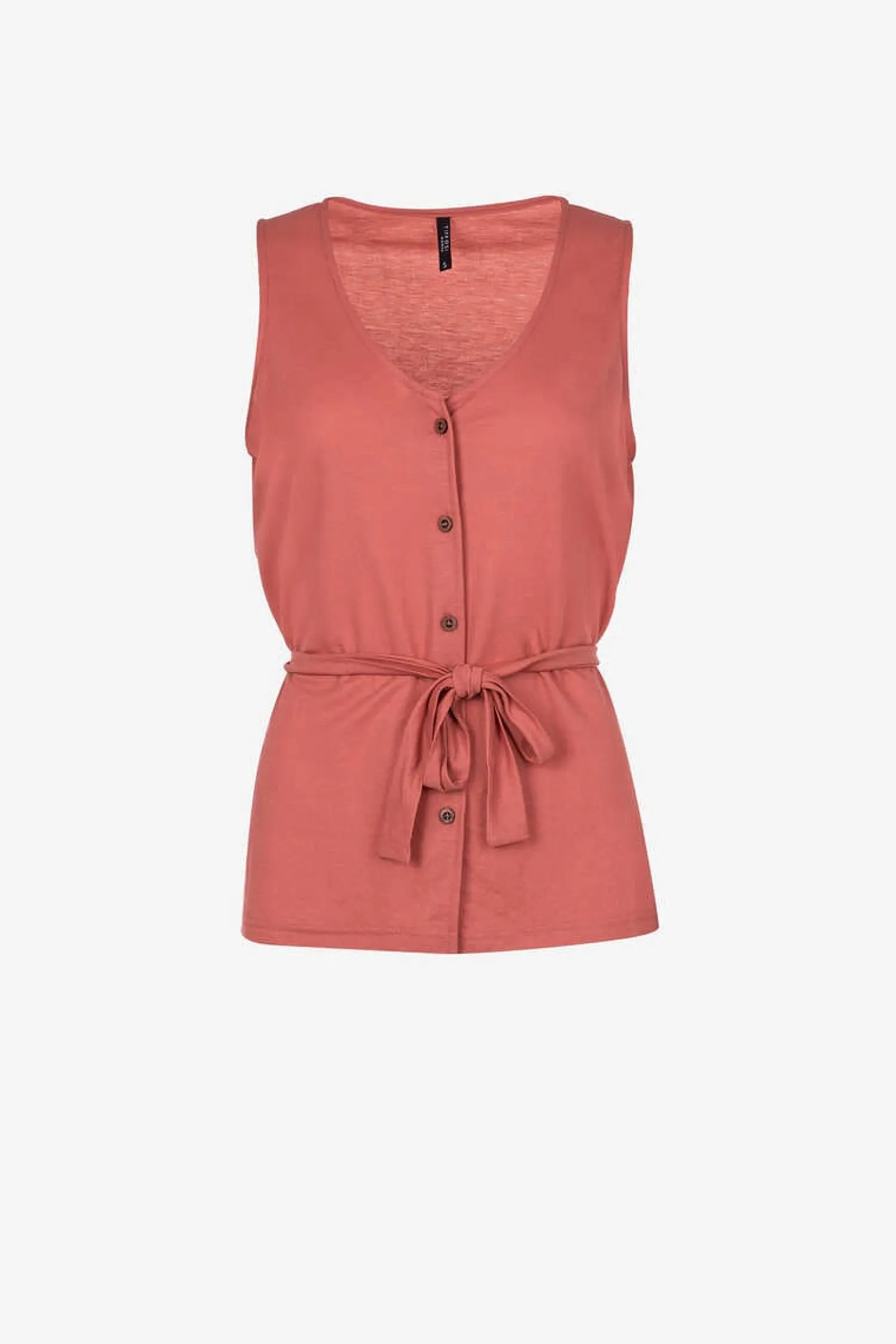 Top Com Decote Em Bico E Manga Cava. Aplicacao De Cinto Do Mesmo Tecido. Fecho Frontal Com Botoes.