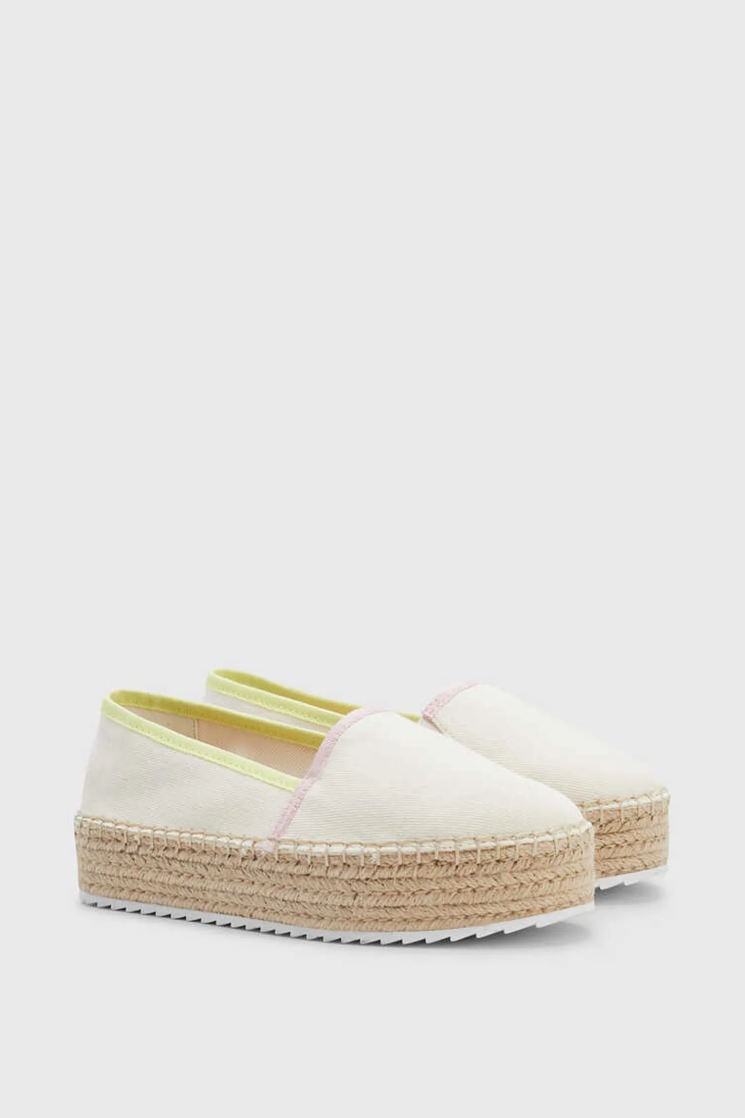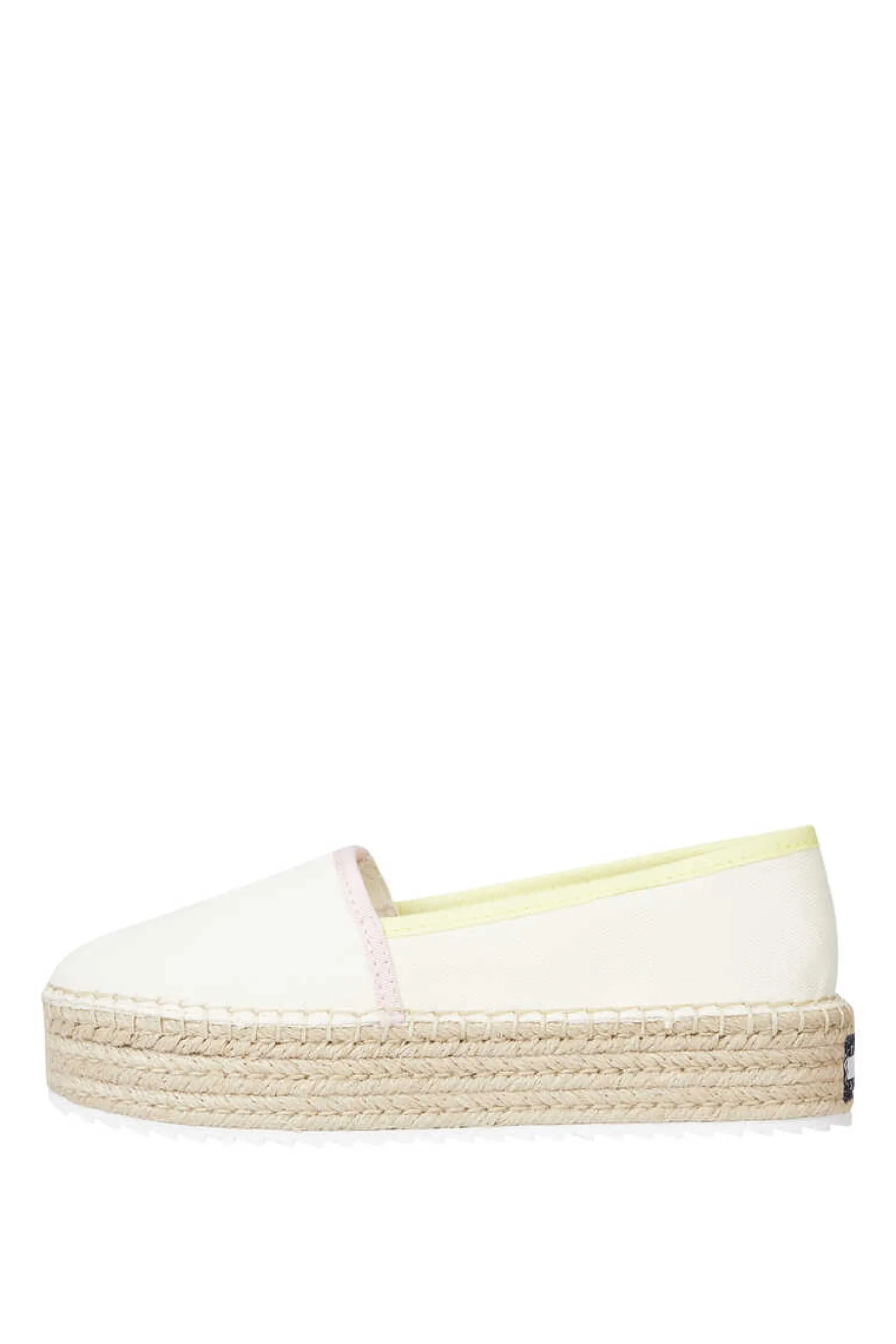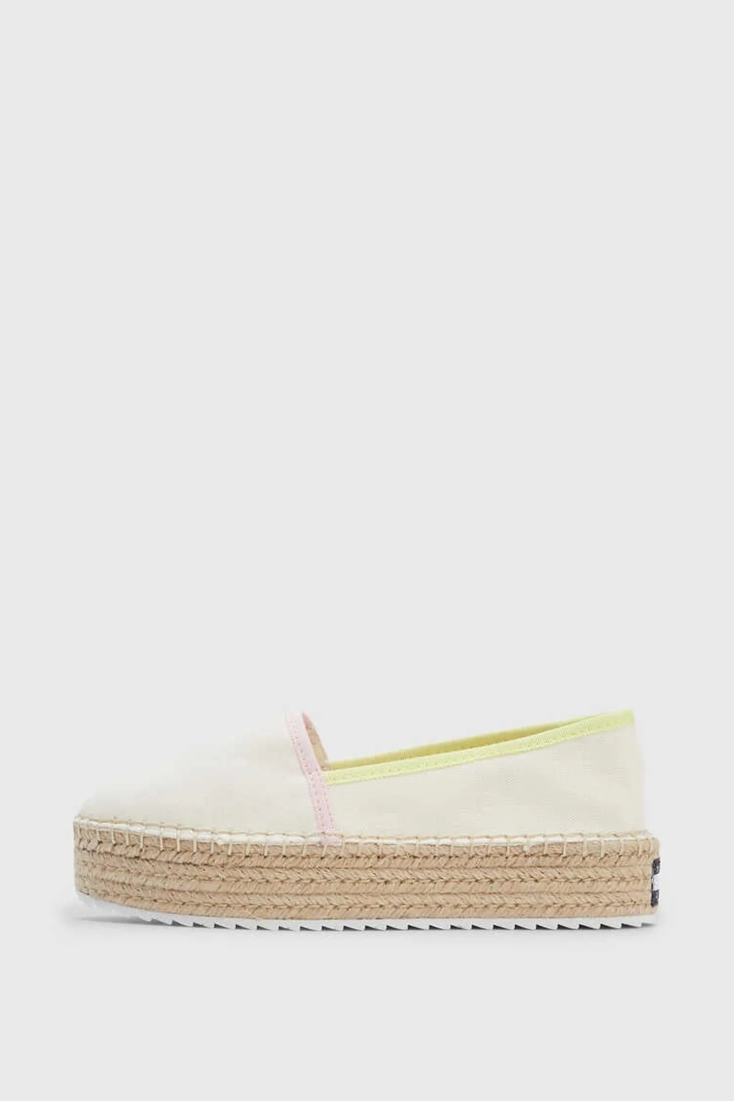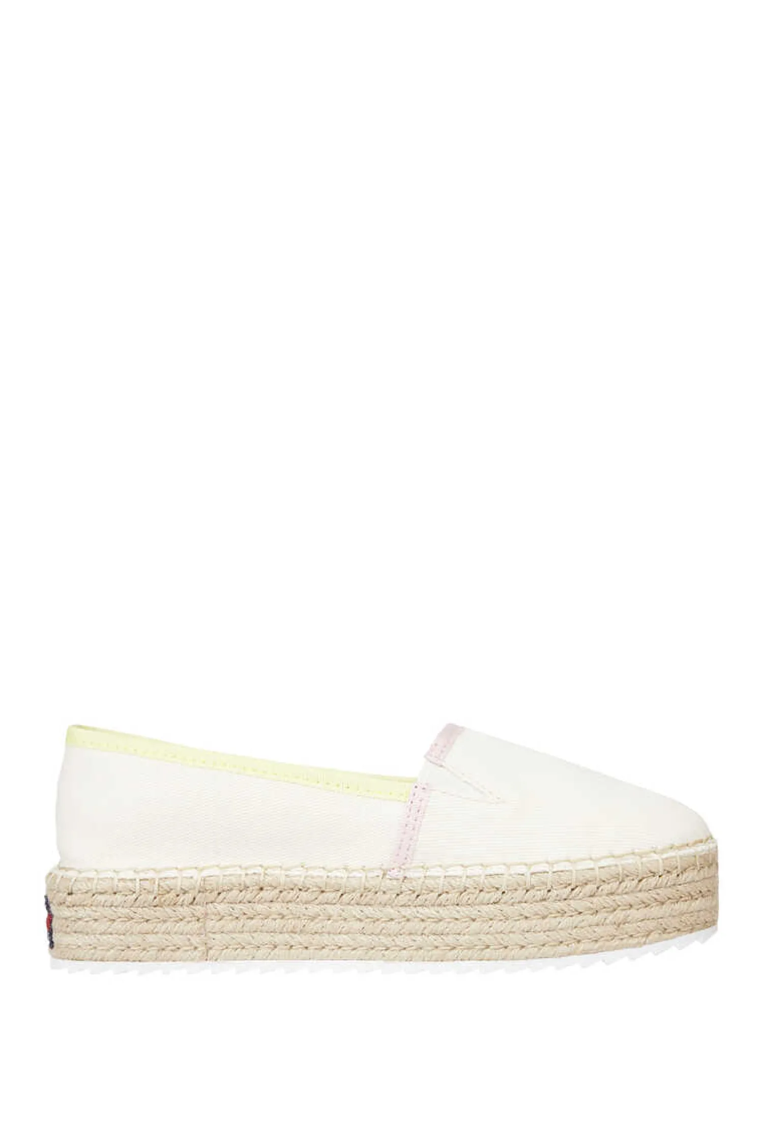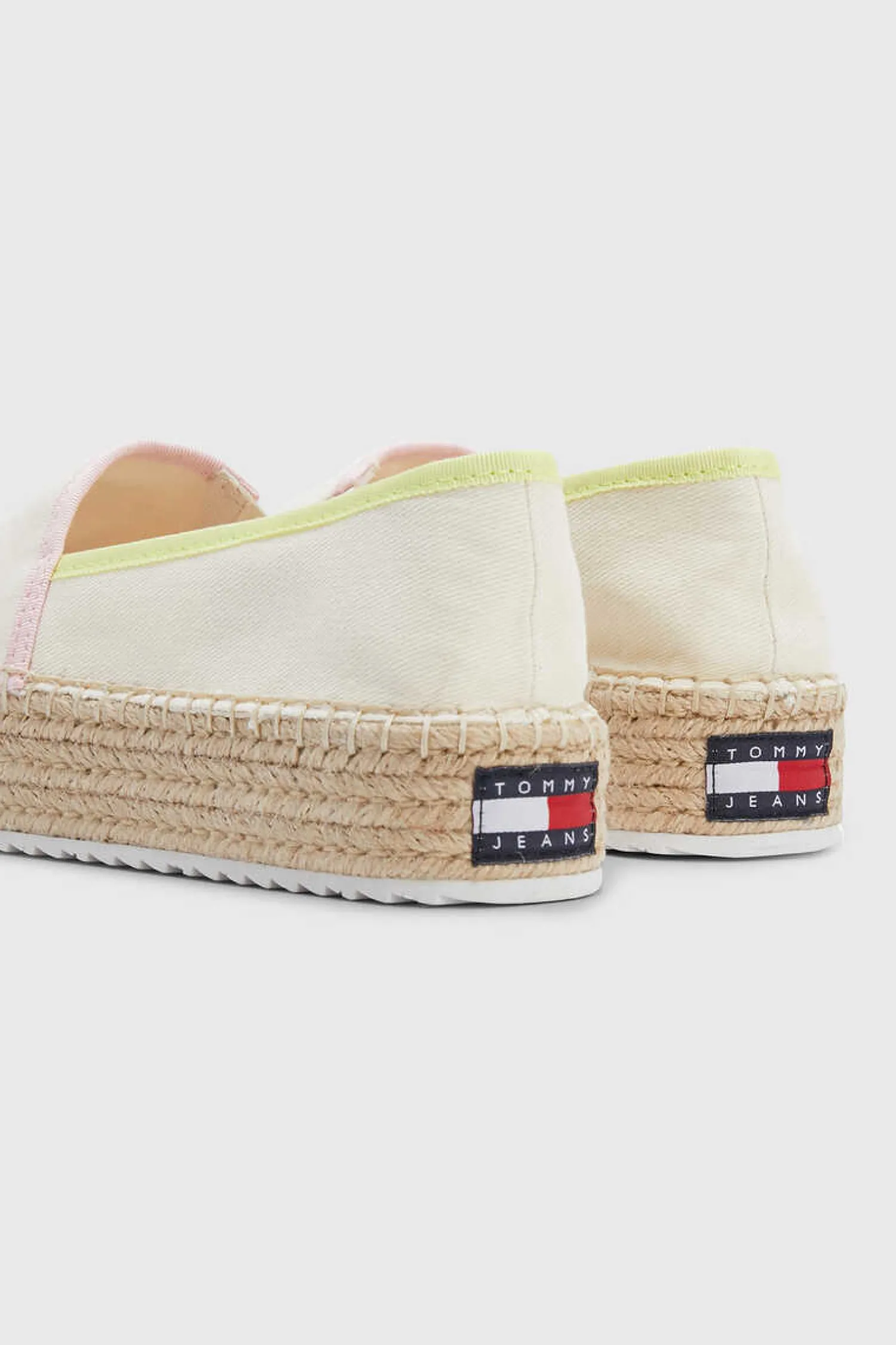 Alpargata Con Plataforma Tommy Jeans En Beige. Detalles En Colores Rosa Y Lima En Las Costuras. Bandera Tommy Jeans Trasera.